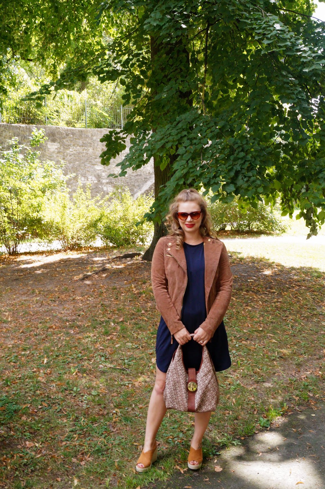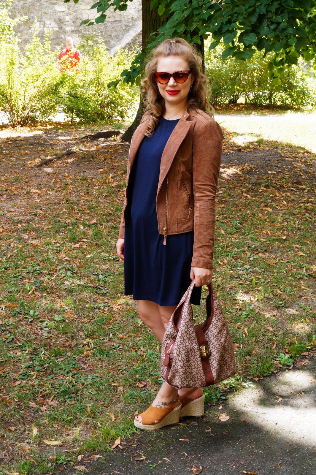 The look above includes my typical fall color combination. I really love dark blue. It reacts much nicer to my skin tone than black and I think it looks gorgeous styled with a tan hue. Over the last view years – since the color started to get this popular – I built quite the selection of pieces in this color range and I love to combine them and wear them. The color really pops with red and looks super exquisite with black and ultra modern with white.