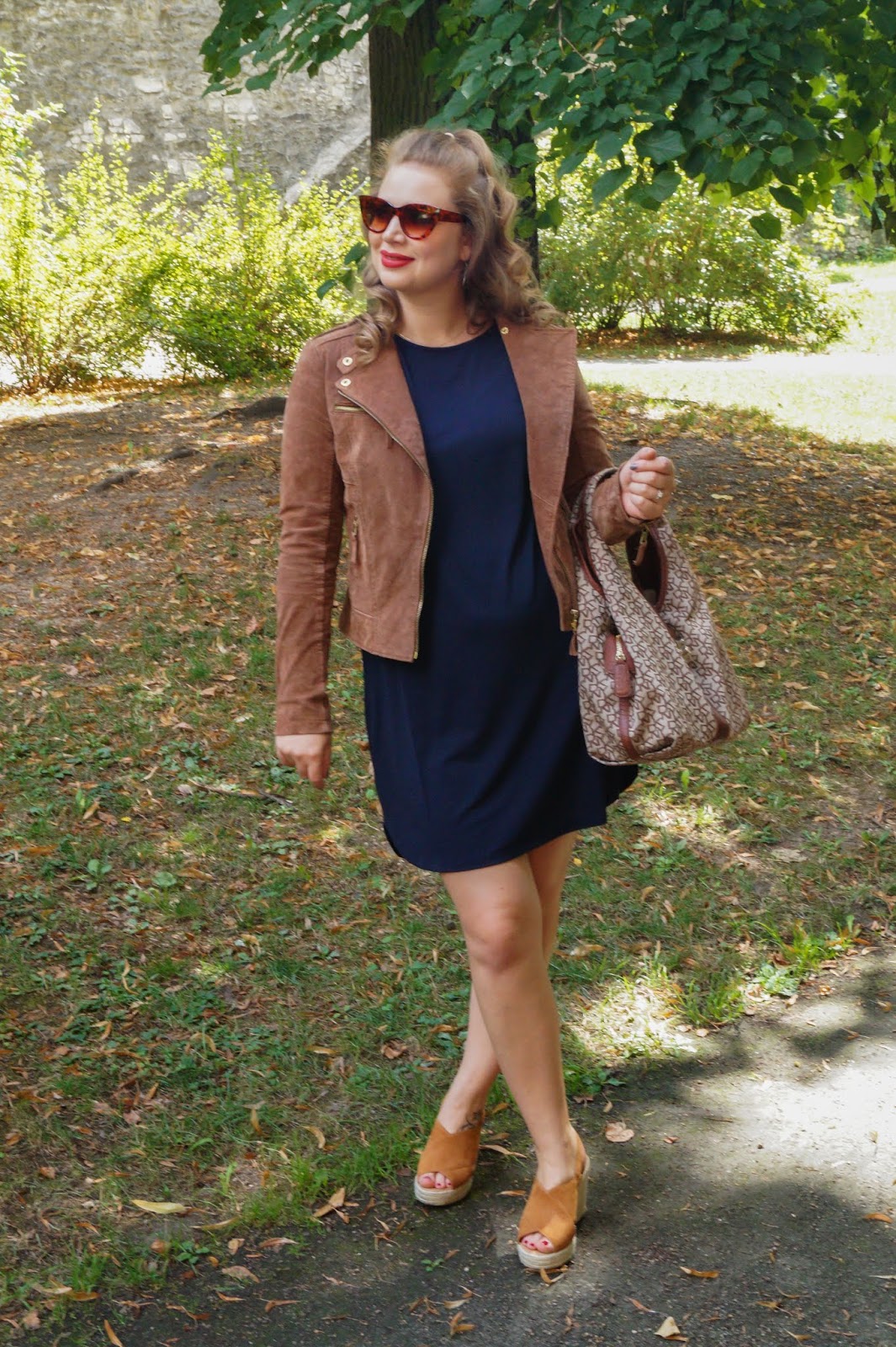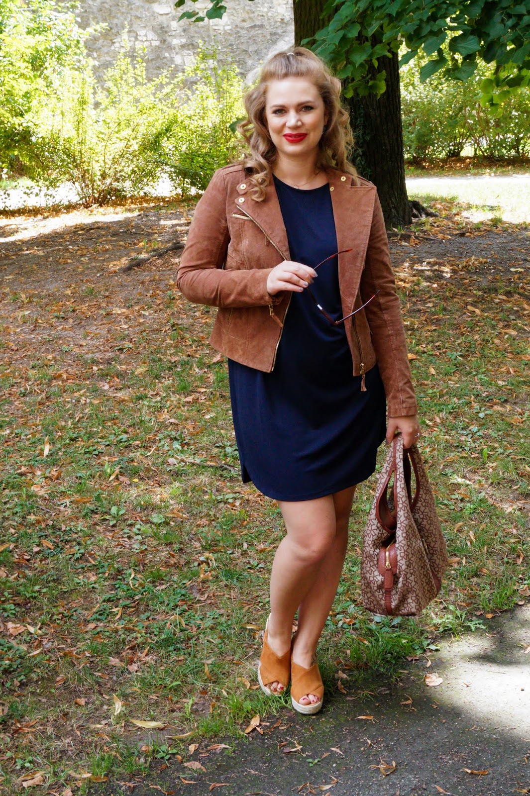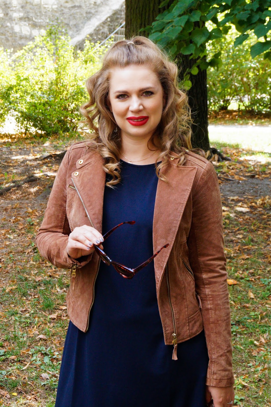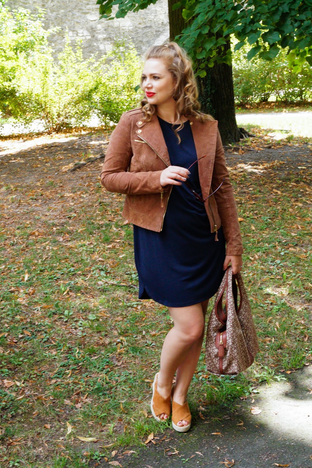 leather jacket Mango similar here and here / bag DKNY old similar here and here / dark blue shirt dress H&M / wedges sold out similar here and here / lips MAC Red / sunglasses Sunice