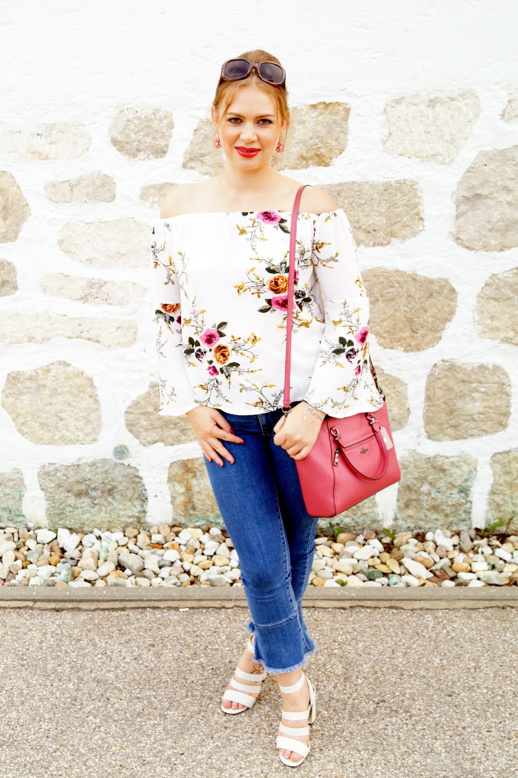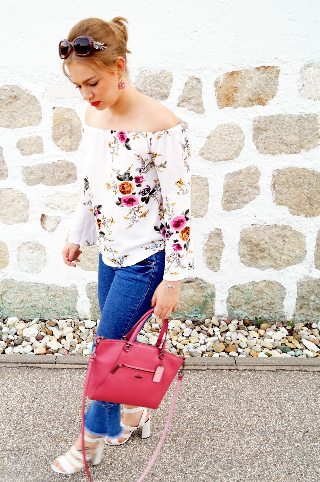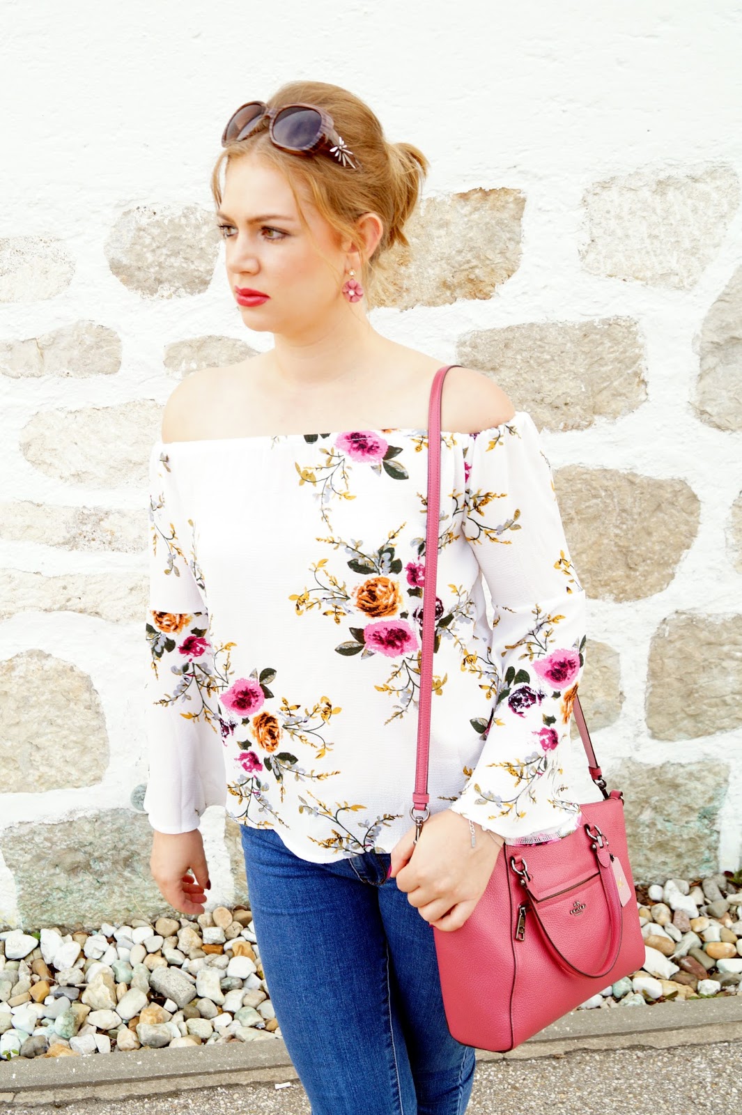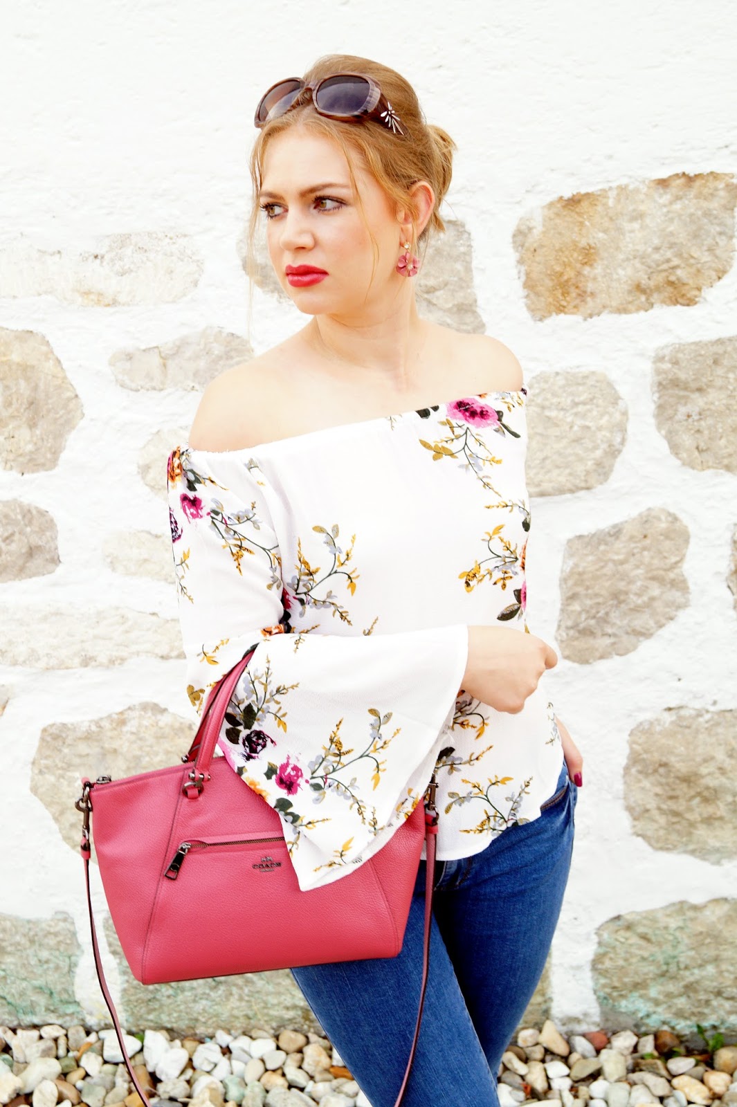 sandals New Look via Zalando sold out similar here, here and here / jeans Villa via Zalando / satchel bag Coach Prairie Satchel / earrings H&M / floral flare sleeve off shoulder blouse Zaful / sunnies old similar here and here