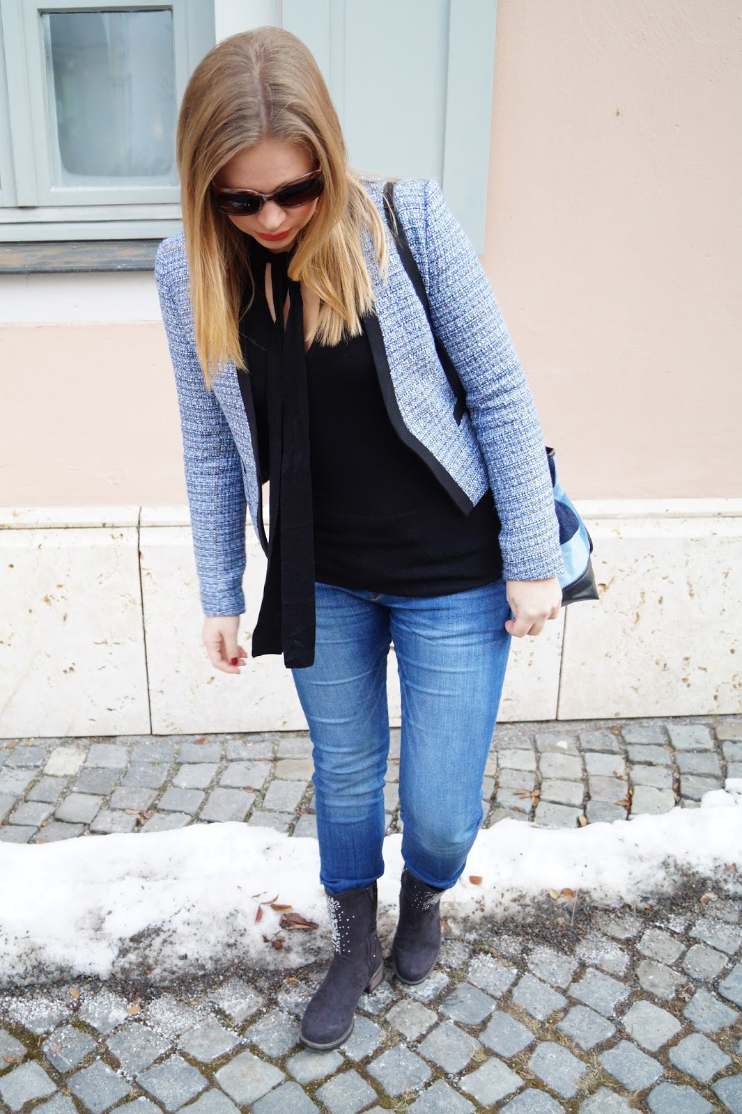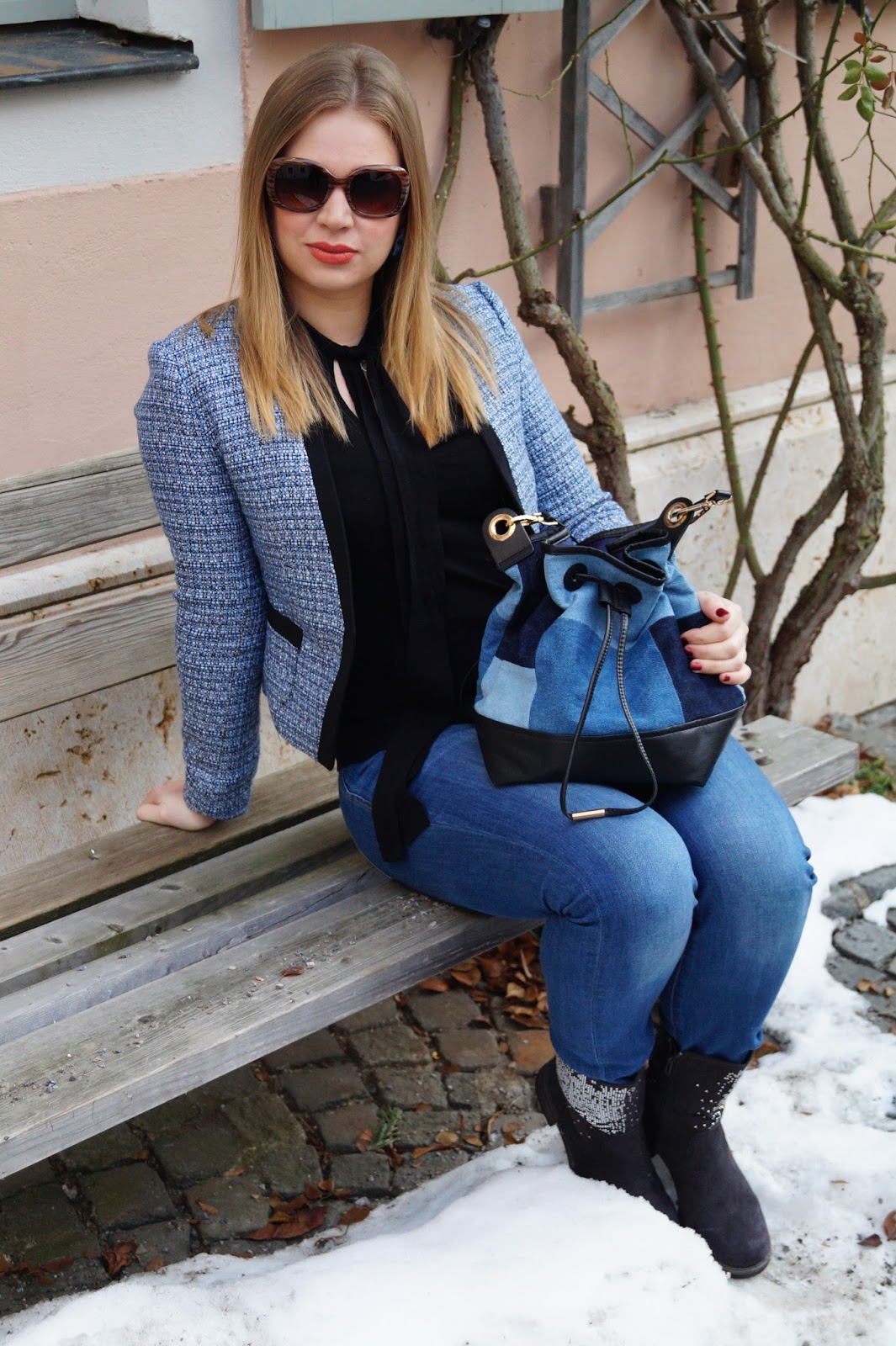 Ich habs in diesem Outfit vielleicht ein bisschen mit Denim übertrieben aber ich finde trotzdem das es toll geworden ist. Ich habe meine Beuteltasche mit einer Tweedjacke und einem schwarzen Schluppenpullover kombiniert. Die Schleifenohrringe aus Denimmaterial sezten noch eine zusätzlichen verspielten Akzent. Zu guterletzt habe ich ein paar Biker Boots mit Glitzer gewählt um den Look ein bisschen mehr casual zu machen. Würde auch gut für einen Casual Freitag in Büros passen (ich hatte meins am Freitag an – nur so als Beispiel)