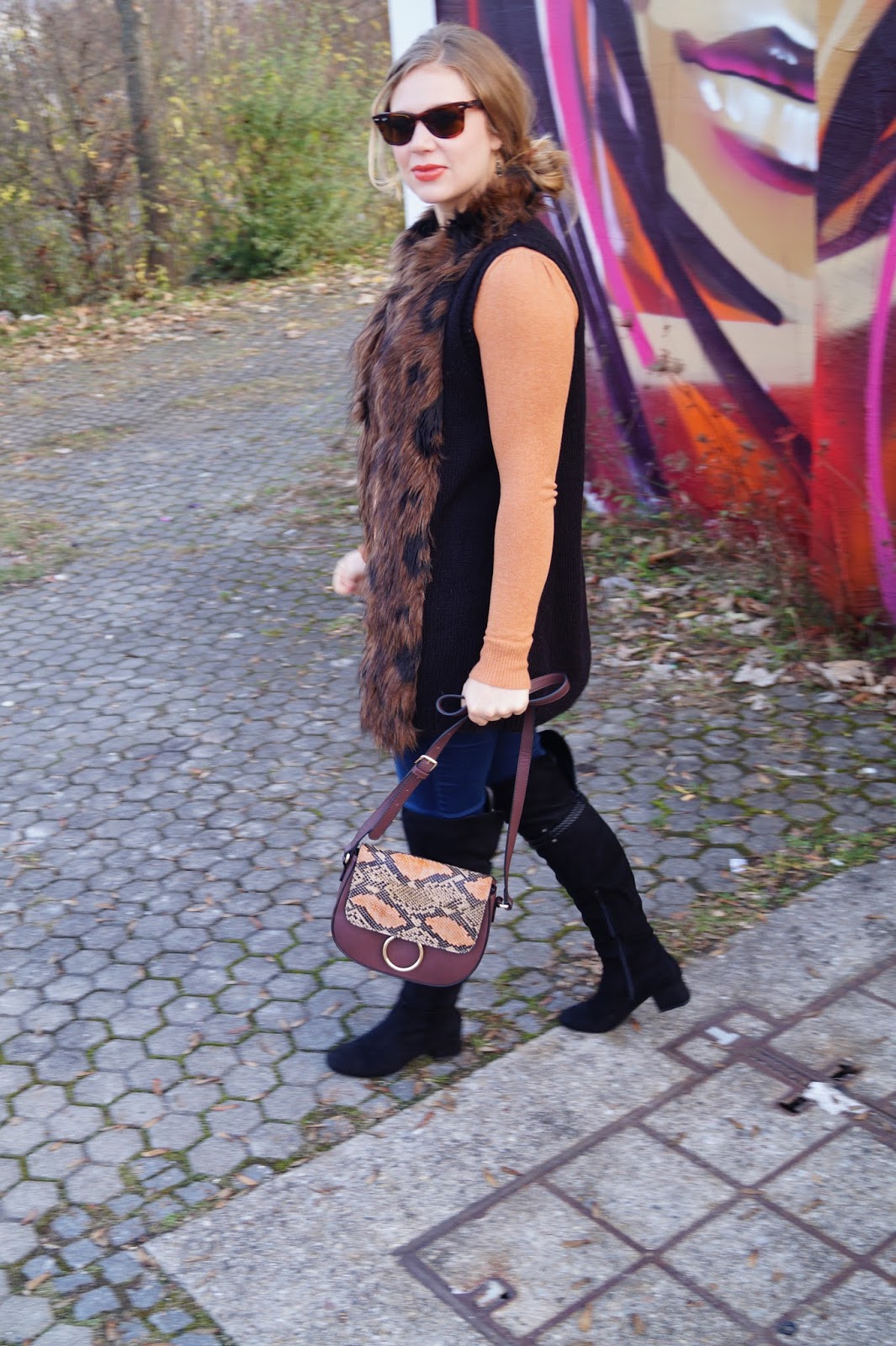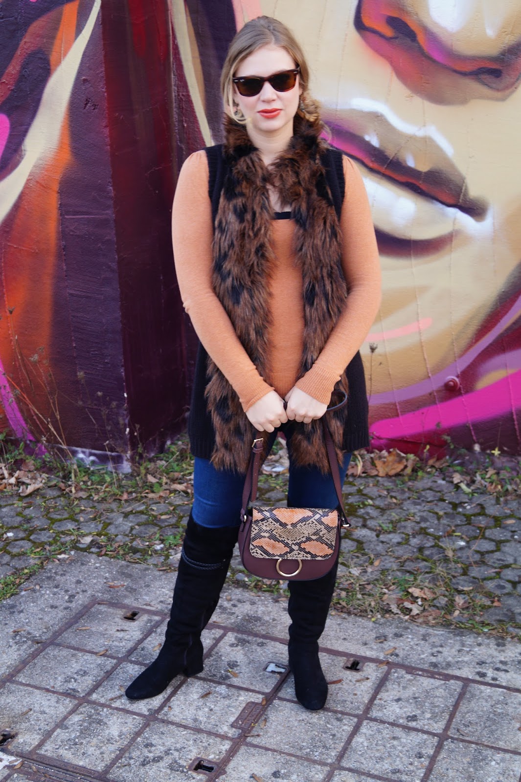 It is a long vest with a super soft fake fur cover on the front. It is really soft and puffy and the colors are changing with the light. I paired it with a light brown pullover with feminine details. and my favorite overtheknee boots.