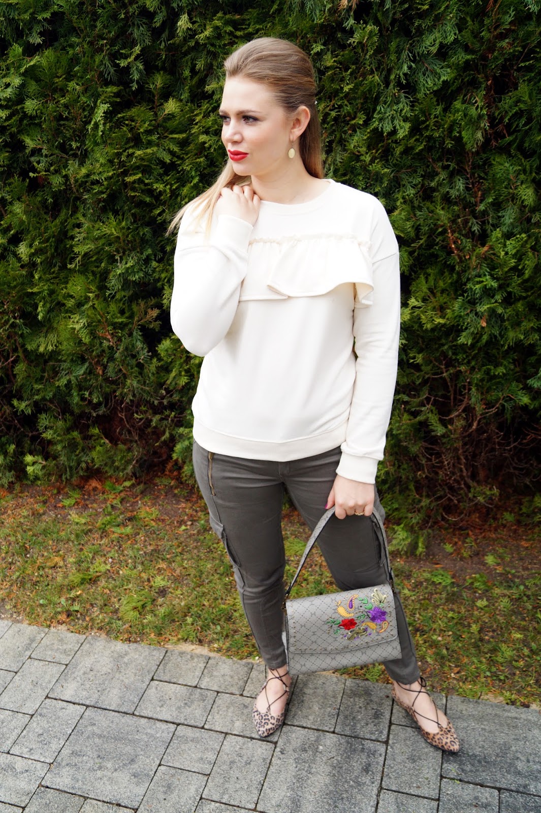 Pullover New Look / Pants similar here / Bag similar here / Lace-up flats similar here and here / Lips – essence velvet matte stick cherry crash