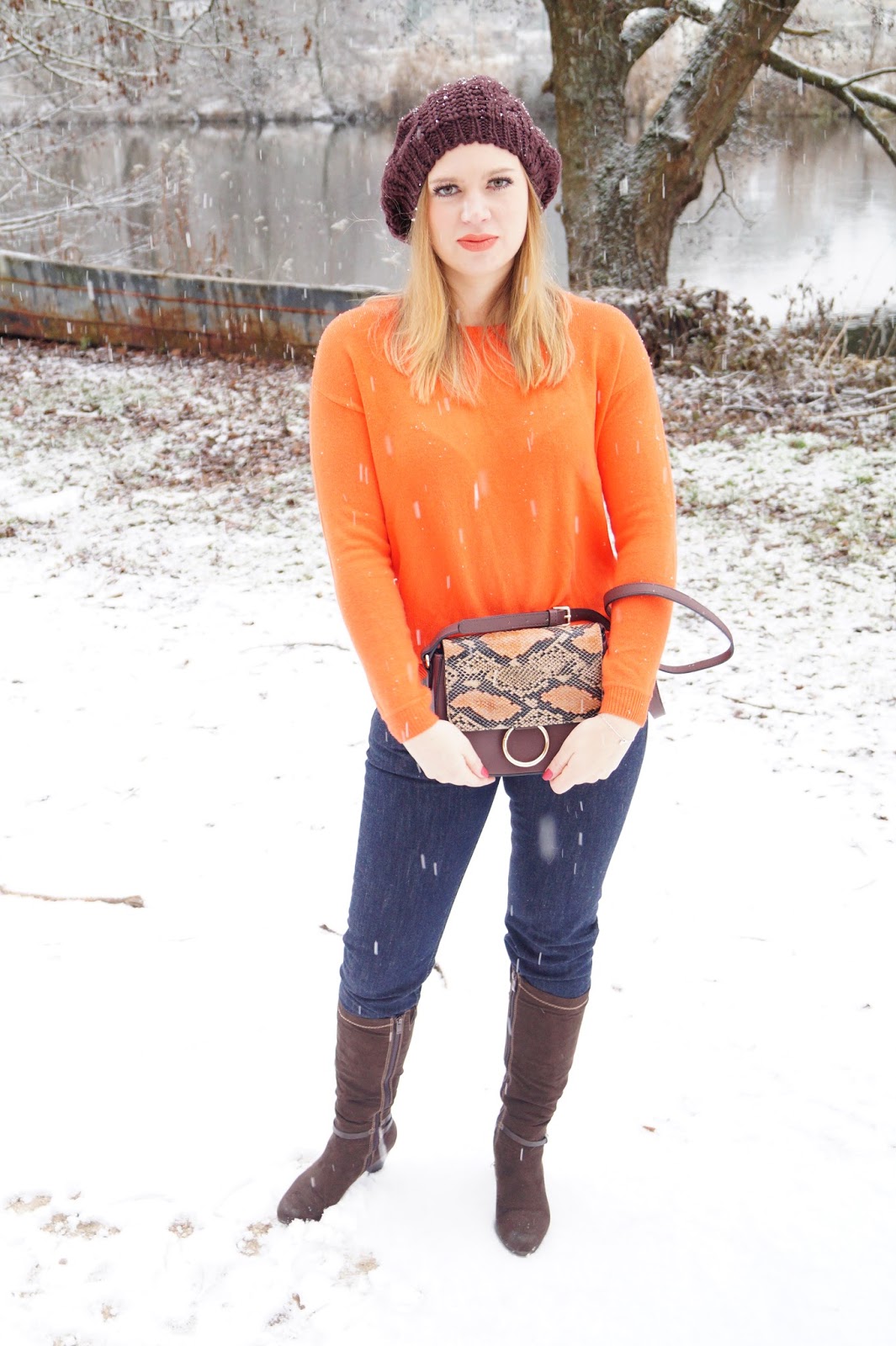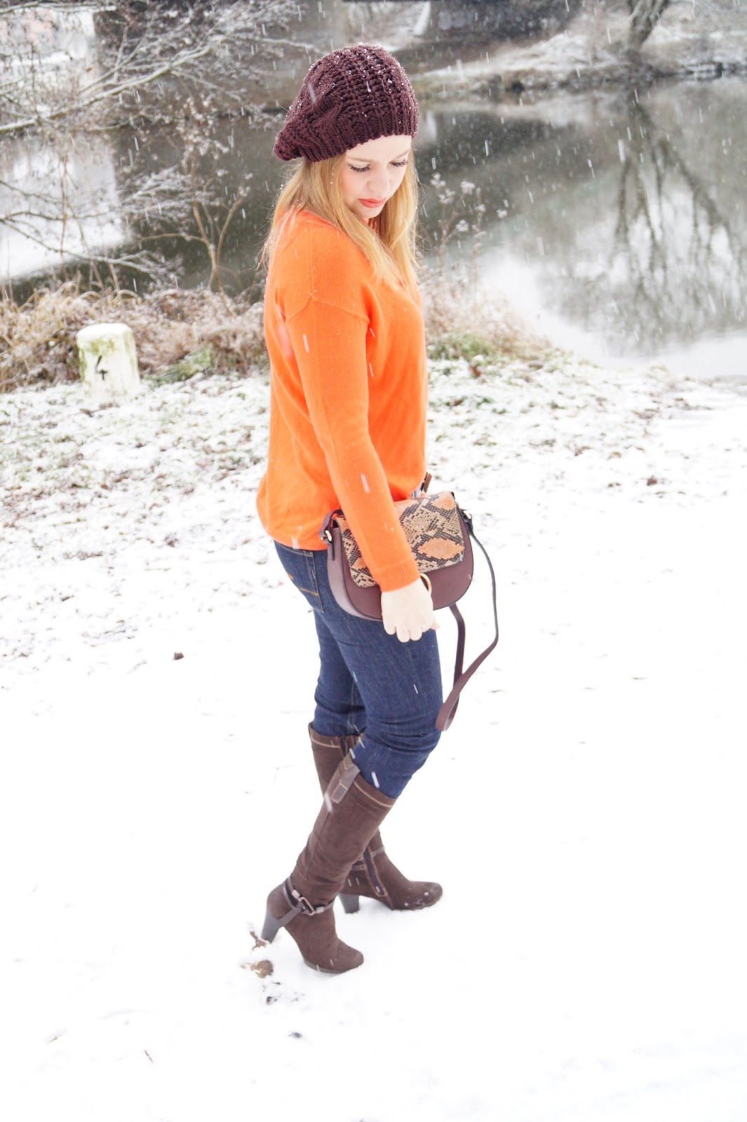 Um das Orange noch besser zur Geltung zu bringen habe ich den Pullover mit einer dunklen Jeans und braunen Accessoires kombiniert. Funktioniert ganz gut denk ich…