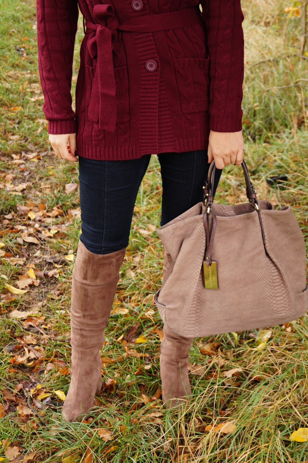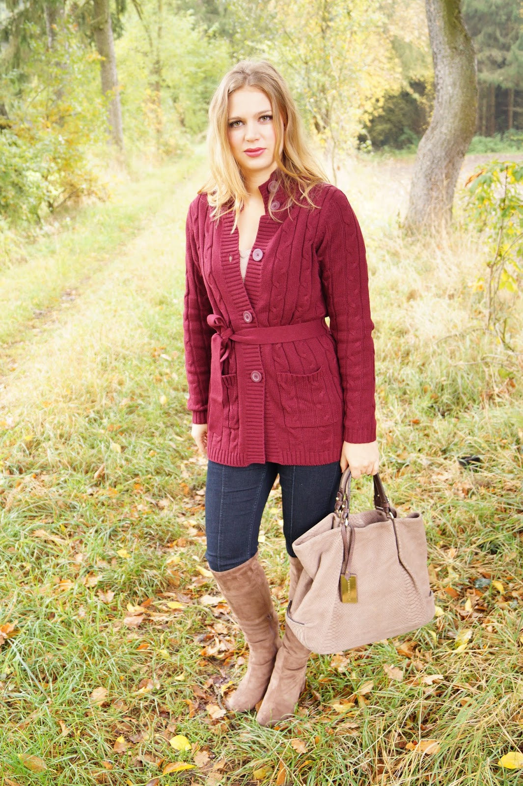 I had been into pullover lately but now I found this super pretty longcardigan in this nice plumy shade (in which I have a matching lipstick from Manhattan too ^^ ). I just love everthing about this cardigan – the color, the neckline, the length, the knitted pattern and of course the price. It is a steal for under 30 Euros. I paired it with a pair of jeans leggins and those brown over the knee boots from Mark Adam which are currently on sale for about 60 Euros. They are just great for the winter month. They have a chunky and not so high heel so you won´t slip away when it is freezing outside and the color matches perfectly with lots of fall and winter colors.