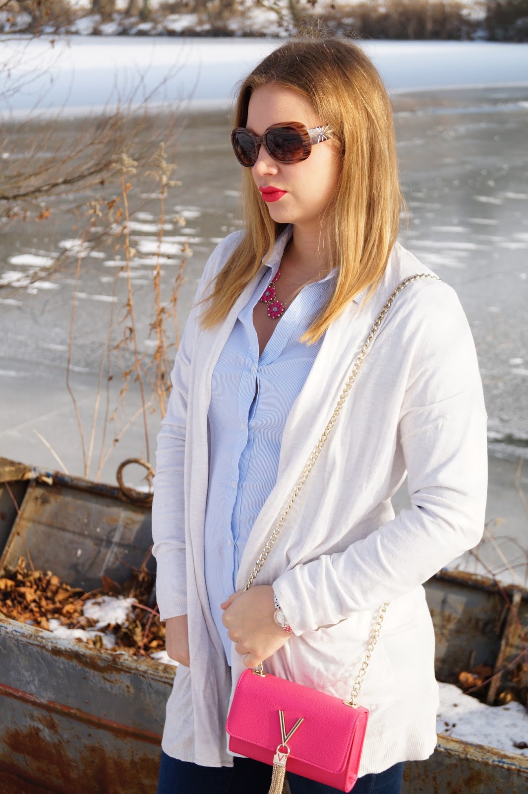 I paired this one with a creme cardigan and since I am so sick and tired of the Winter I am loving pops of pink in everything.