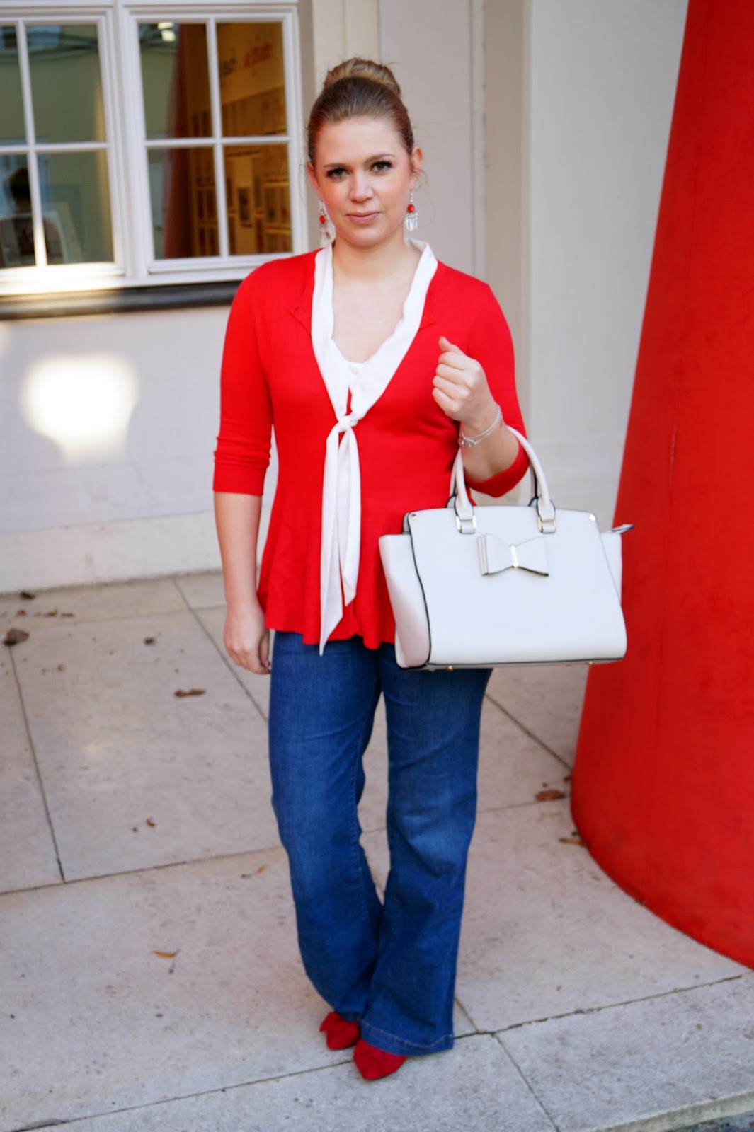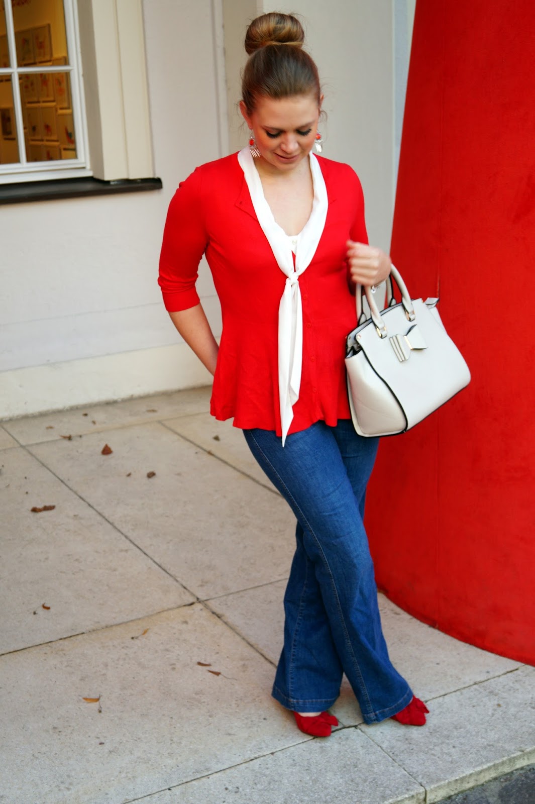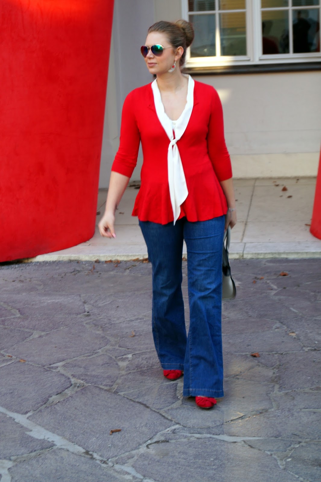 Outfit: Red peplum cardigan / flared jeans / bow wedges…..
