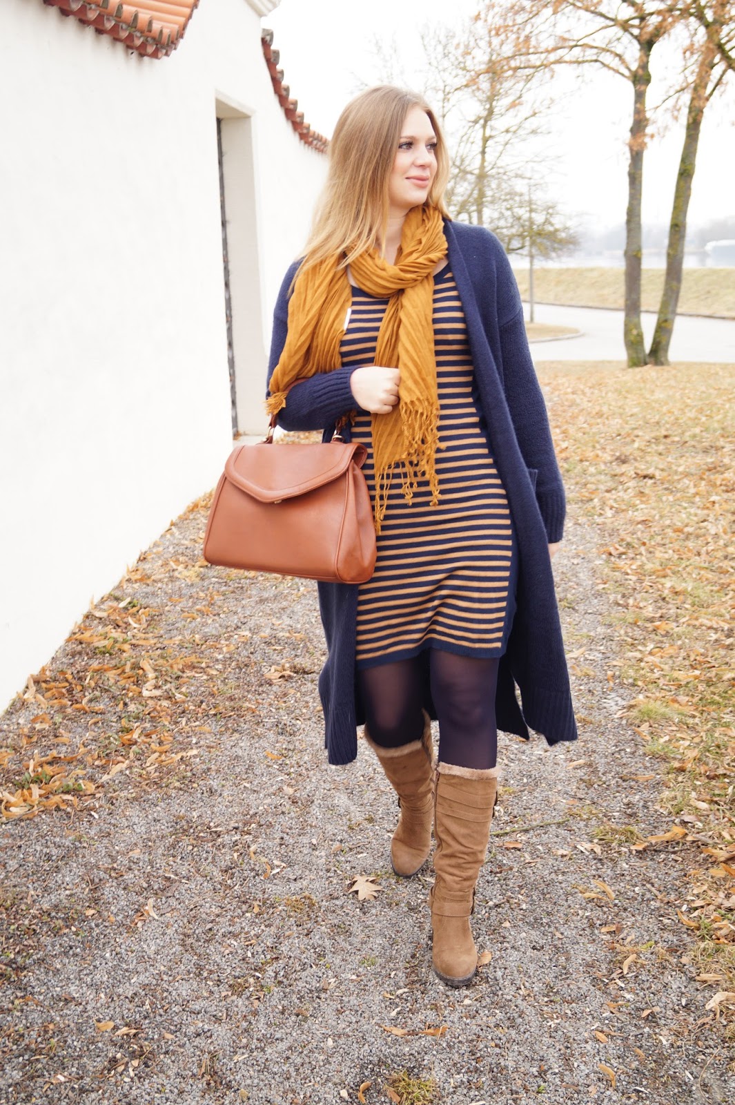 Endlich kann man wieder in die etwas (hier nur etwas) helleren Farbkombinationen gehen wie dieser helle cognac/curry Ton und Navy. Streifen finde ich persönlich passen am besten zu Frühling und Sommer und die Kombinationsmöglichkeiten mit verschiedenen Farben und Kleidungsstücken sind schier endlos.