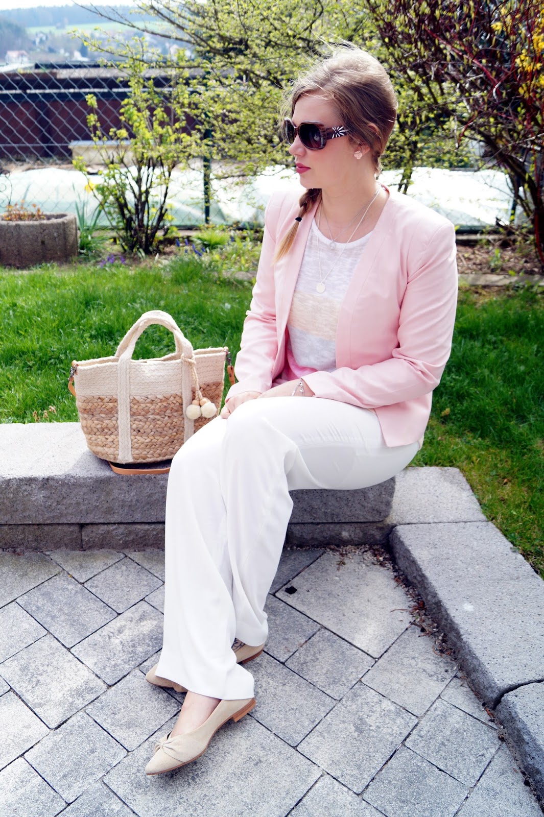 Wer mag denn keine leichten, fließenden weißen Hosen für Frühling und Sommer ?! Richtig ?! Ich mag diese Art von Hosen wirlich gerne. Der Marlene Schnitt kreirt einen so eleganten aber doch trendigen Look. Meiner Meinung nach passen diese Art von Hosen perfekt für die kommende Jahreszeit. Ich habe diese Hose mit einer ganzen Reihe von Pastelltönen kombiniert. Der Pullover hat ja gleich einige davon vereint, also habe ich das Rosa aufgegriffen und einen passenden Blazer sowie passende Ohrringe kombiniert. Die Ballerinas und die Basttasche habe ich in einem schlichten Beigeton gehalten. Dieser passt sehr gut dazu, kollidiert aber nicht mit den anderen Farben und bringt auch keine Unruhe rein. Abgerundet wurde das Outfit mit meinen beiden Lieblingsketten. Diese trage ich im Moment ständig. Diese Disc Anhänger an den Ketten sind ein Riesentrend im Moment aber dazu habe ich mehr in einem separaten Post für euch.