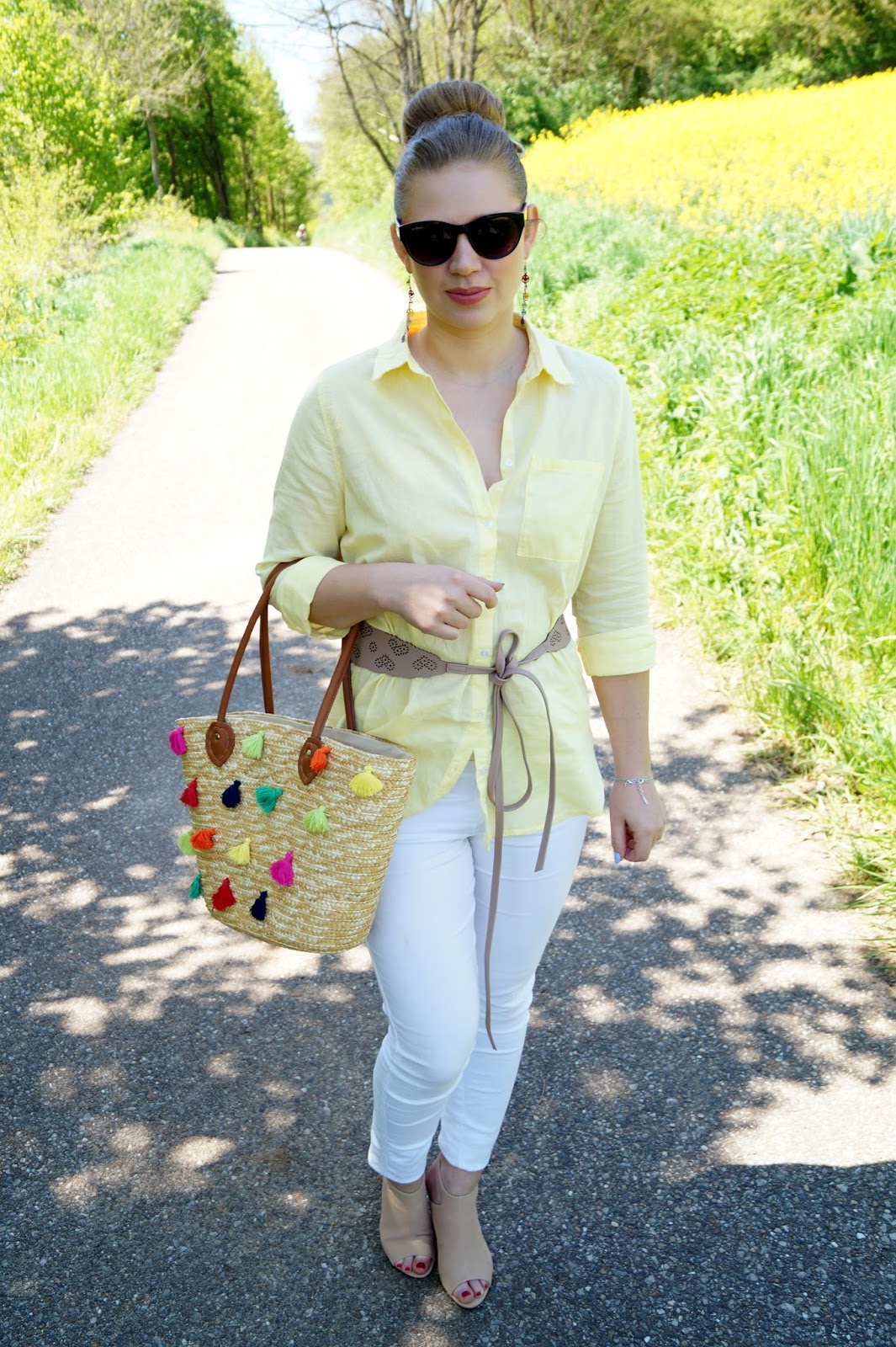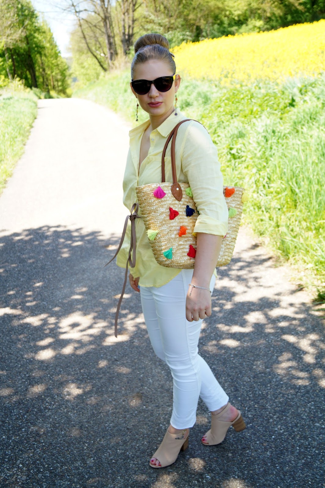 But let´s have a look at this super nice oversized and airy yellow colored button up blouse. It is from H&M Divided so make sure to get size one up cause those run small.  I paired it with this white skinny jeans from H&M. To get some shape and set a focus I got this waist belt from Anna Field I really love. Had also worn it here and got the black version too. It is to tie in the front so you can knot it or make a bow out of the loose ends. Whatever you like. And now the shoes. They fit perfectly to this outfit. Not only the color but also the style. I don´t want to say to much about this cute tassel straw tote I absolutely love cause I am planning a post about straw/wicker/rattan bags soon but how adorable is it right ?!
