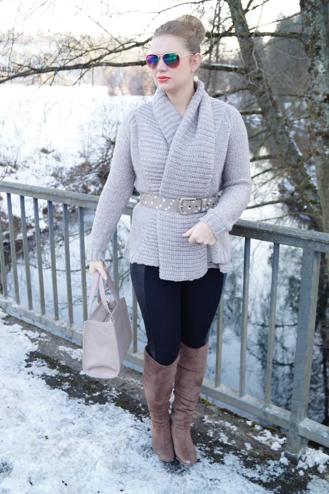 Outfit:Comfy knitted cardigan / black leather leggins / overknee booties / Armani Shopper / Starbelt….