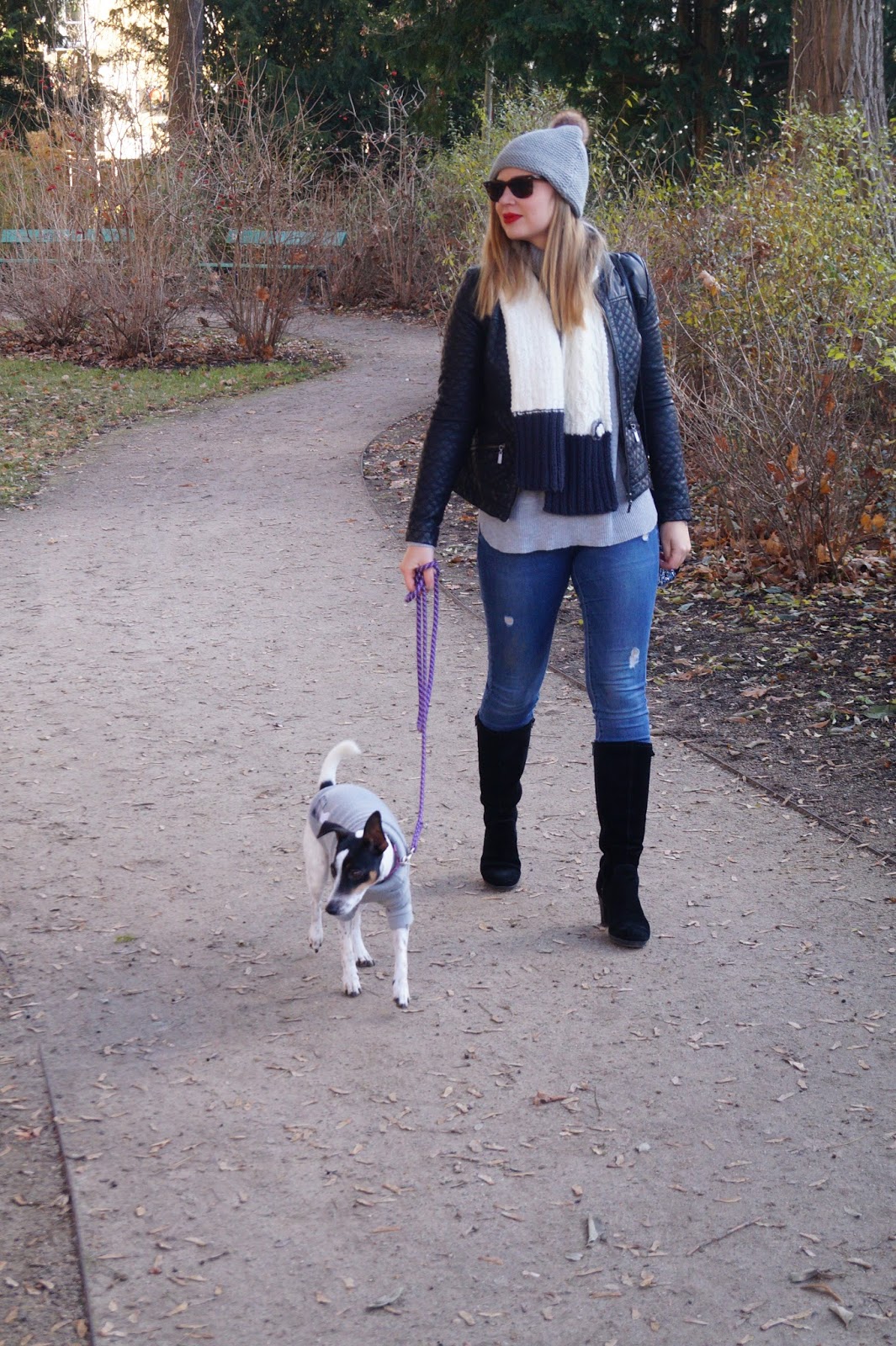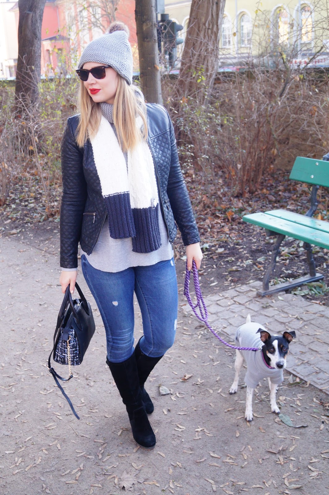 Outfit:Grey Pullover / Leather Jacket / Destroyed Jeans / Knitted Scarf and Beanie