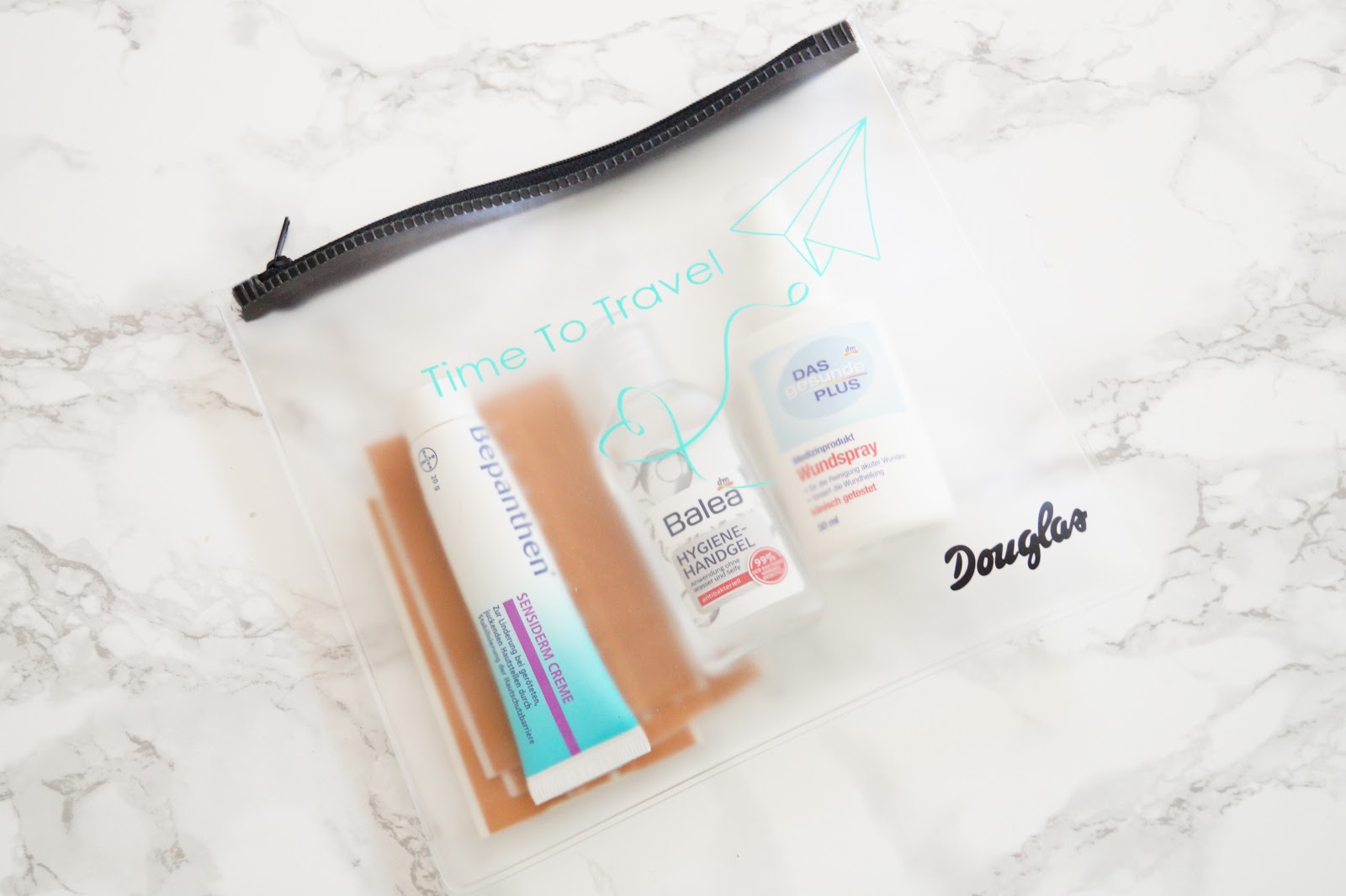 Another small zipper bag I am taking with me is this one from Douglas. It fits the theme really nice as it says „time to travel“. I am storing all the small stuff we are taking with us like medicine, my dietary supplement, cleaning wipes for glasses, scissors and tweezers etc.