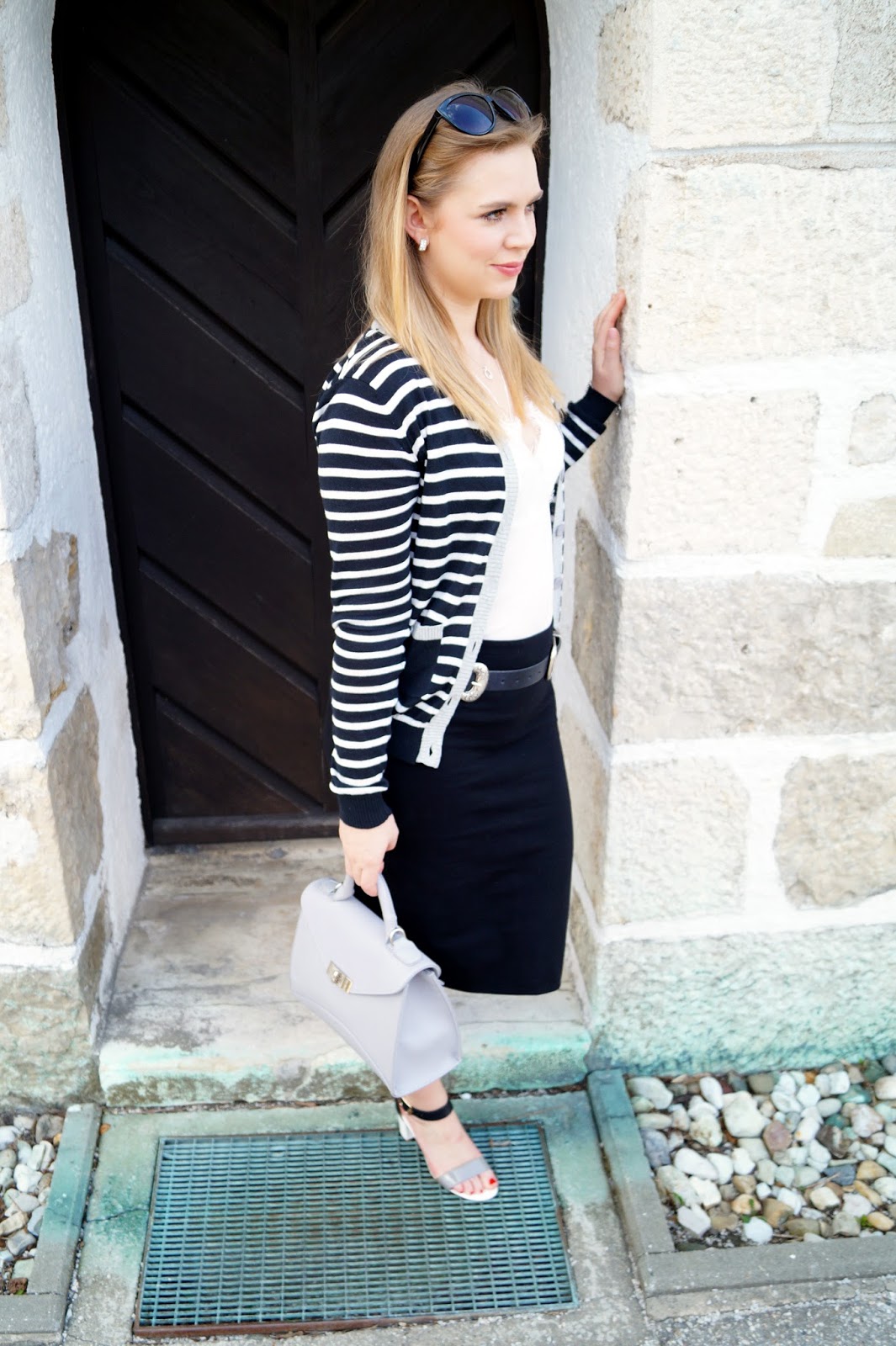 The cardigan is pretty old but stripes won´t go out of fashion so it is safe to say it will stay quite a while. I took the colors from the cardi and created the whole outfit arround this piece and it turned out great – in my opinion. The three-tone block heels matched perfect and the cute little David Jones bag was the perfect complement.