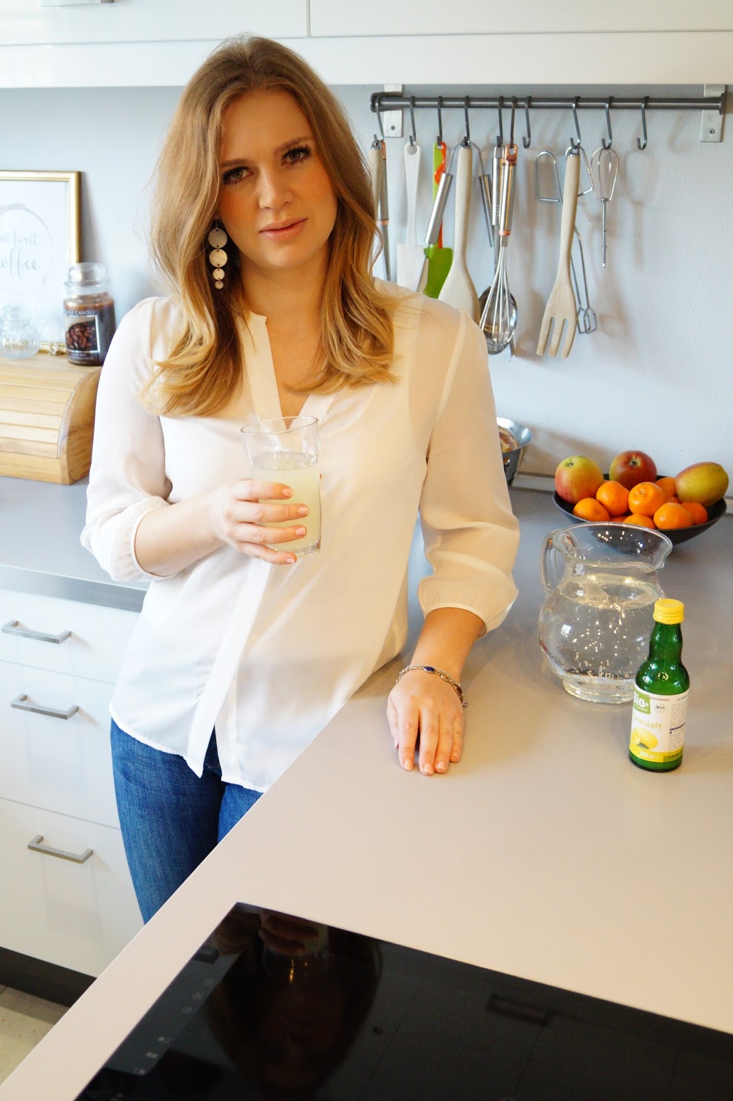 Für etwas mehr Vitamin C gebe ich einen Schuss Zitronensaft in mein Wasser (ein Schuss reicht wirklich aus, weil das sonst ziemlich sauer ist). Zitronensaft kaufe ich bei uns als Kontentrat in der Drogerie gibts aber auch im Supermarkt. Es macht nicht nur ein erfrischendes Getränk aus Wasser es gibt einem auch einen schönen Glow und eine gesunde Gesichtfarbe von innen nach außen