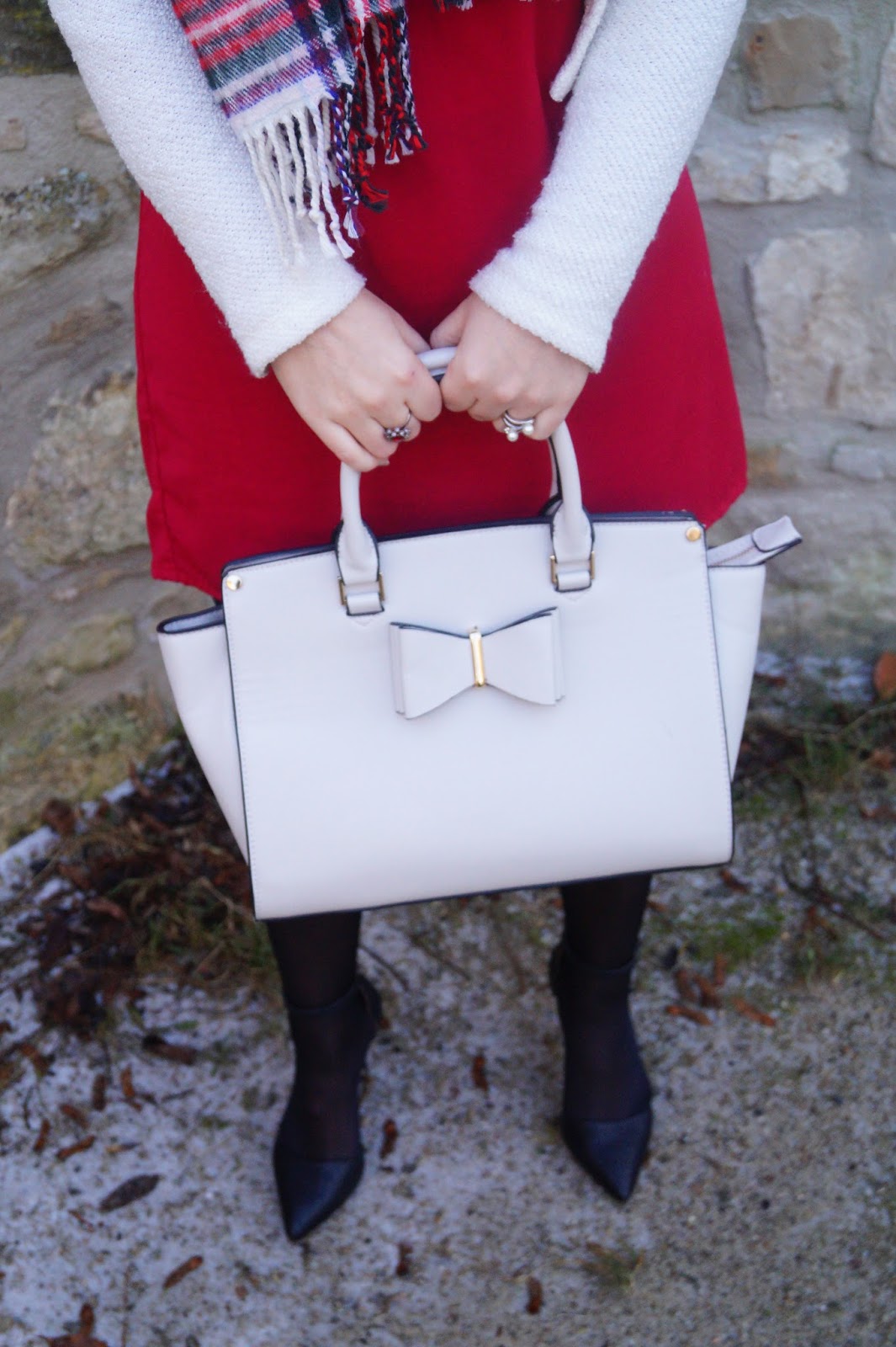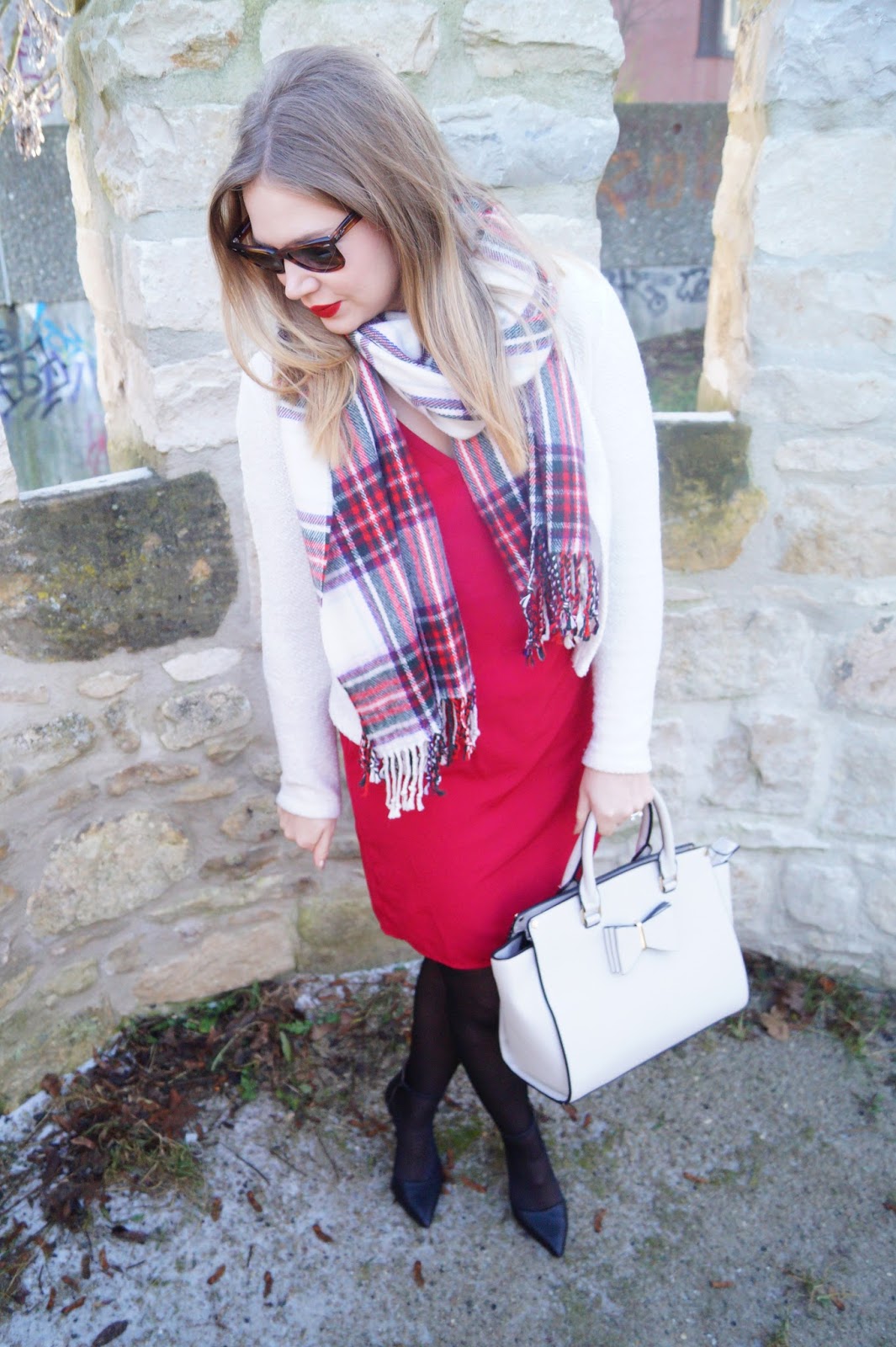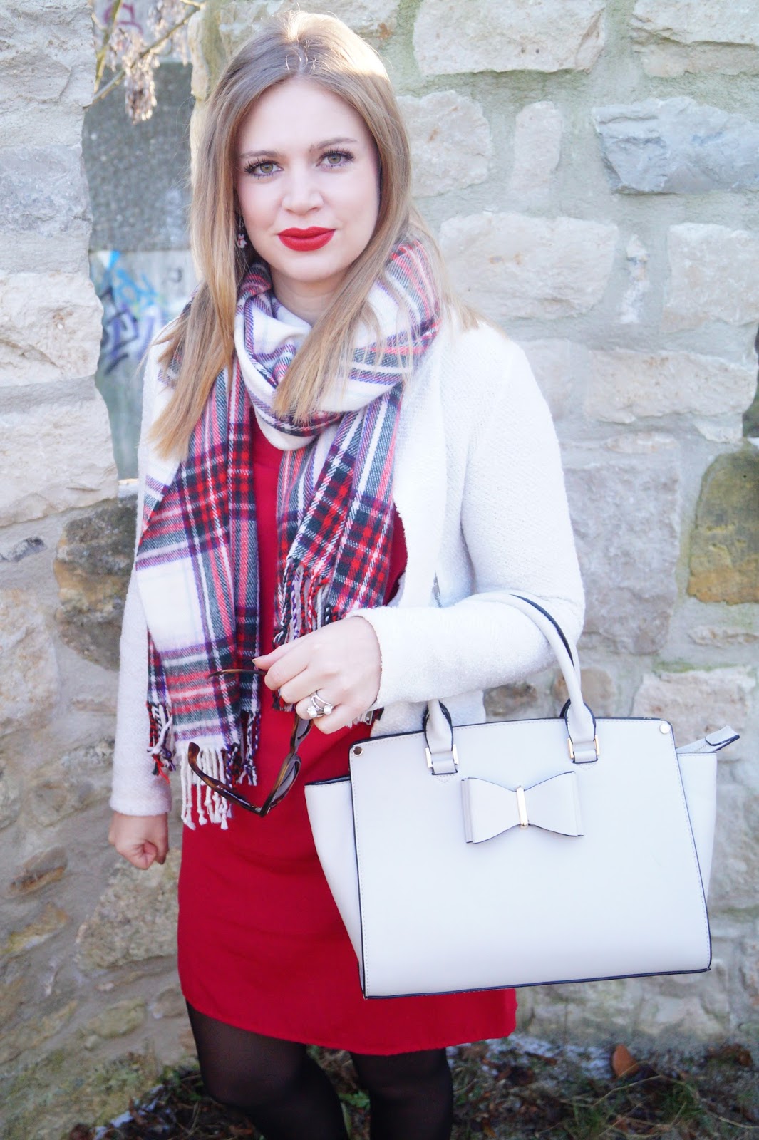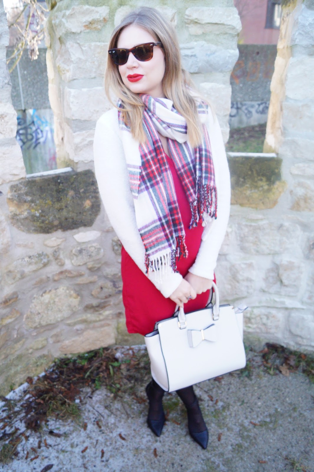 Dress similar here and here / Jacket / Scarf / Bag similar / Heels similar / Sunnies / Ring similar / Lips Maybelline Matte Ruby