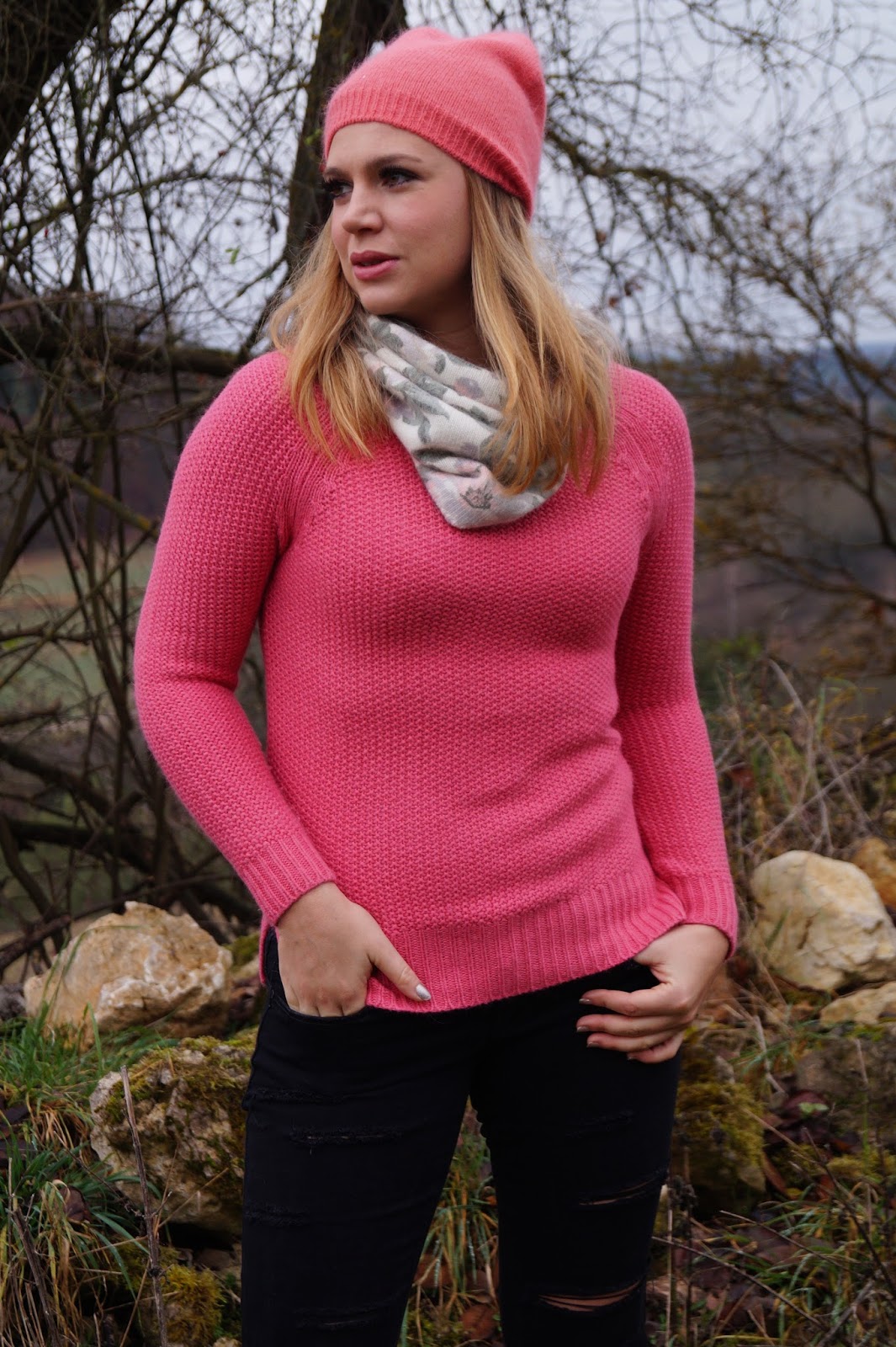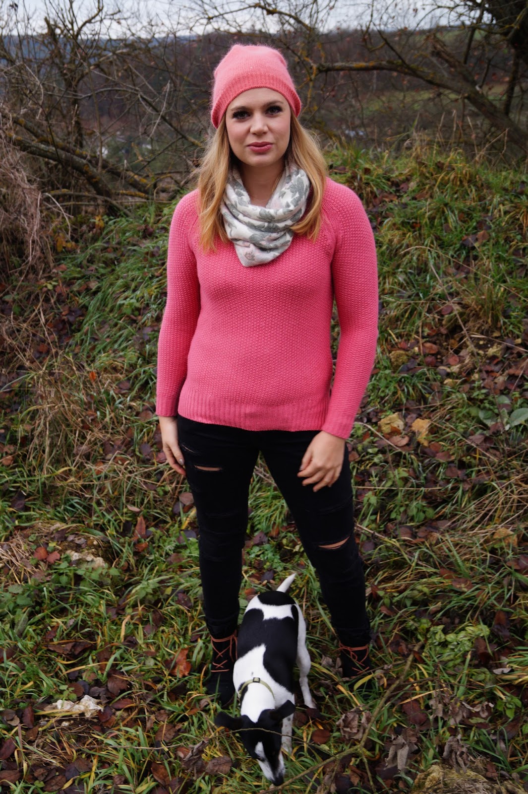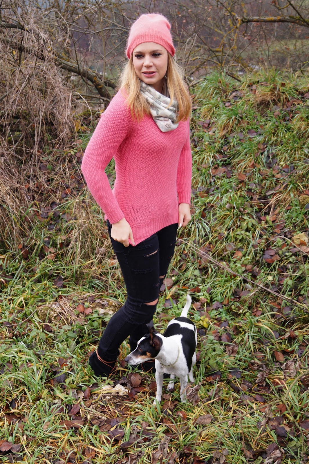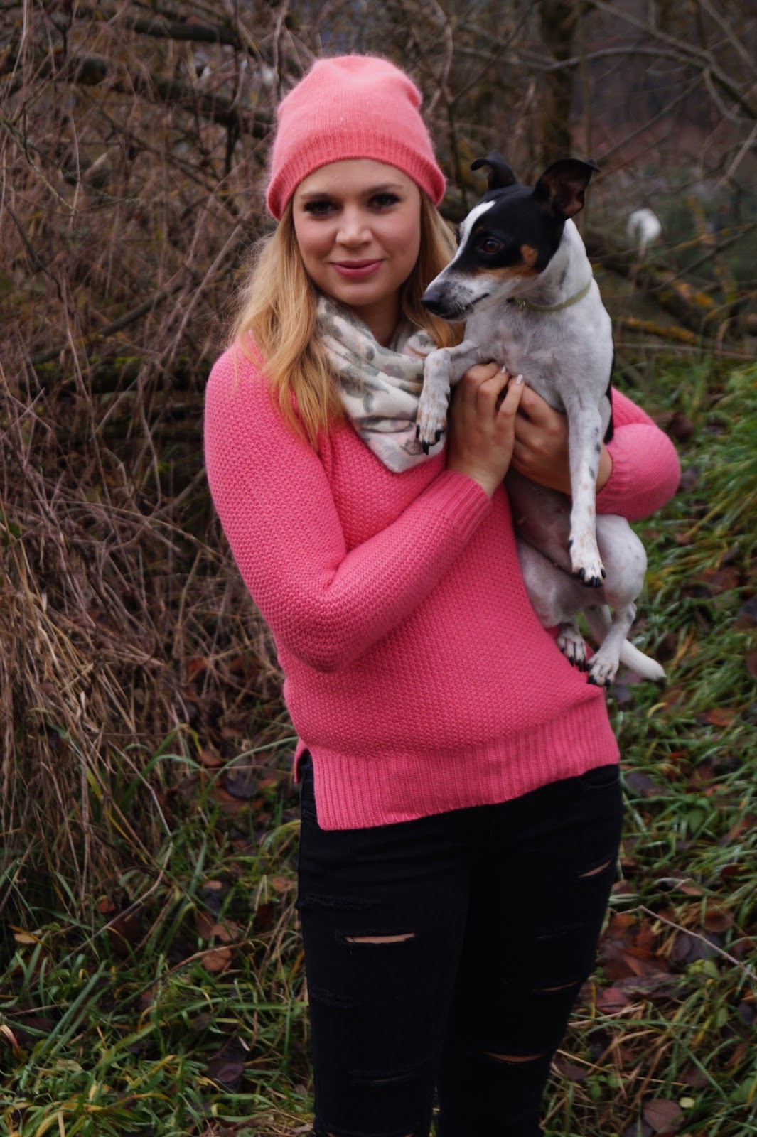 Here is a nice outfit with one of my favorite colors – pink of course with a matching pullover and this super cute Winter white wool scarf. I dressed it down a bit with the pair of distressed jeans and boots for walking Chloe.