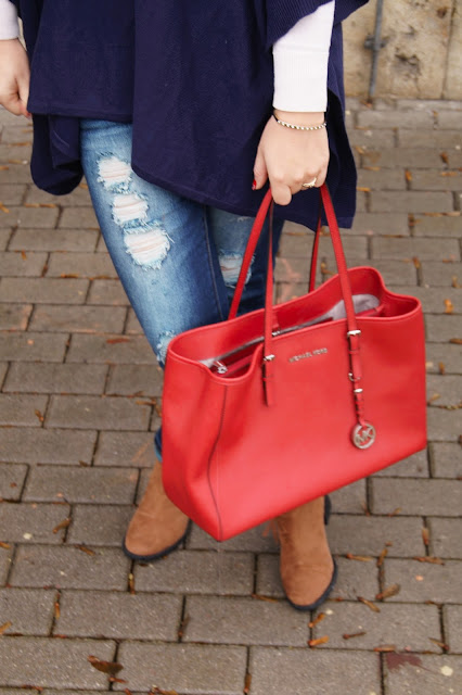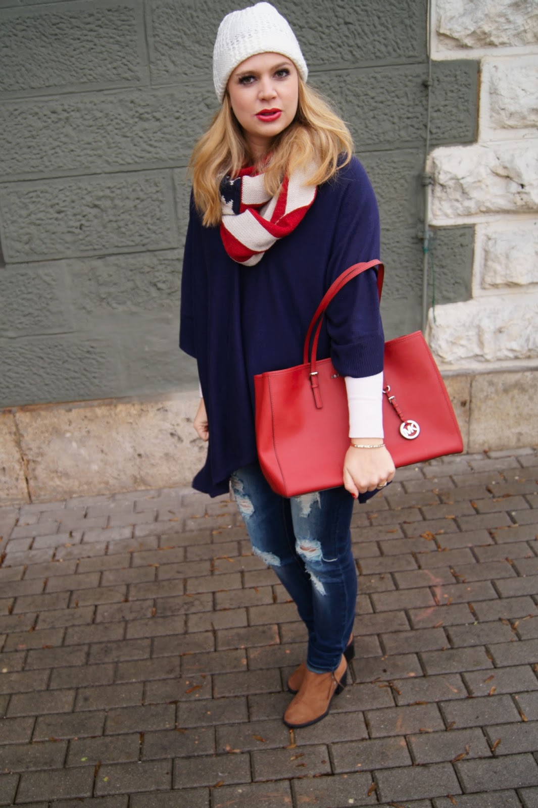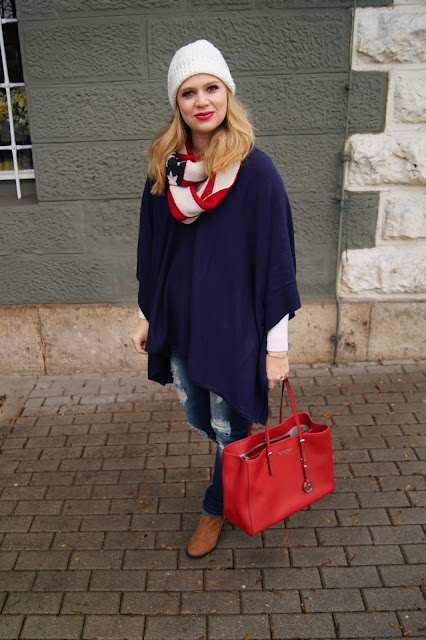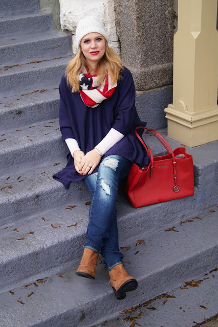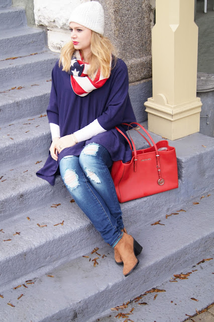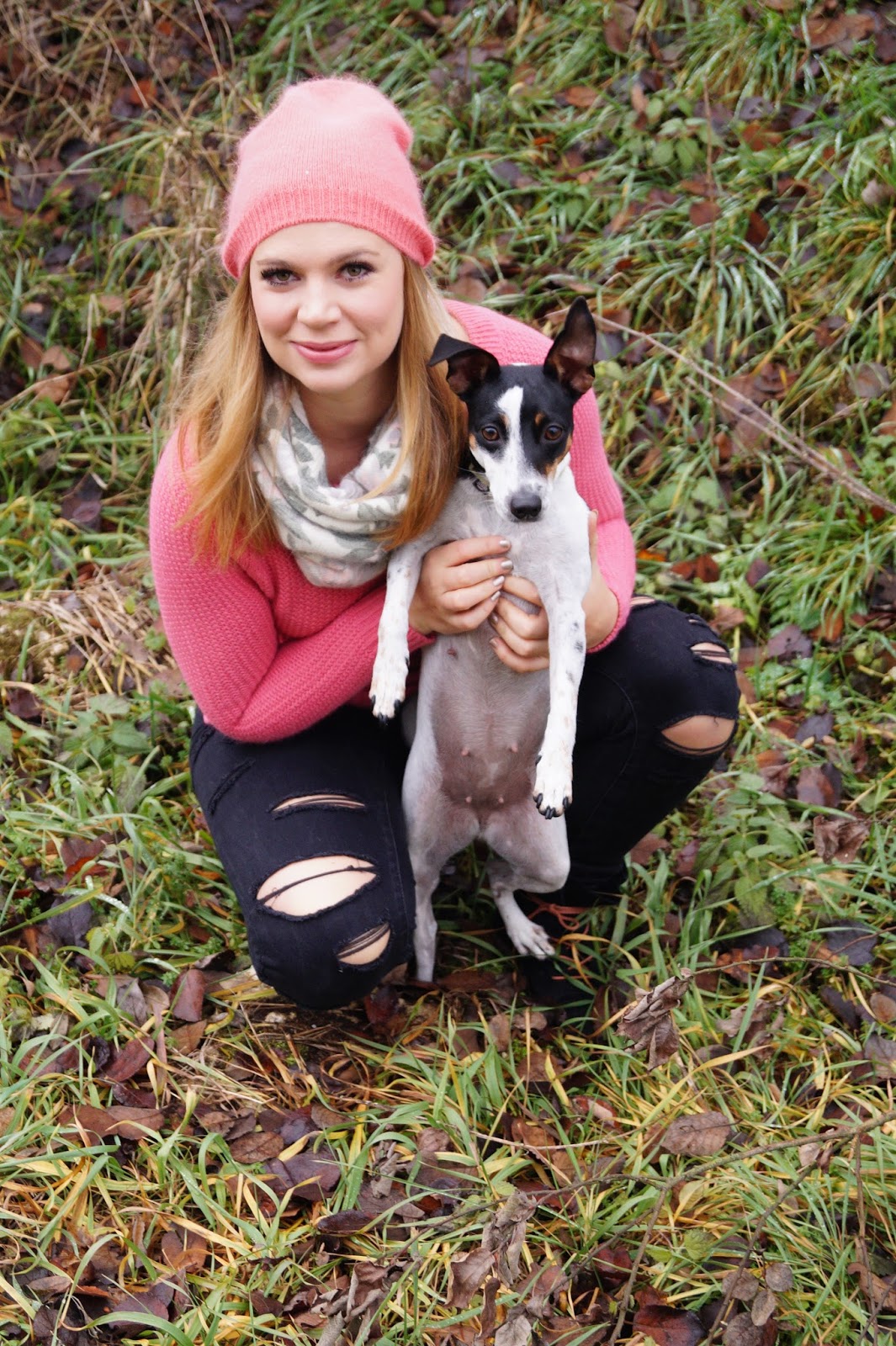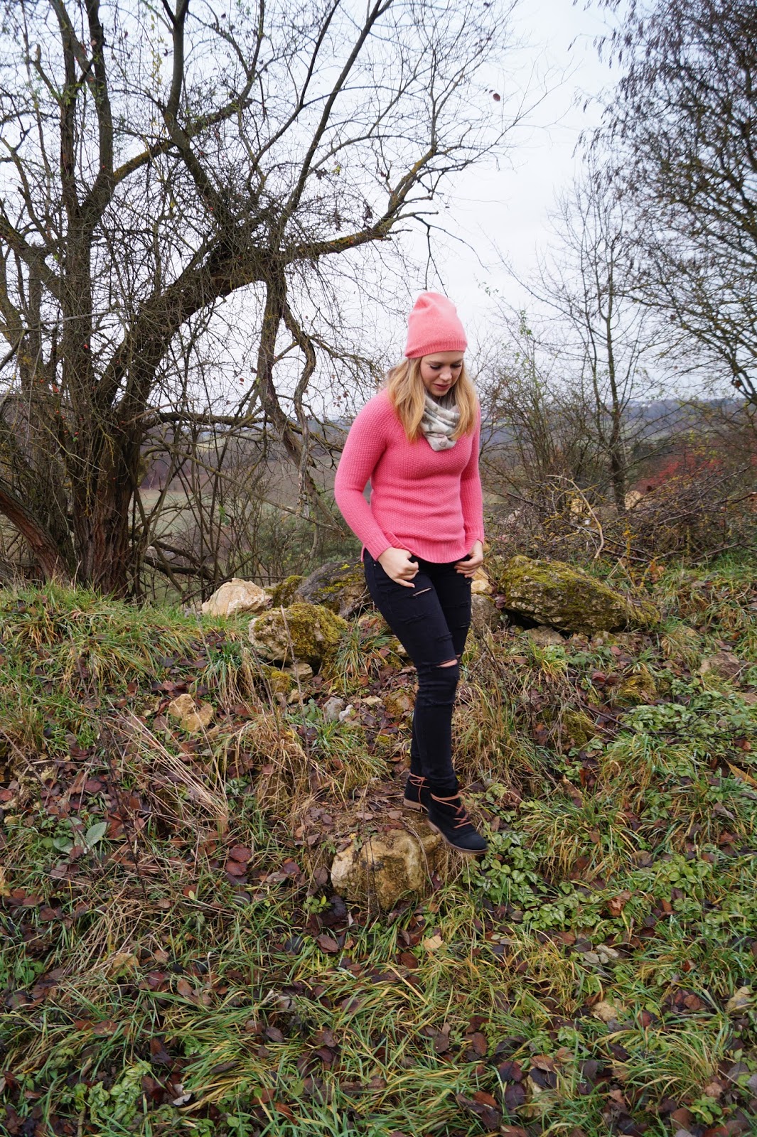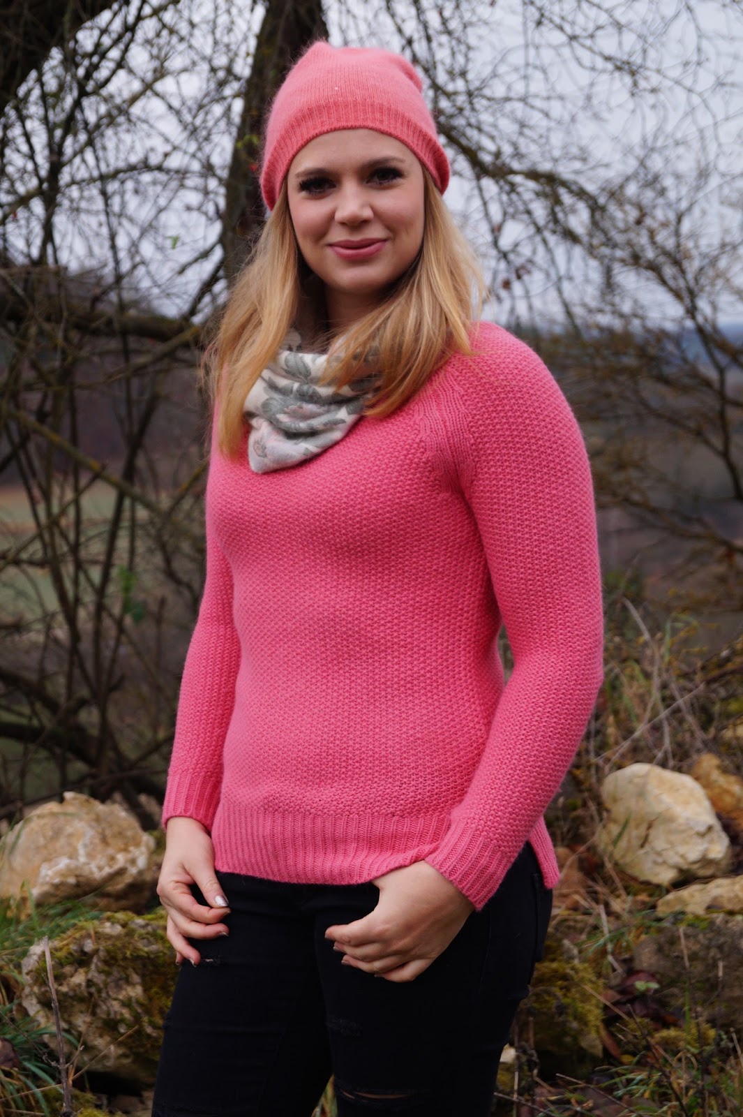 Here is a nice outfit with one of my favorite colors – pink of course with a matching pullover and this super cute Winter white wool scarf. I dressed it down a bit with the pair of distressed jeans and boots for walking Chloe.