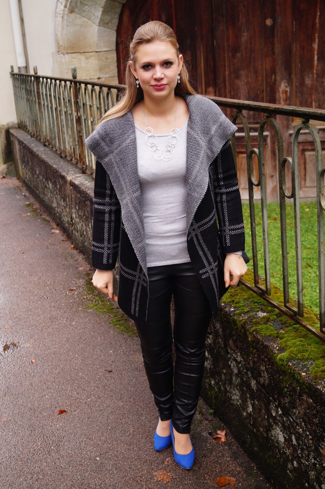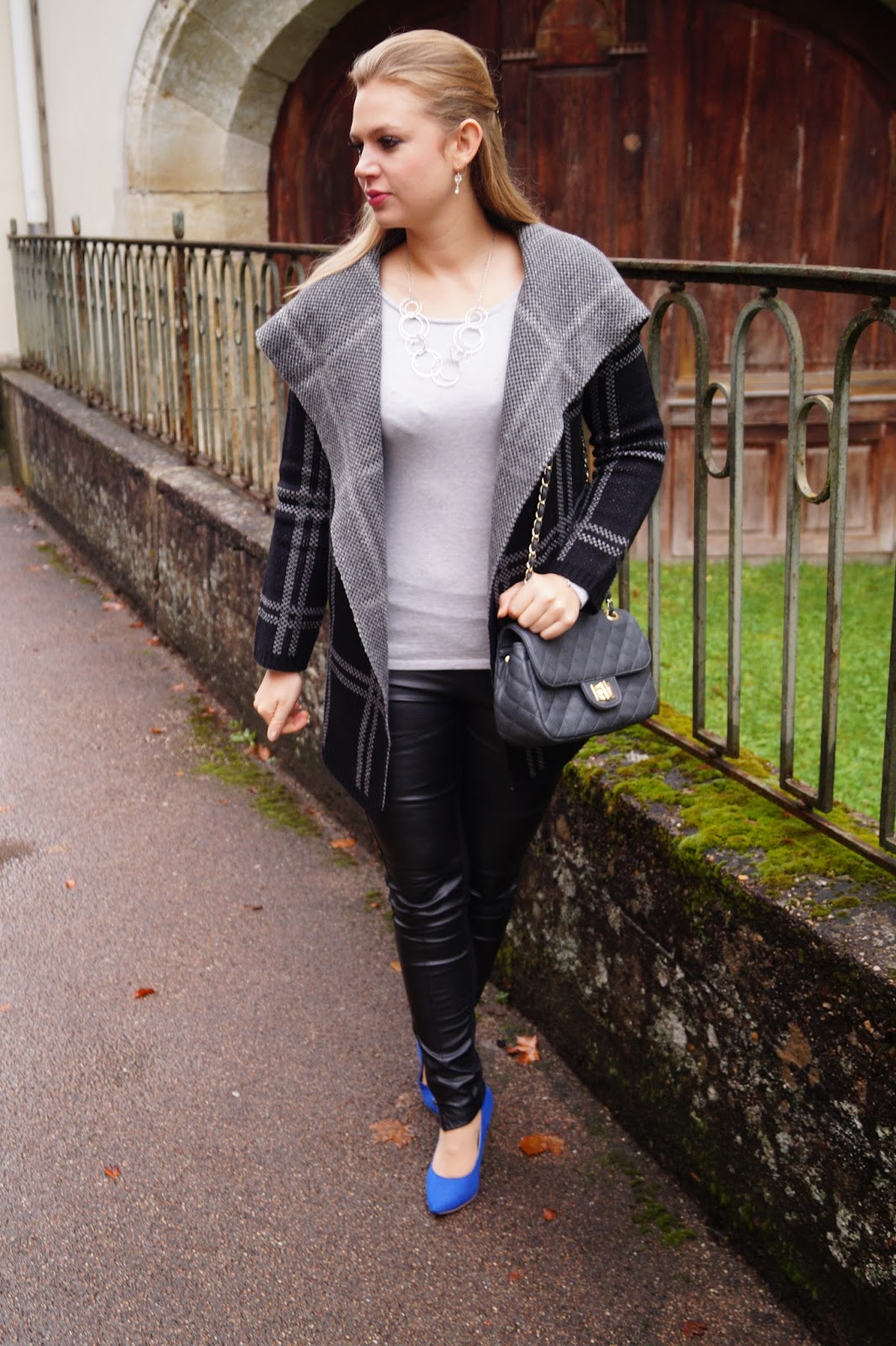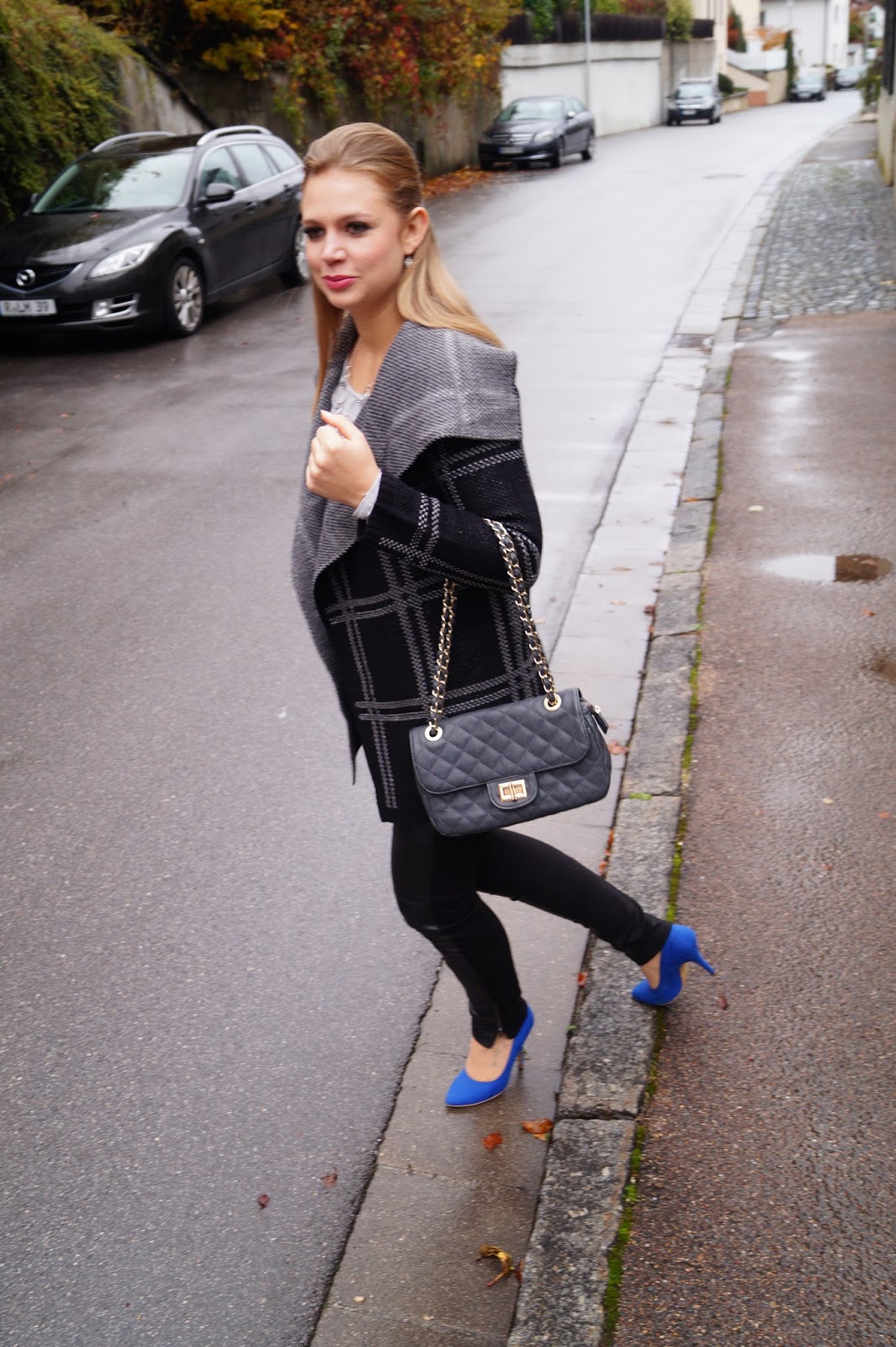 todays outfit is all about the coat. I like those kinds of coats a lot. It is made of wool and it is perfect for fall cause it is so cozy and warm. It is also perfect to transit into the Winter months cause you can easily wear it under a jacket and as it is silver and black you can combine poppy colors to it. I added some color with those bright blue pointed heels.