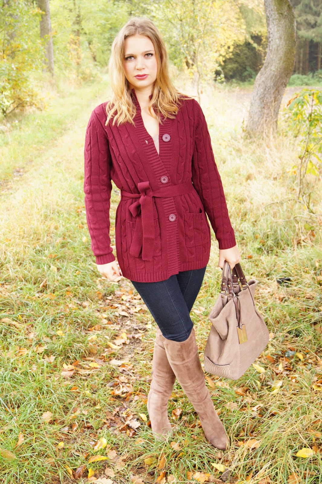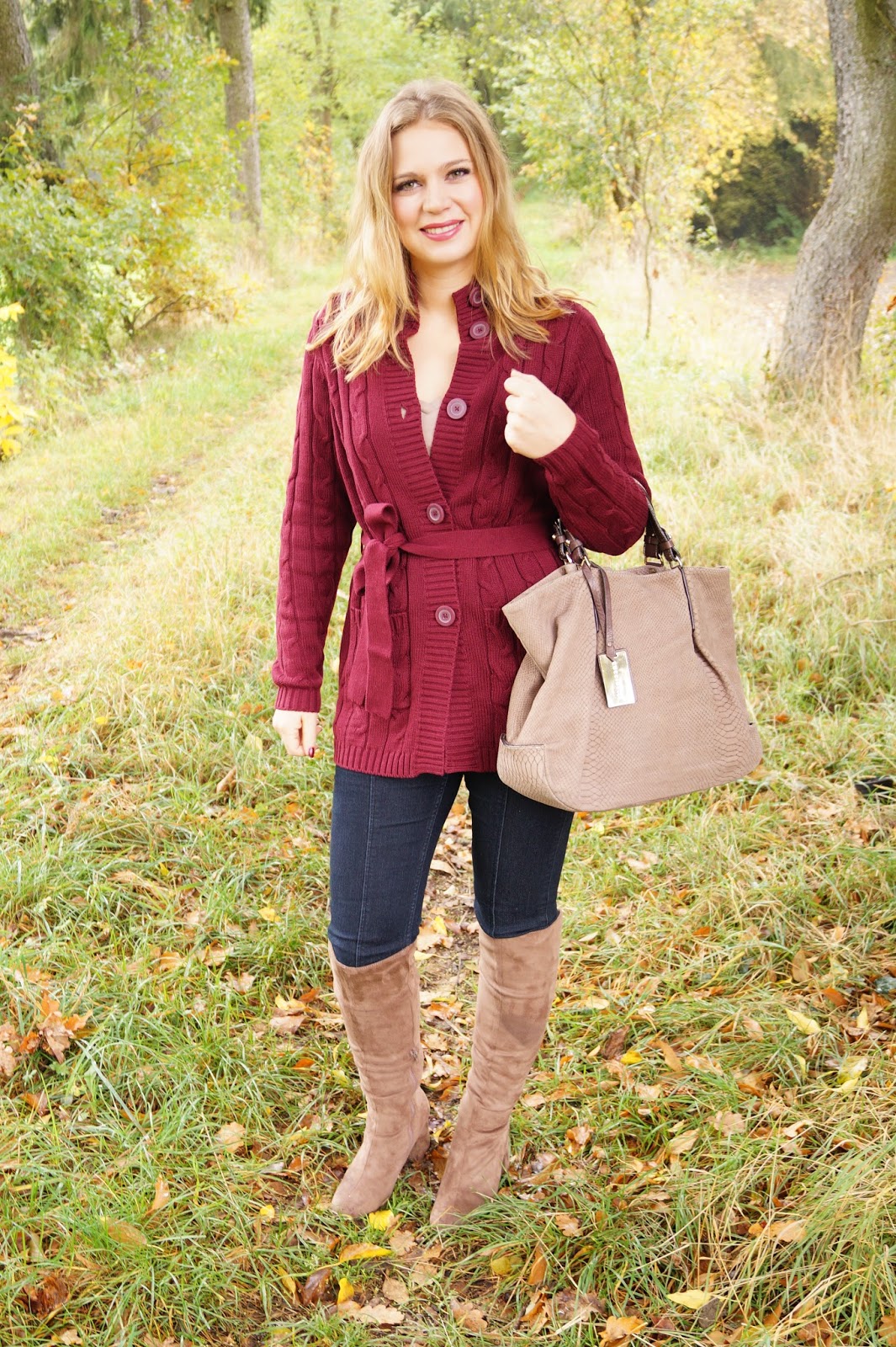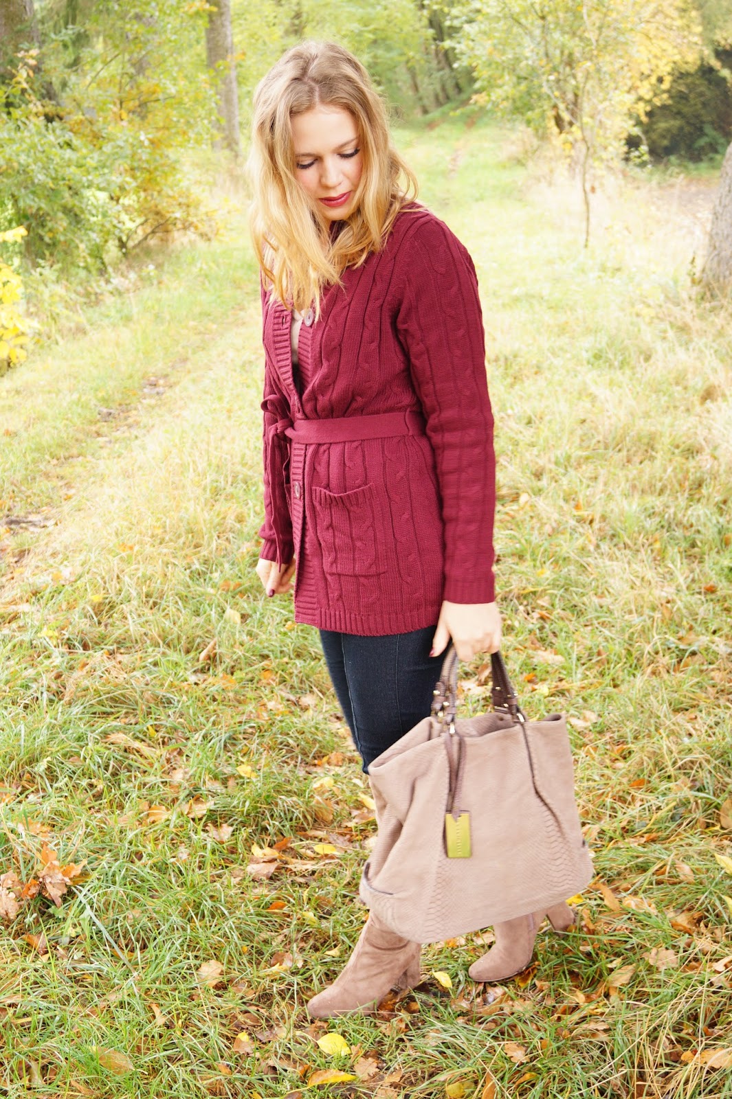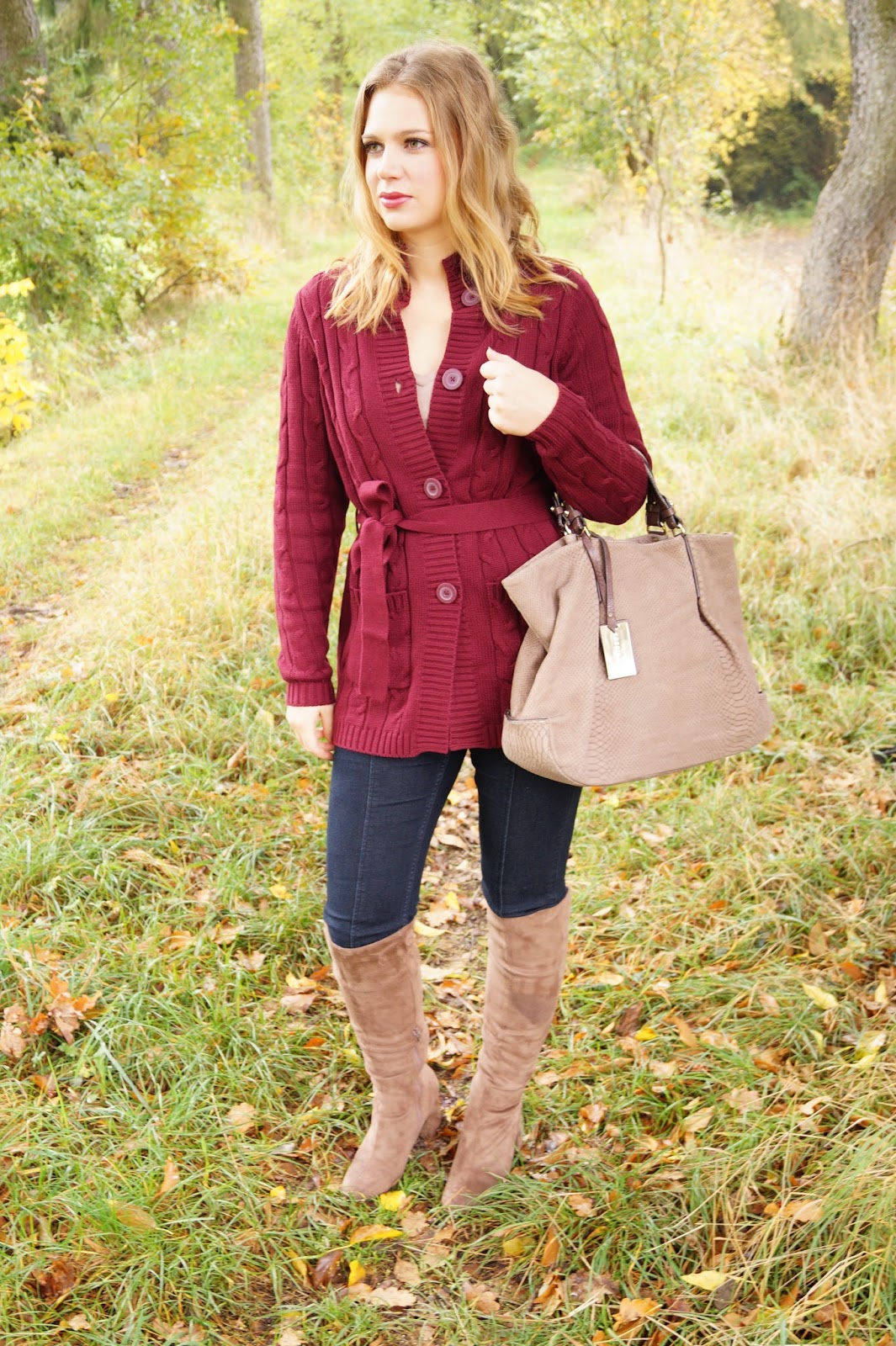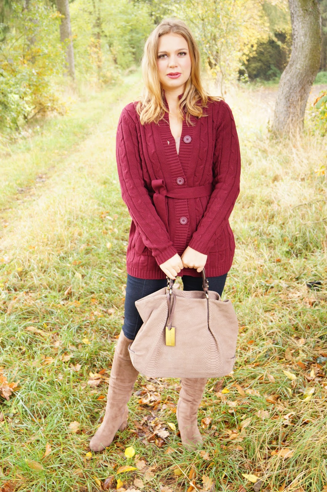 I had been into pullover lately but now I found this super pretty longcardigan in this nice plumy shade (in which I have a matching lipstick from Manhattan too ^^ ). I just love everthing about this cardigan – the color, the neckline, the length, the knitted pattern and of course the price. It is a steal for under 30 Euros. I paired it with a pair of jeans leggins and those brown over the knee boots from Mark Adam which are currently on sale for about 60 Euros. They are just great for the winter month. They have a chunky and not so high heel so you won´t slip away when it is freezing outside and the color matches perfectly with lots of fall and winter colors.