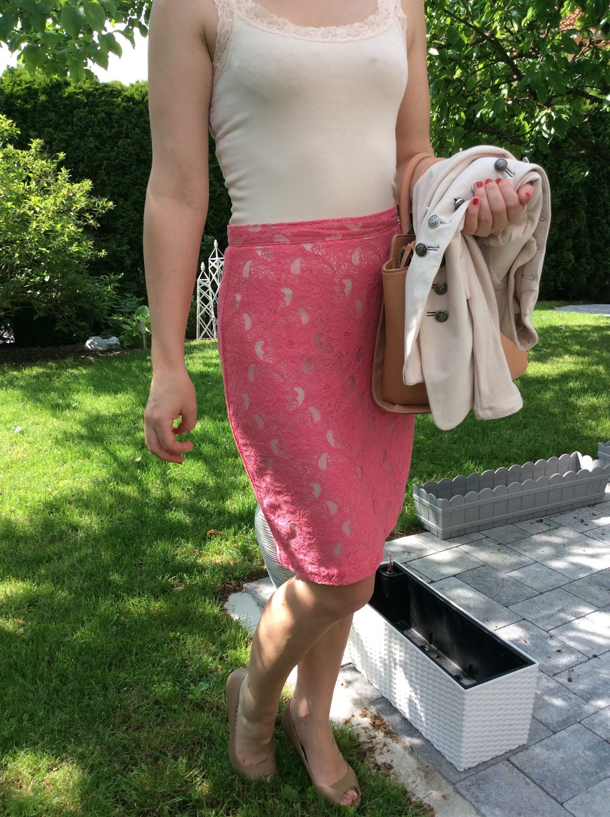 The other one is a creme pencil skirt with a ruffled bottom and a striped button down shirt. I paired it with a thin silver belt and a pair of blue metallic heels.