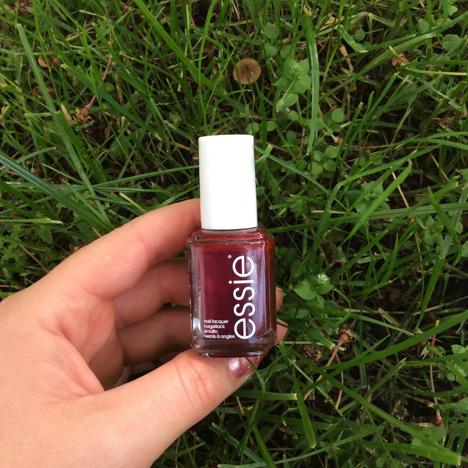 It is an ESSIE Nailpolish. The color is Thigh High – it is a kind of burgundy, dark pink color with tiny glitter particles in it. I like the color a lot. First I thought it would be a more dark red color which I wanted to get first and I had been a little disapointed as I saw it in daylight but it is perfect on my nails. So everything is fine now.