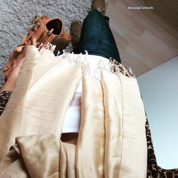 That´s one of my favorite combinations with grey and white at the moment and it was the first time wearing white pants this year. Paired those destroyed H&M jeans with this soft waterfall neckline shirt and a super soft cashmere cardigan and silver pointed heels from Buffallo.
