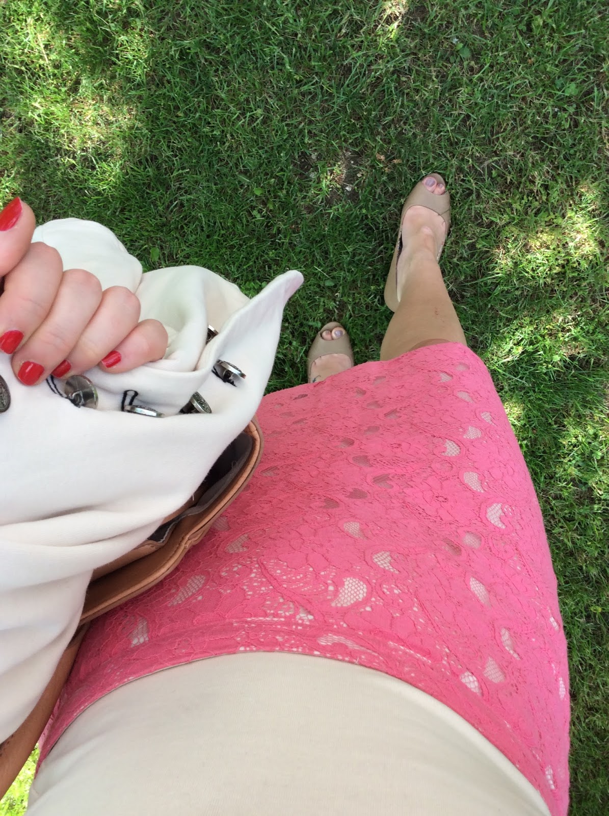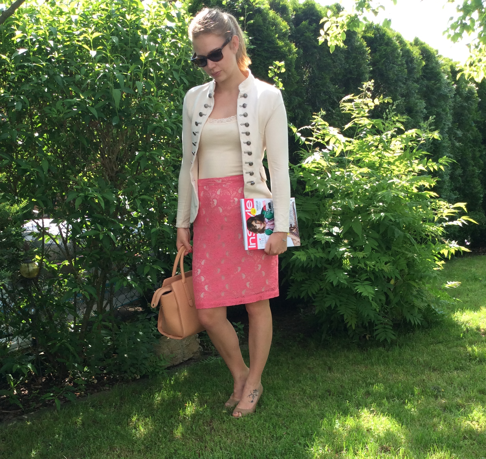 The other one is a creme pencil skirt with a ruffled bottom and a striped button down shirt. I paired it with a thin silver belt and a pair of blue metallic heels.