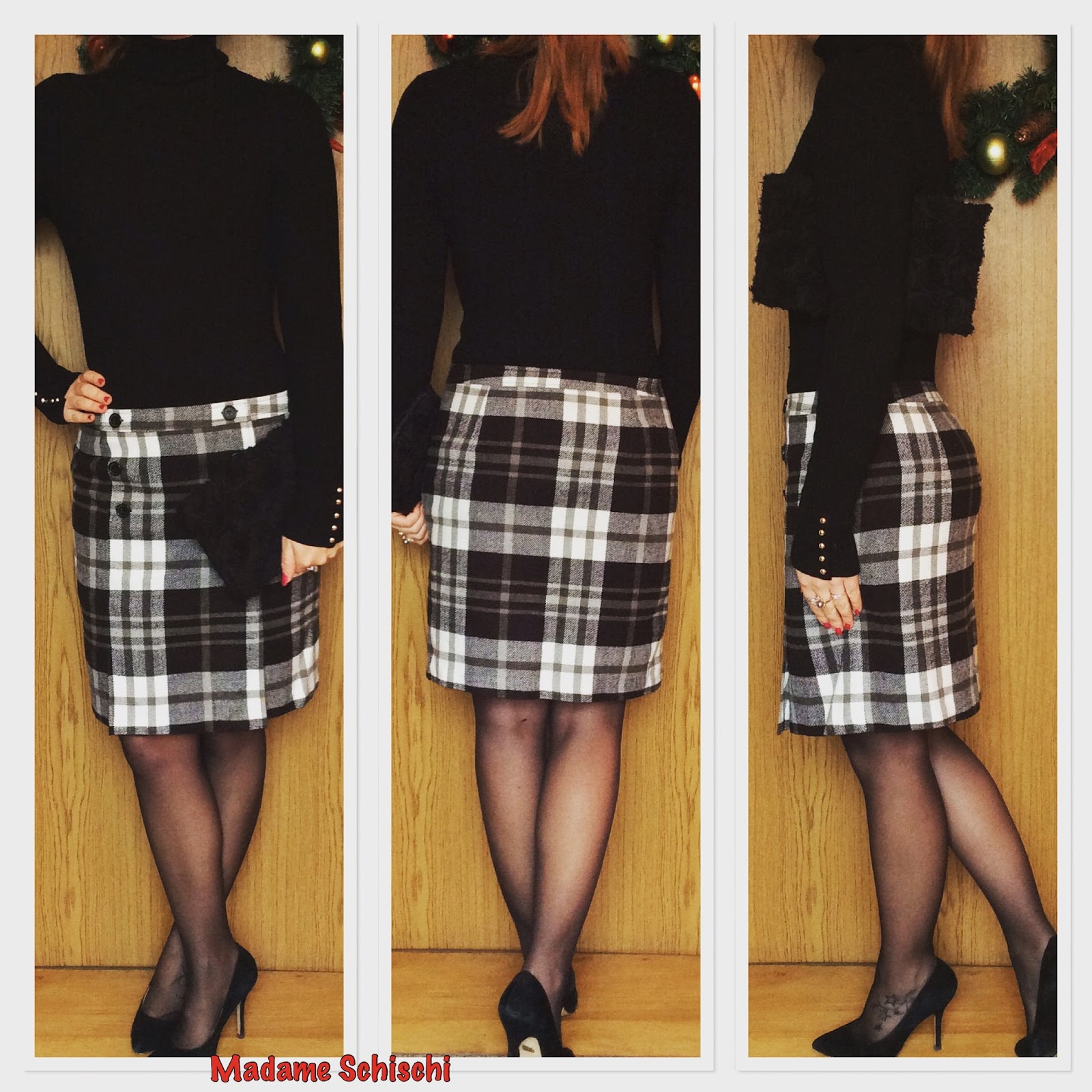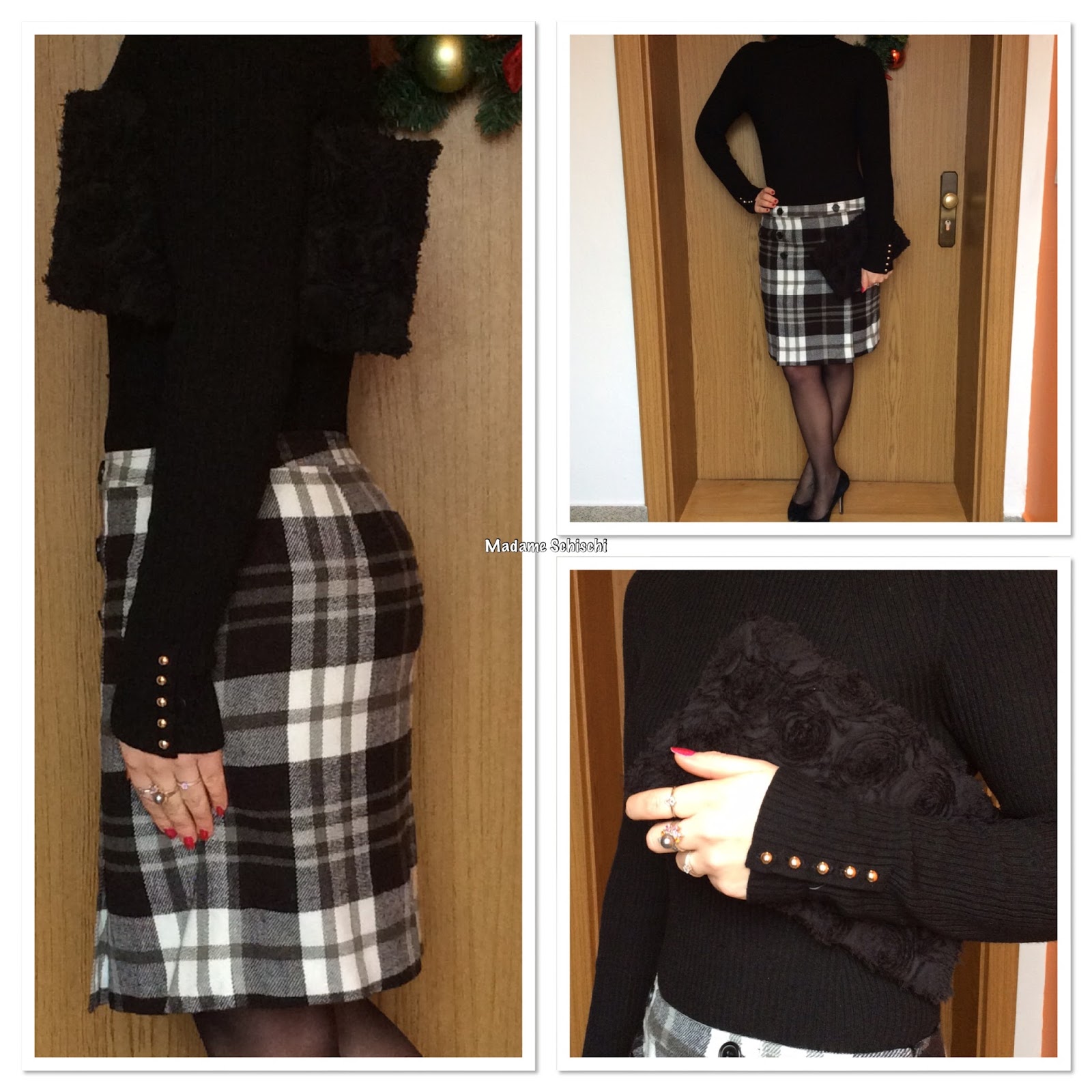 It is a checkered wool skirt and a black turtleneck pullover. The pullover hat cute buttons on the sleeves. The colors of the skirt are off-white to all kind of greys to black.