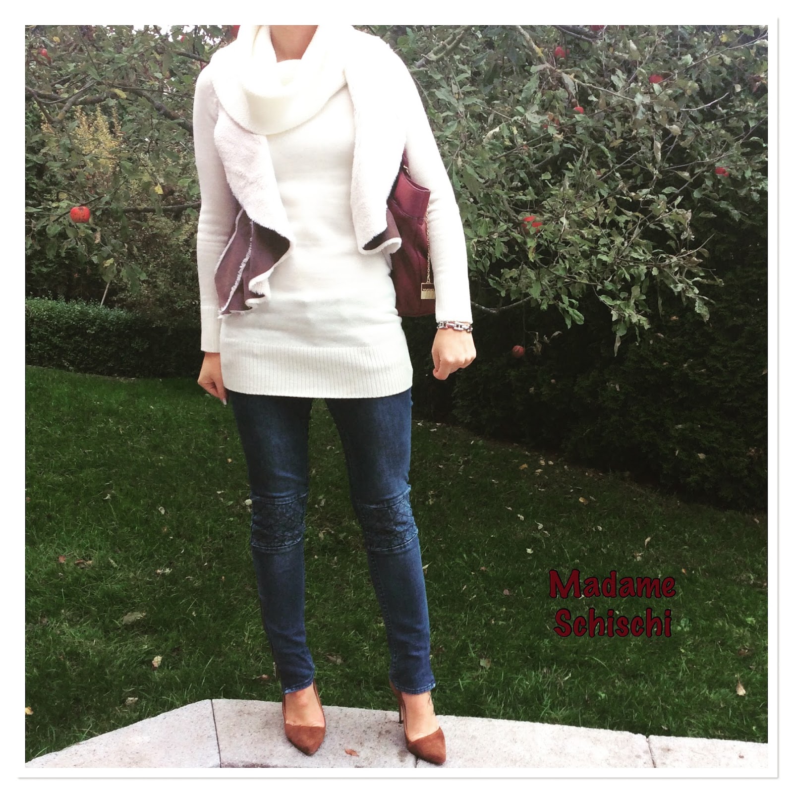 The pullover has a big and soft collar so you don´t need to wear a scarf. The vest is super velvety soft and even softer on the inside. The pointed heels are suede and from Buffalo. Pants are H&M and last season but still a favorite of mine.