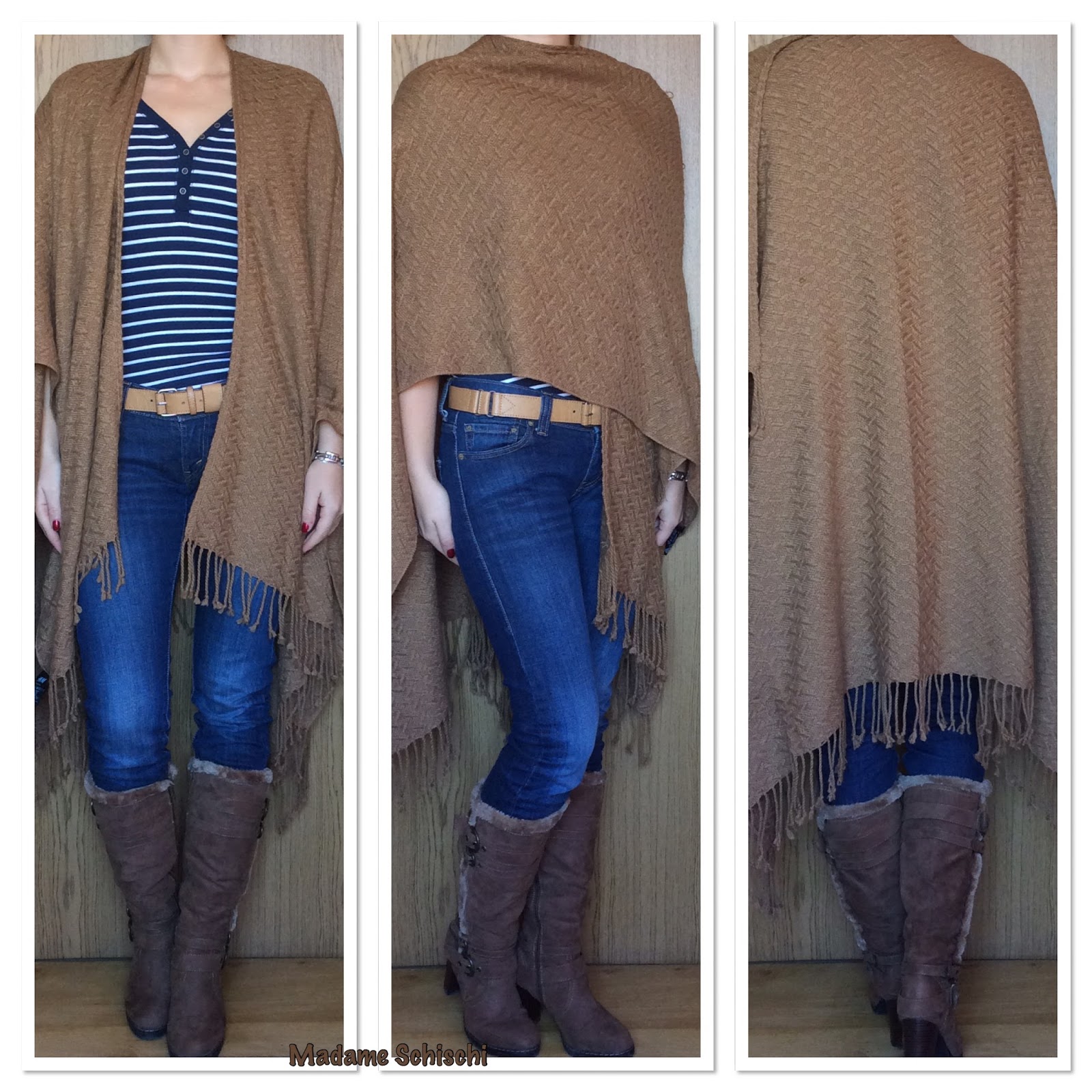 A last and super trendy fall outfit – wearing a striped shirt and a matching poncho. I paired it with fake fur booties, Levis jeans and a belt.