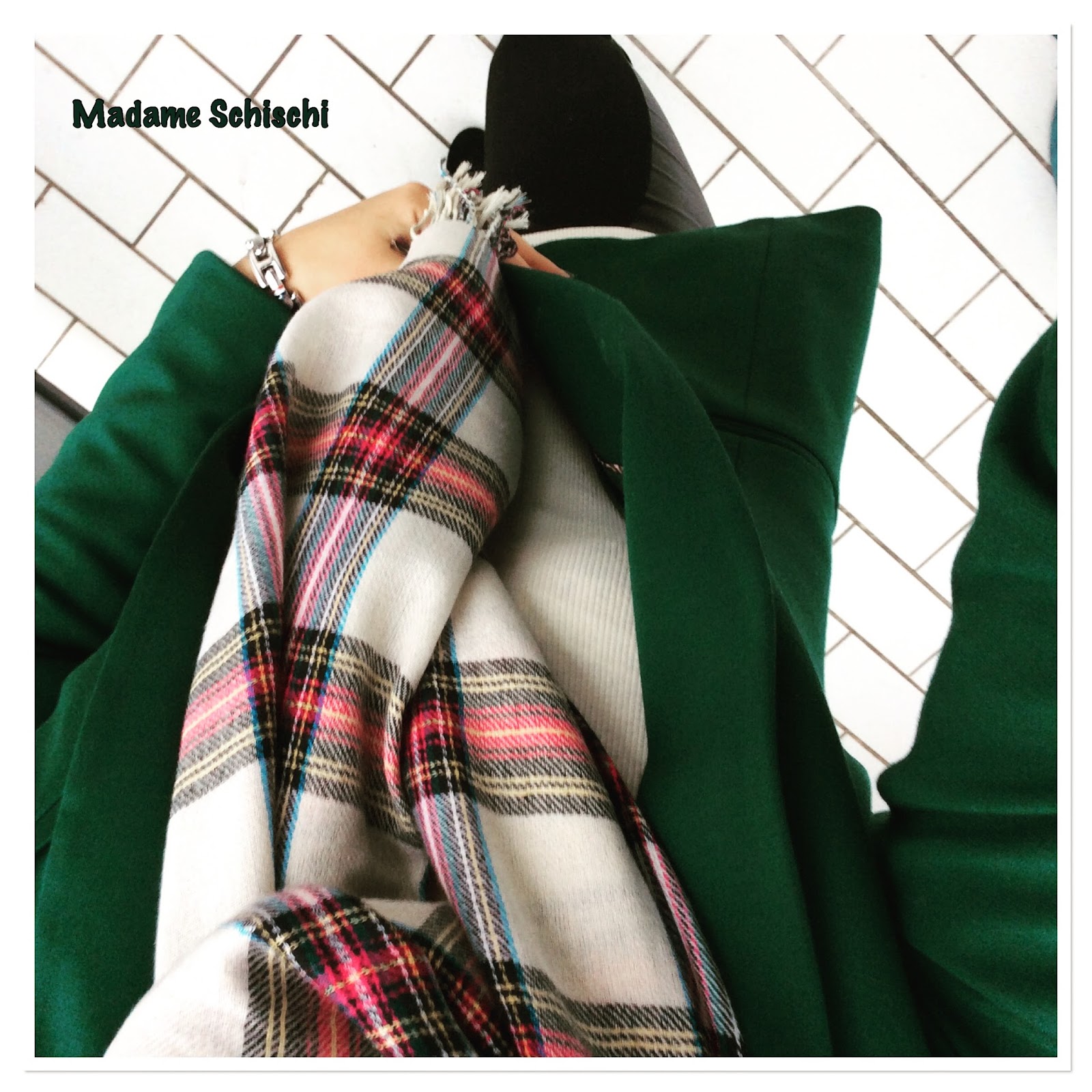 Liked this one a lot. The green color is so trendy for fall and winter time and of course the plaid scarf is a fall highlight too.