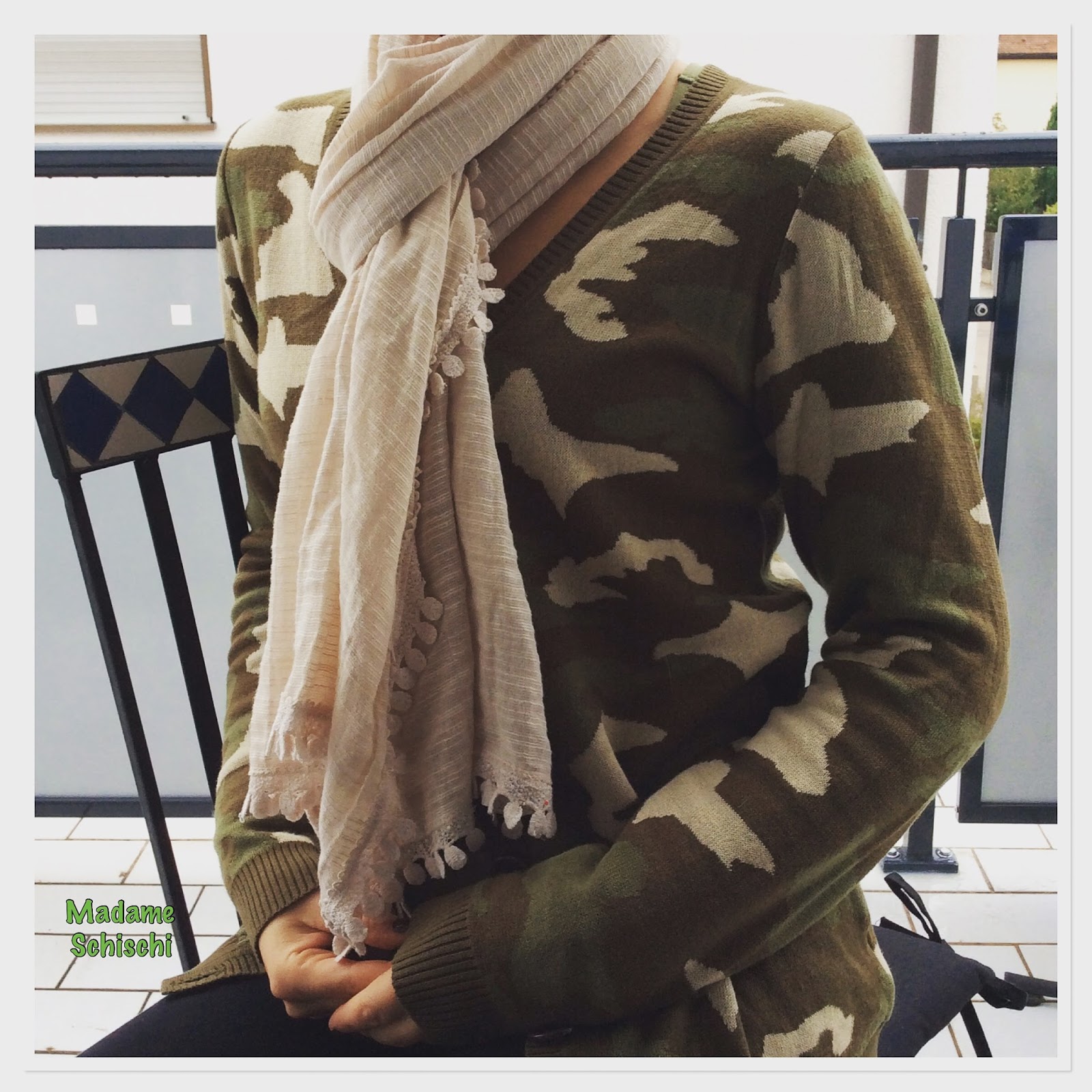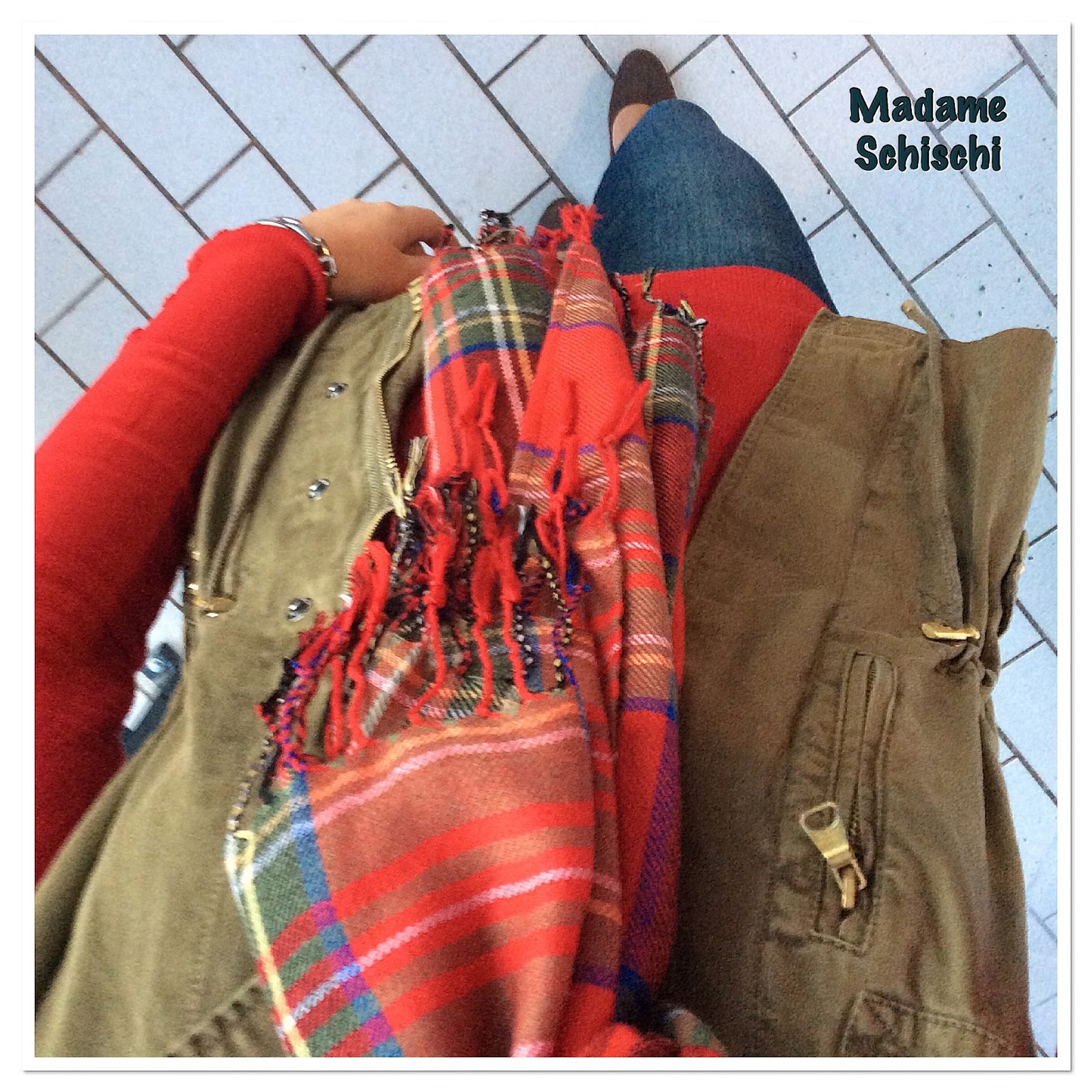 This was one of my favorites. I love the green military vest from Zara – and of course I paired it with a matching red plaid scarf and pullover. Combined it with a pair of boyfriend jeans and oliv green Tamaris pumps.
