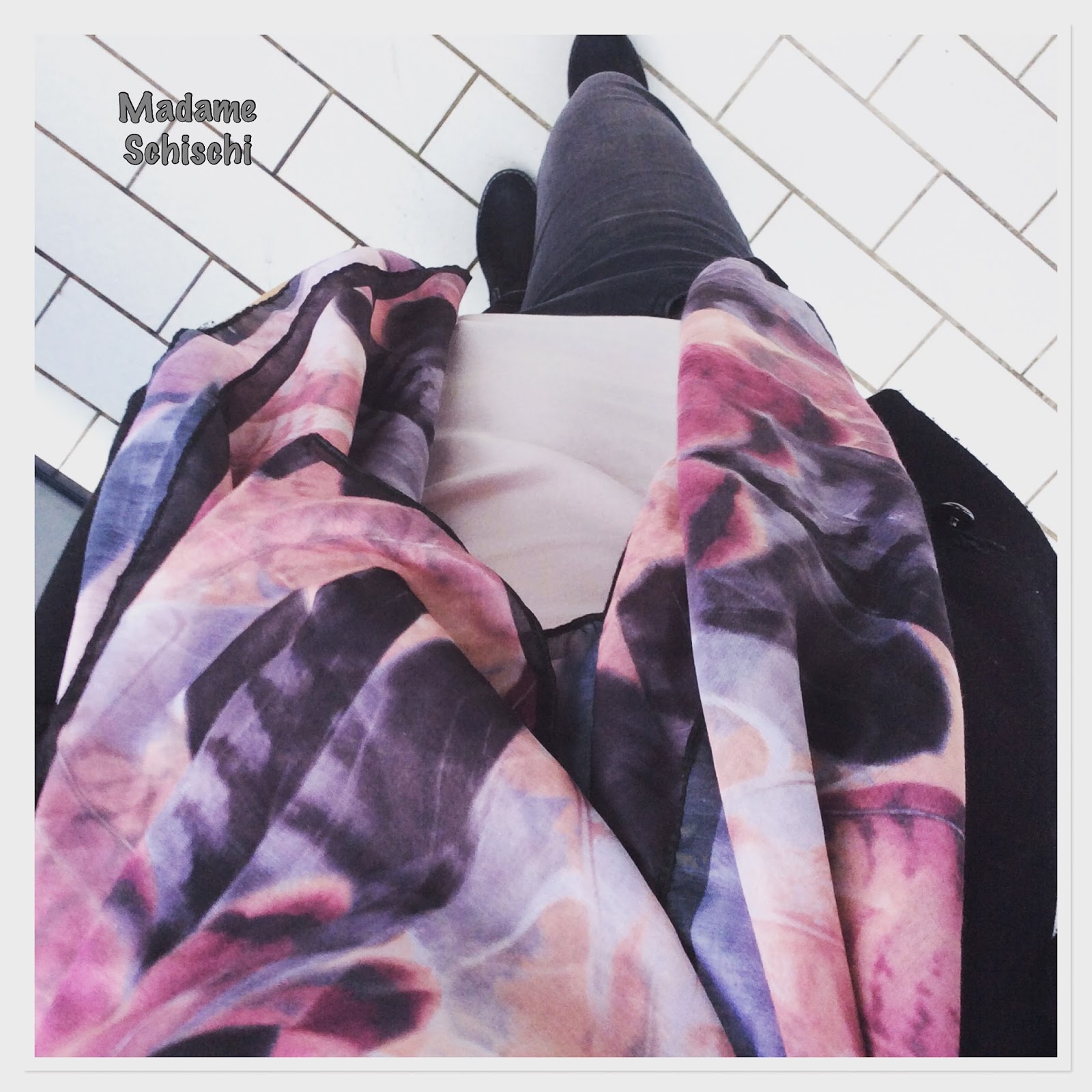Love the batic pattern with all the different pink tones. I paired it with a light pink shirt and military style blazer – leggings and black booties. Also wore a matching head band but you can´t see this one in here.