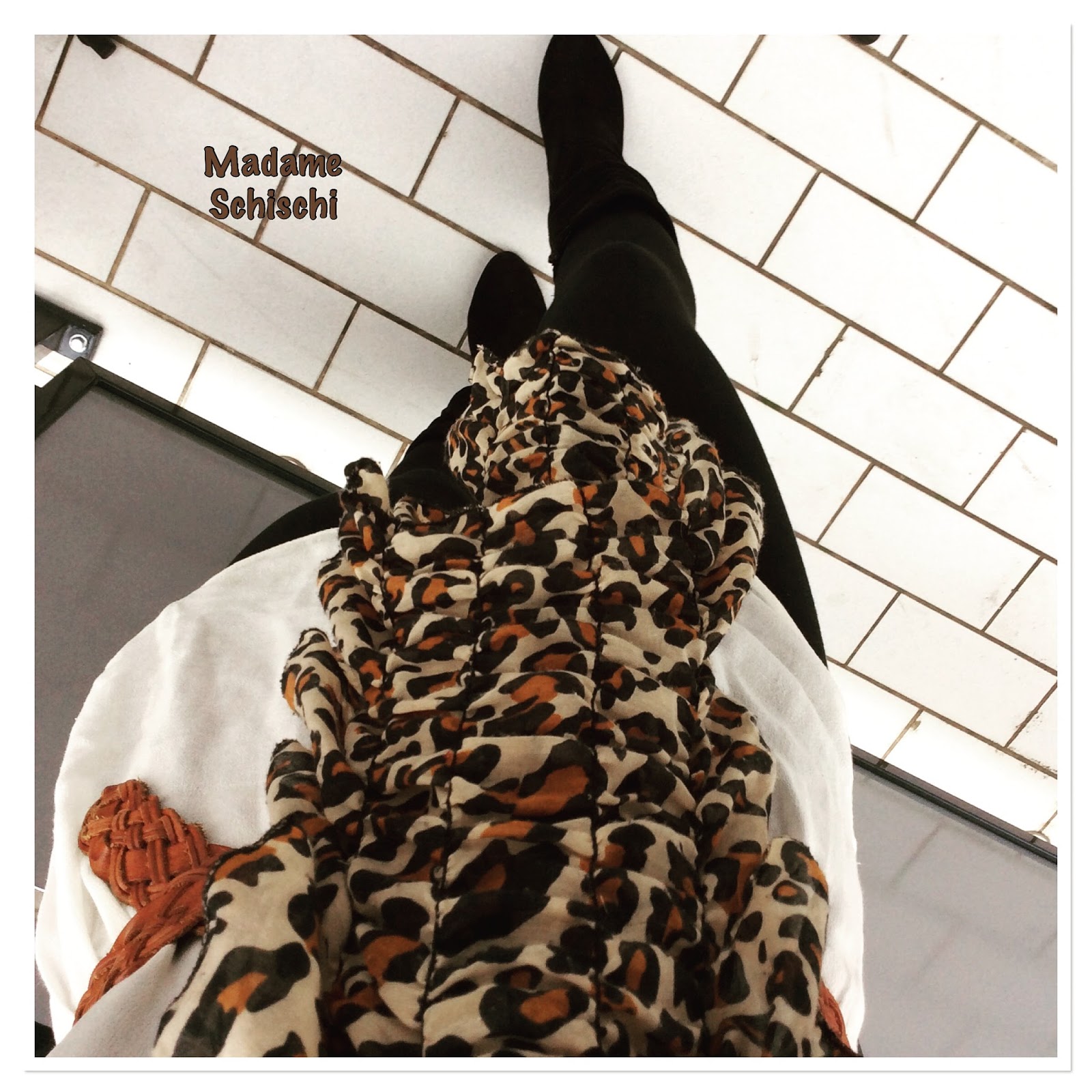 Here is one of my work oufits. I mostly wear blouses or button downs and black. This was a long blouse – I had also worn a belt around my waist but you can not see it that good in the picture. And of course a piece with a pattern. I always need one thing with a pattern but you might know that already.