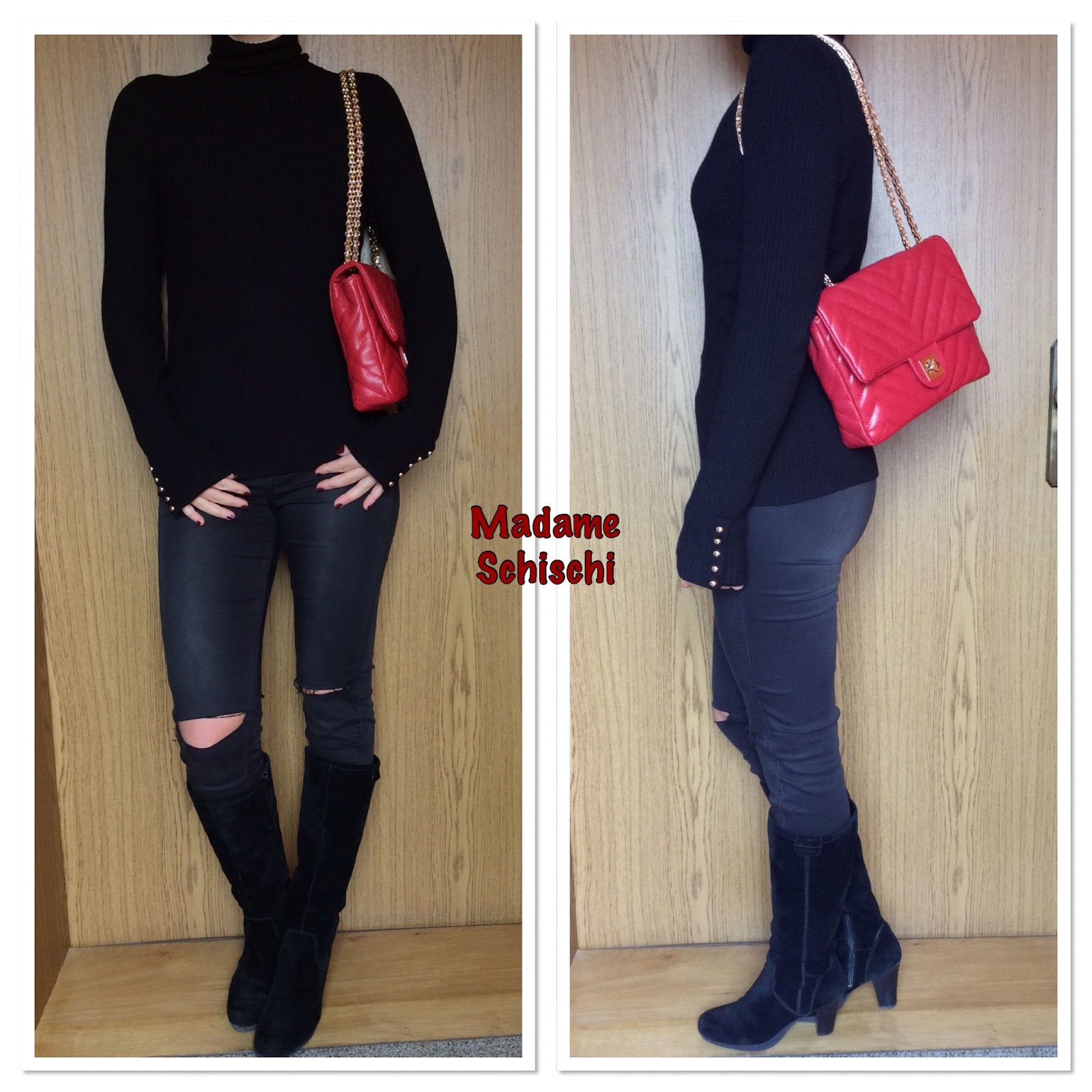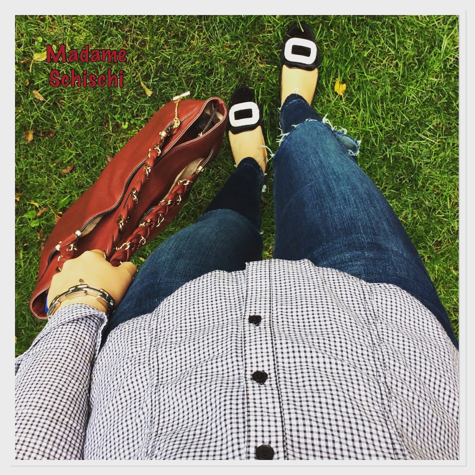 Had worn this last week for visiting my parents. A checkered button down and destroyed pants. Velvet slippers are Buffalo. Shopper is DKNY – my favorite color, guess you all know