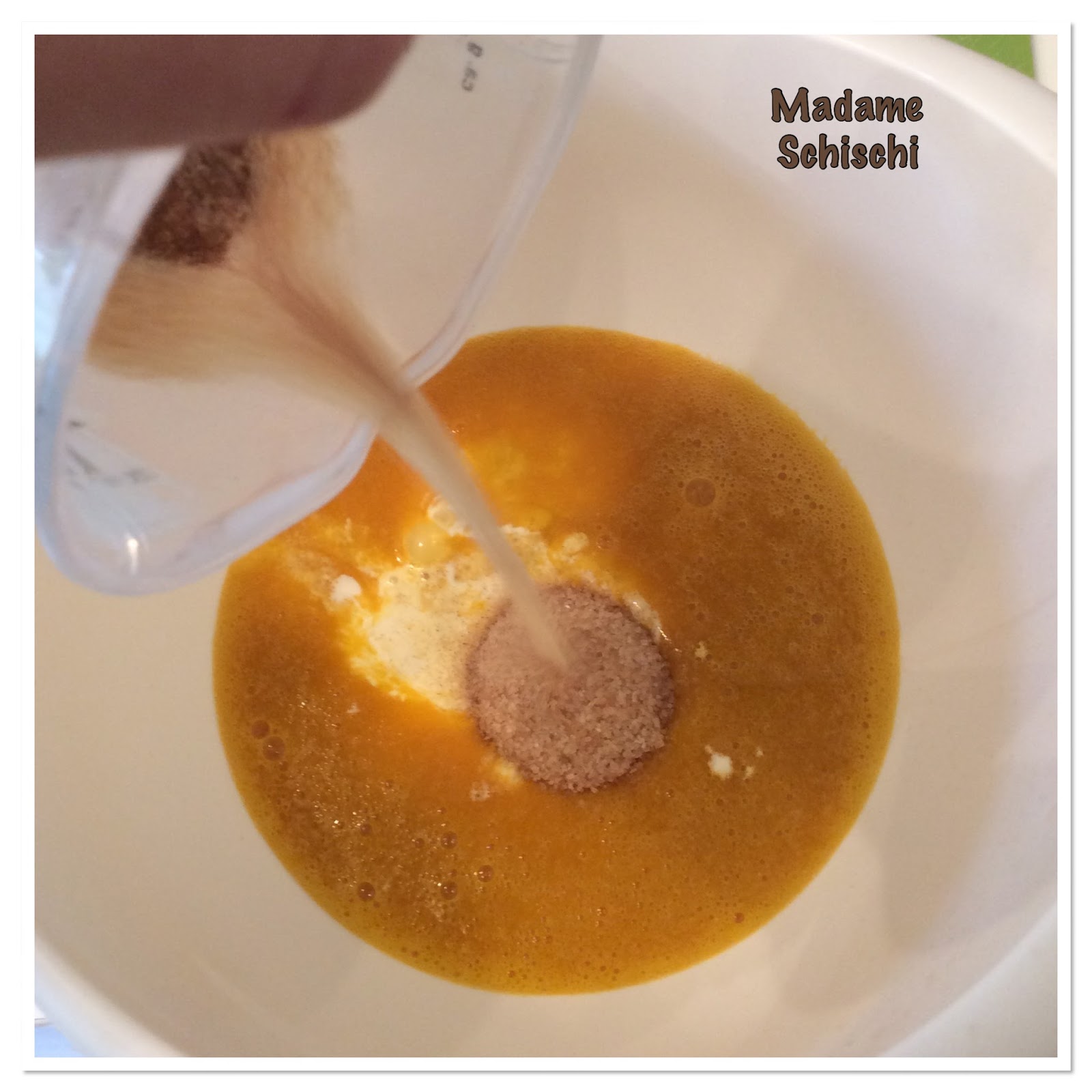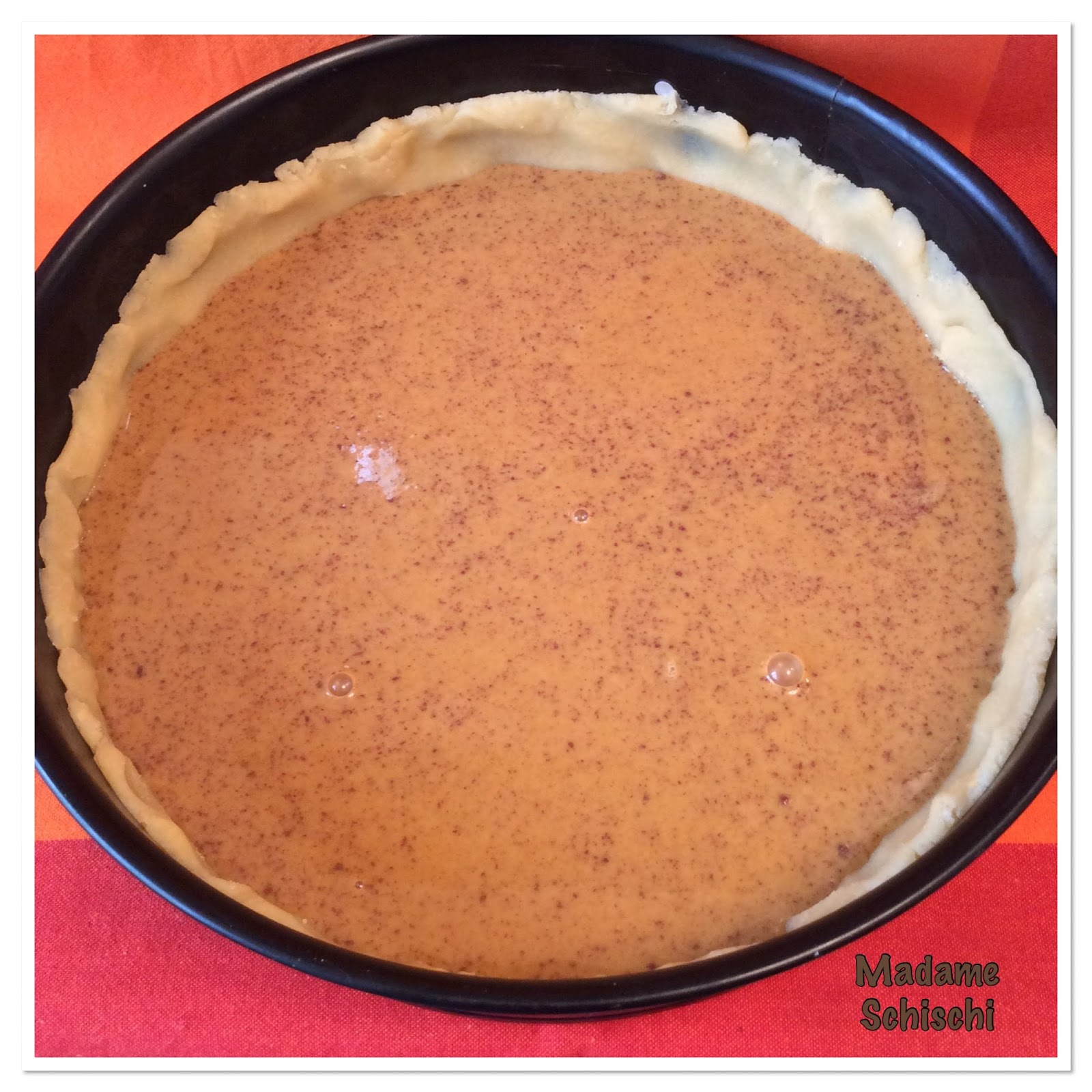 Pumkin – you need the pulp – so take out everything and pull out the seeds to use it until you got about 350 gramms. Mix all the other ingridients in a bowl and put the pumpkin puree to it. Put the filling into the cake tin with the raw dough.
