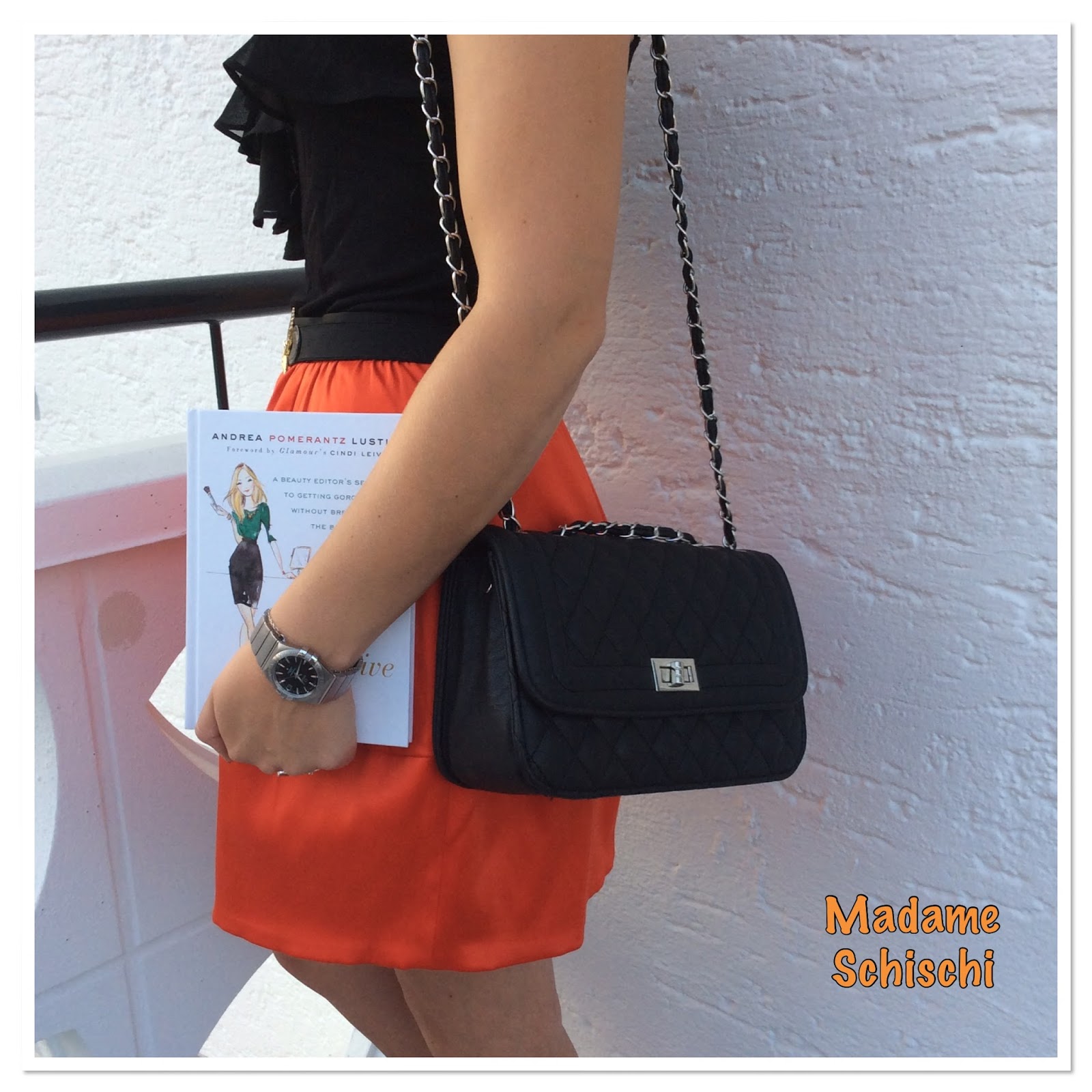 Here is another outfit I had worn during this hot week – but it reminds me a little of Halloween. Maybe of the black and orange combination. The skirt has a underskirt with tulle to make it more puffy. The top has some cute ruffles in the front. It is H&M and my Omega Constellation Watch.