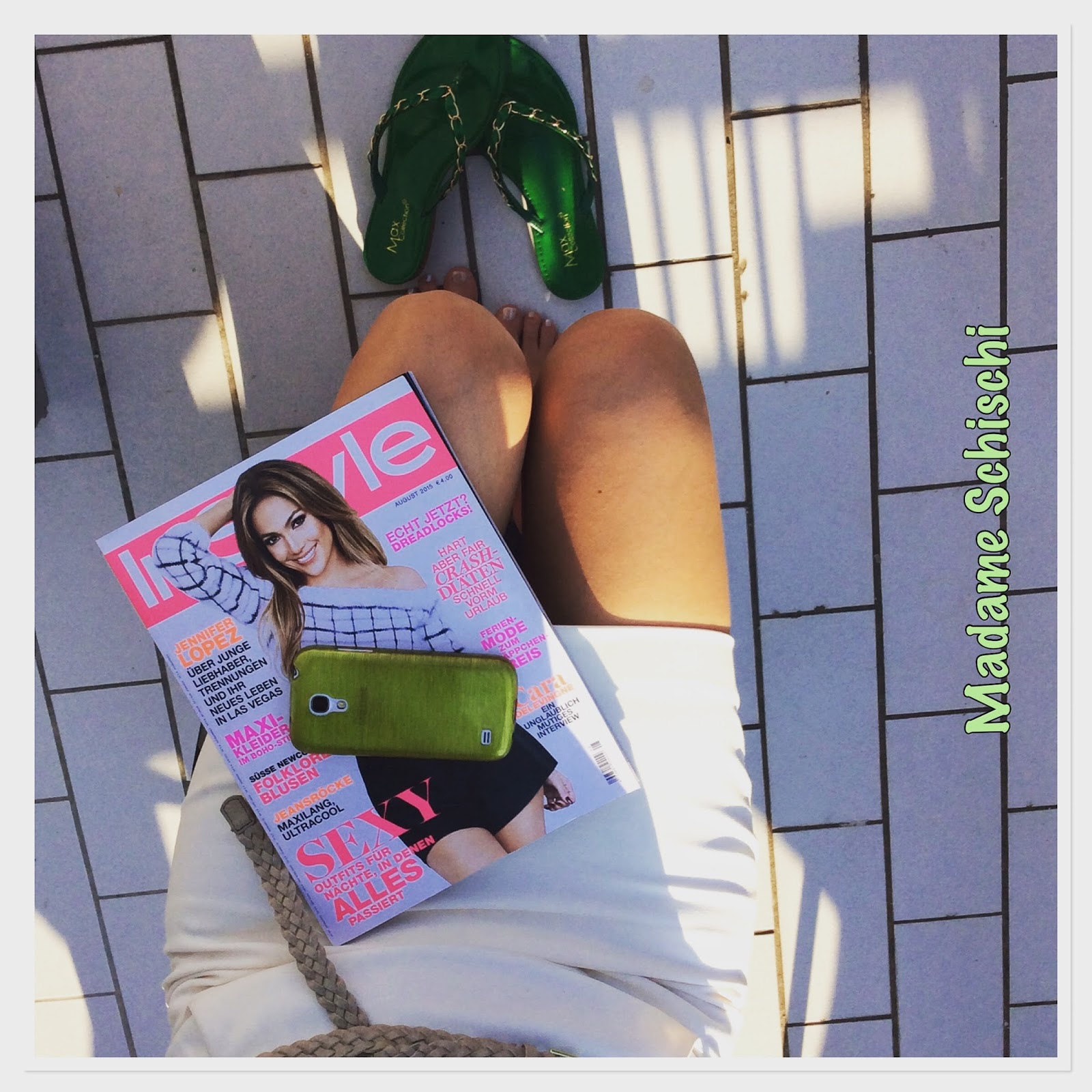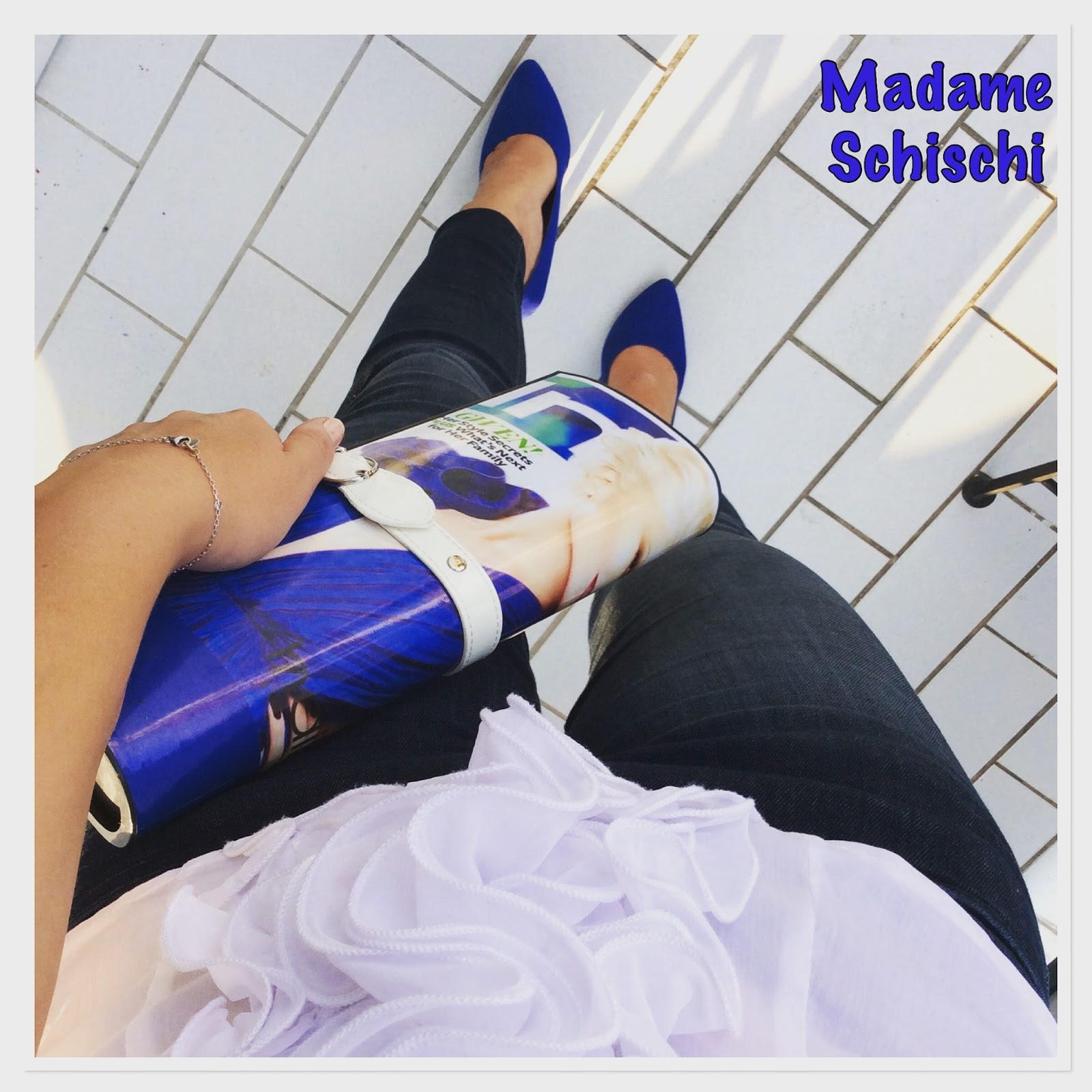 The clutch has the cover of the Instyle magazine as pattern. Such a cute idea. My mum got me this one from her Italy vacation as a gift. The shoes have the same vibrant blue than the bag. Pants are H&M super low and super skinny – whatelse. The top is a white neckholder one with lots of ruffles in the front. You all know I am so in love with ruffles.