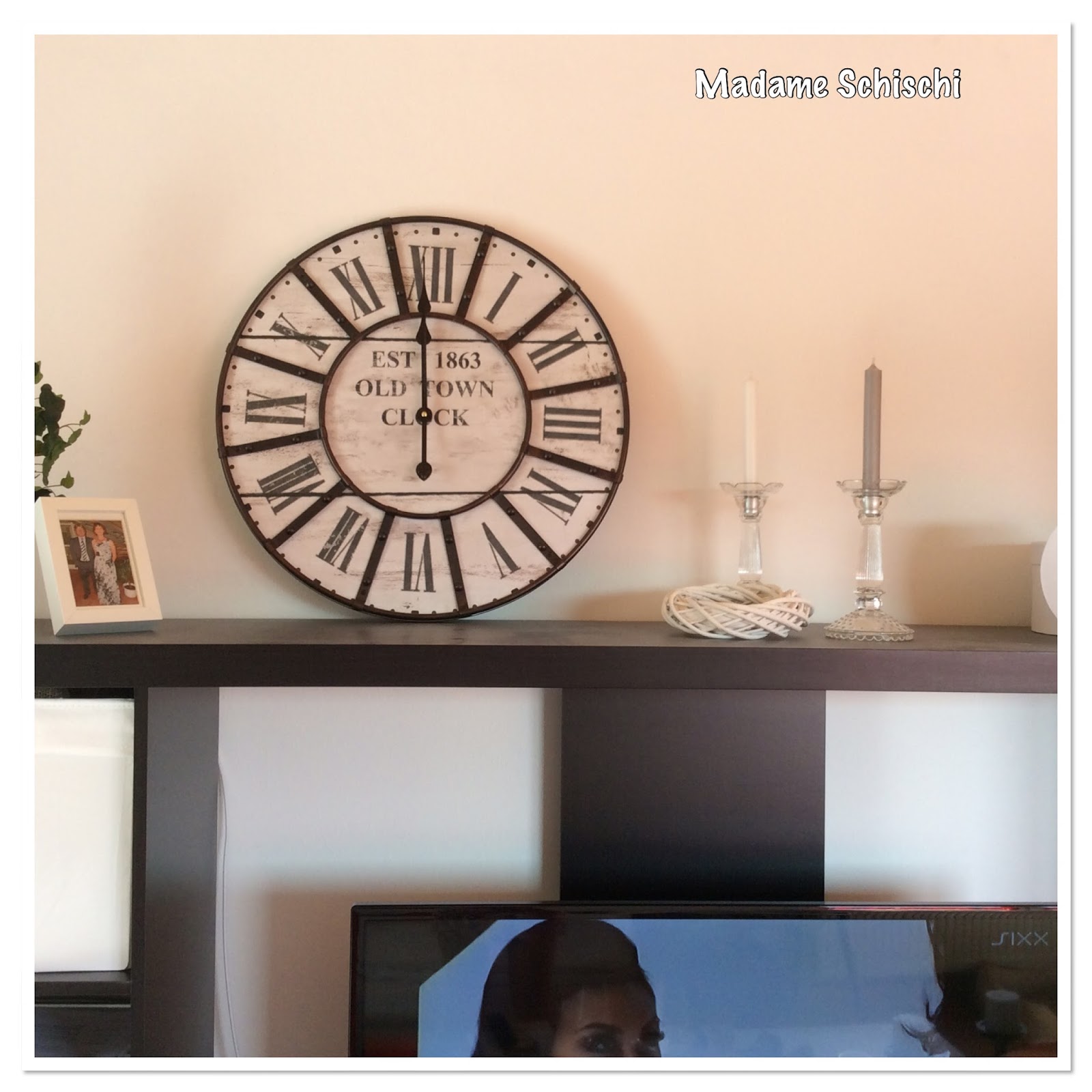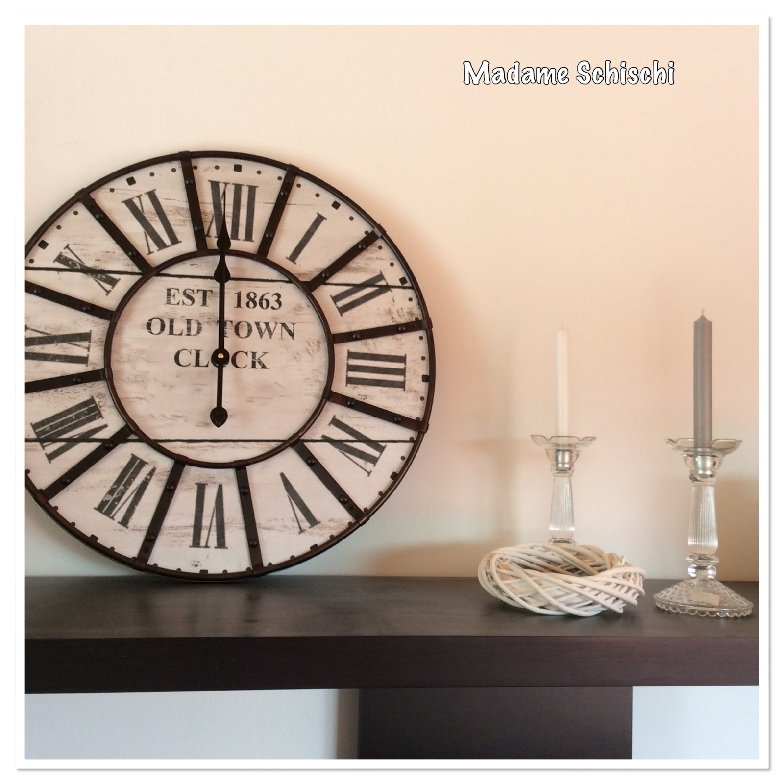 I found the clock at an online shop. Saw it and loved it. Purchasd it immidiately. It has an iron frame in black and the clock itself is painted in a dirty white color. The pained fonts and numbers are partly faded.