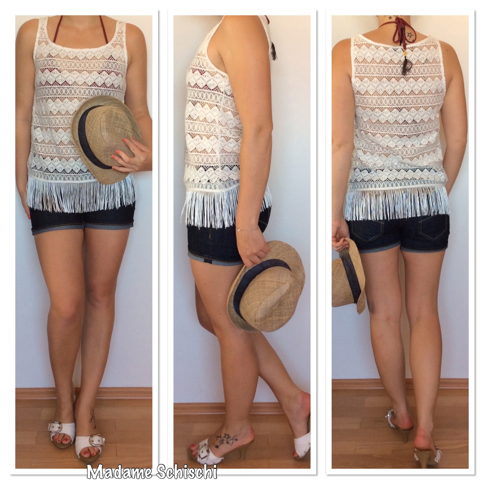My favorite festival outfit. Paired some dark denim shorts with a triangle bikini top with tassels and a chrochet top in creme white with those awesome fringes at the bottom. Love this one so much. It it so great. White clogs for your feet.