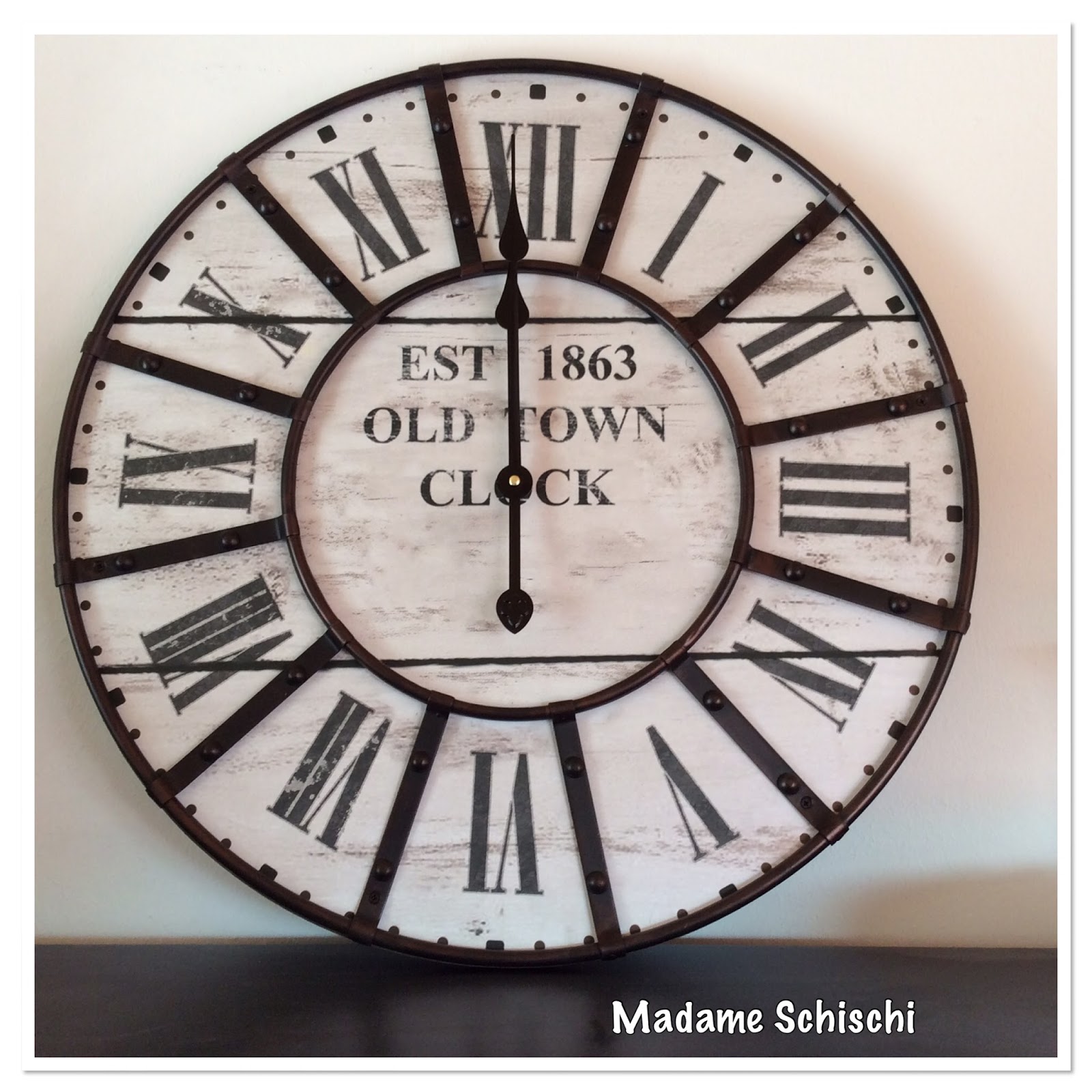 I found the clock at an online shop. Saw it and loved it. Purchasd it immidiately. It has an iron frame in black and the clock itself is painted in a dirty white color. The pained fonts and numbers are partly faded.