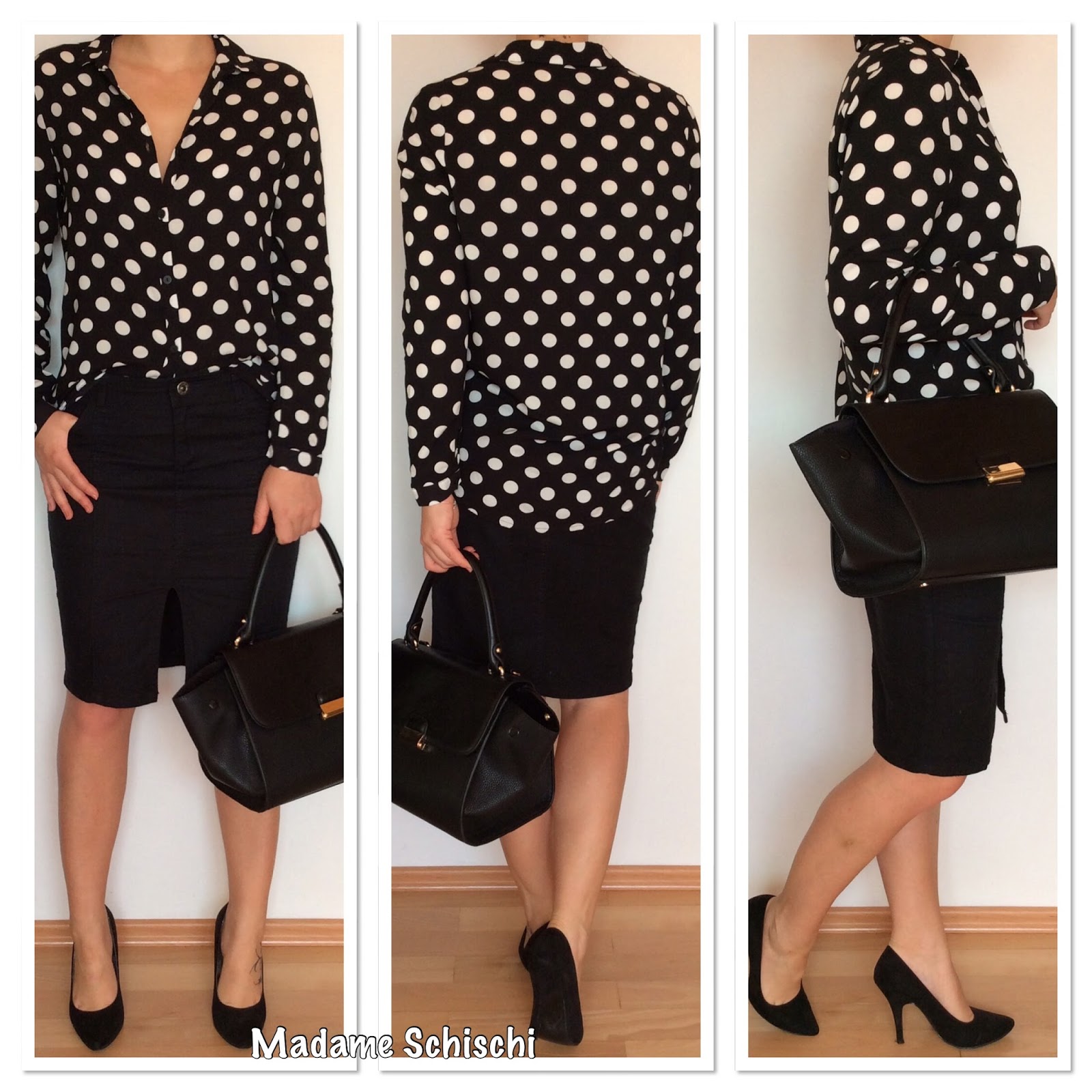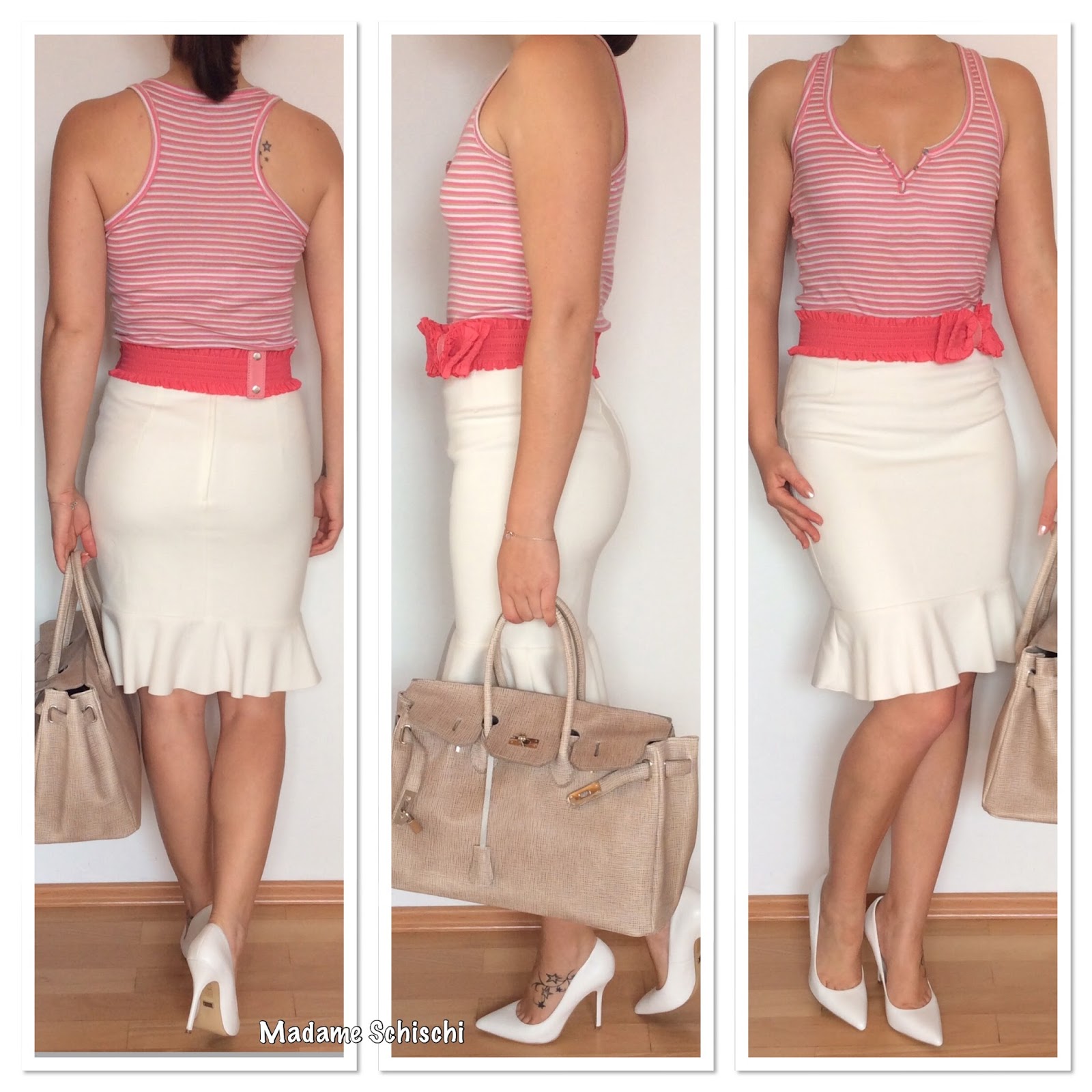 This one is also pink and creme white. I kind of love this combination at the moment. The skirt is so great. It might be a little to thick for summer but I dont really care about that. It makes a great body shape and it is highwaisted so you are able to put a shirt into the skirt. You can wear a belt on your waist to set a focus. The top is a basic one. You may get a striped one at almost every store this time. The shoes are walking on clouds soft pointed toes from Buffallo.