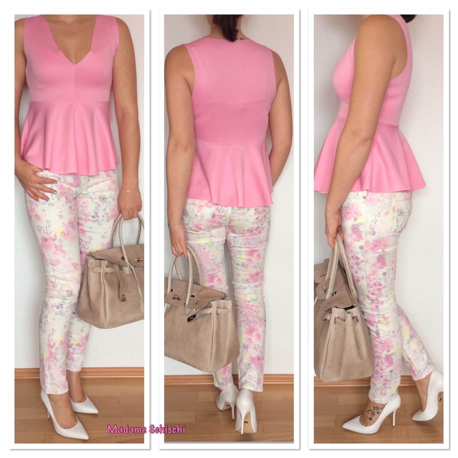 It took a while for the first outfit to come to live. I had these pants quite a while but nothing to combine… well not nothing but nothing that felt right to it until I found these gorgeous pink peplum top. Is is kind of a strong neopren material. It feels great on the skin and also forms yours body a little. And to add the ultimate summer color white I paired it with Buffallo pointed toe heels in white. The leather is so soft. It feels like walking on a clouds.