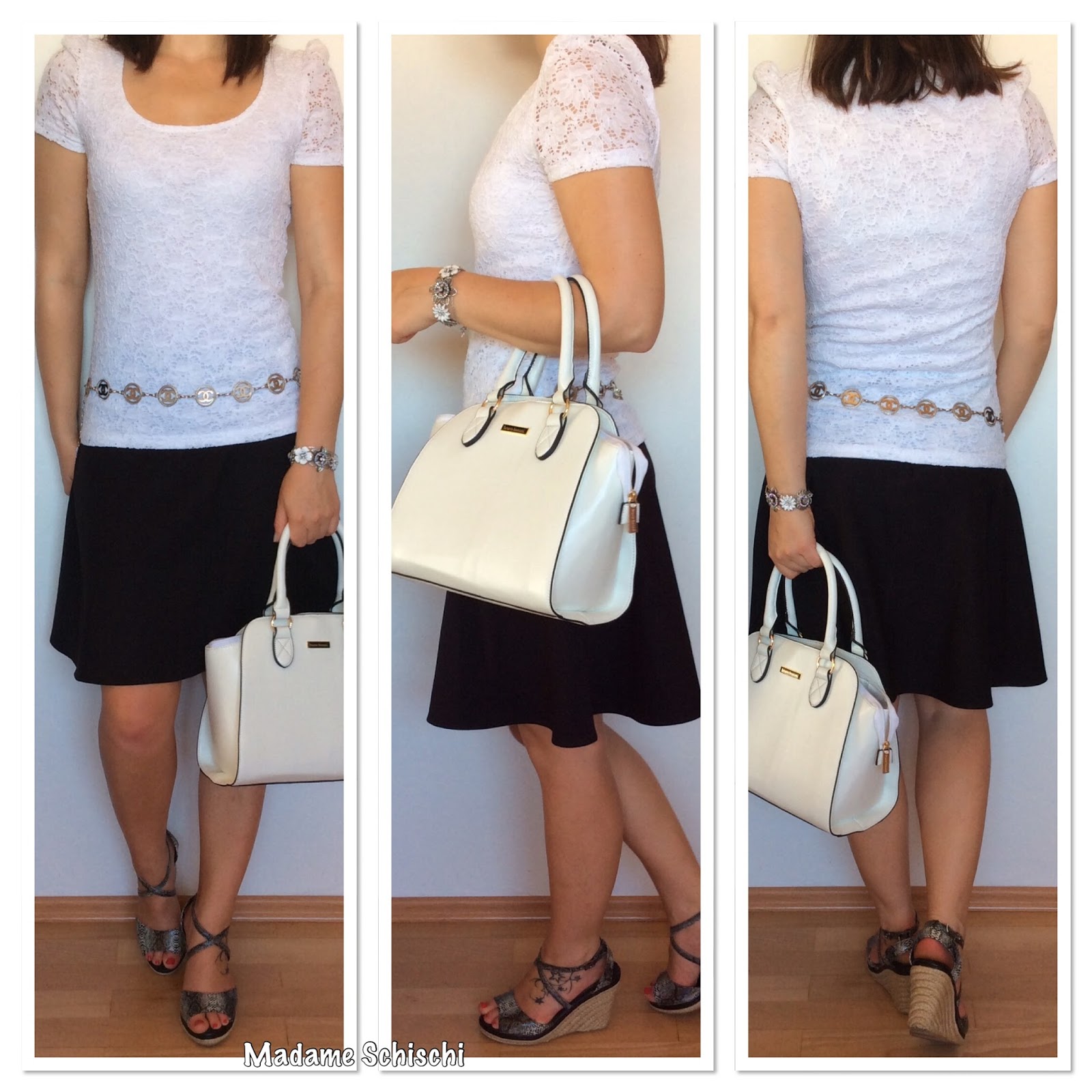 This one I have worn at work this week. A nice alternative to a summer dress. The white lace shirt is light for summer. The pattern on the shirt are little flowers. The skirt is a flared skirt. My favorit style for summer. It swings with every step you take. I do like this a lot. The bag is my only white bag so that is the reason I am mostly wearing this one in the black and white series. And this bag was very hard to find for me. I have ordered a lot of different ones but I didn´t like any of them until this one. Finally because I almost gave up on this problem.