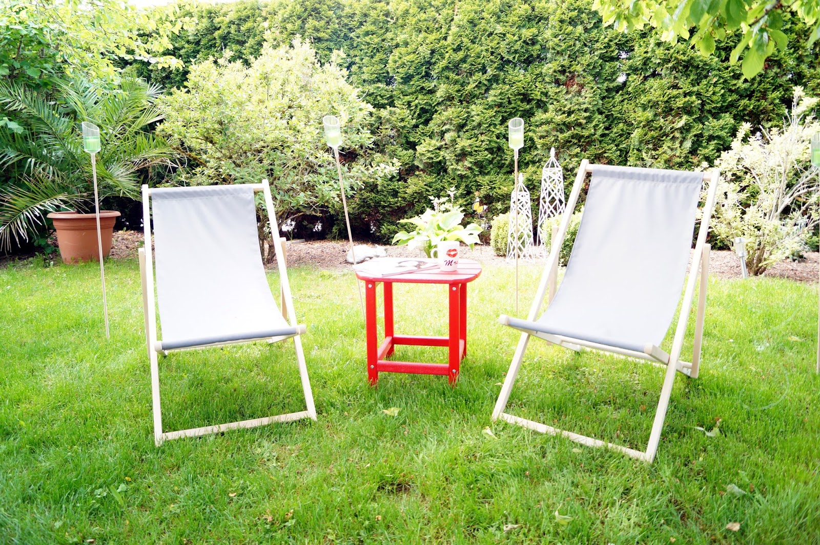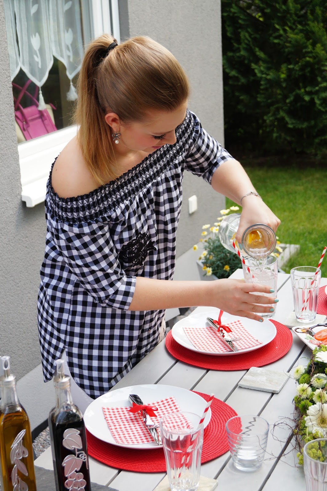 Table Ikea / Chairs Ikea / Bench Ikea / Cushion Ikea / Plates mömax / Glas mömax / Coasters made from a set of small tiles from the hardware store / Coasters red Galeria Kaufhof / Napkins amazon / Oil and Vinegar dispenser amazon / Salt and Pepper mushrooms from Italian market similar here / Straws Nanu Nana / Carafe Nanu Nana / Deckchairs amazon / small red table Polywood similar here and here / Torch DM similar here / Solor flamingo Nanu Nana / Flower stairs old love this one / Plant pot old similar here