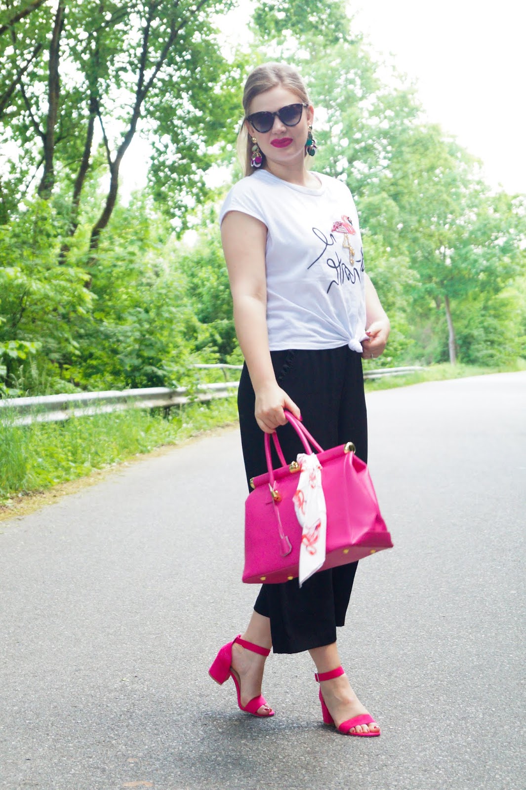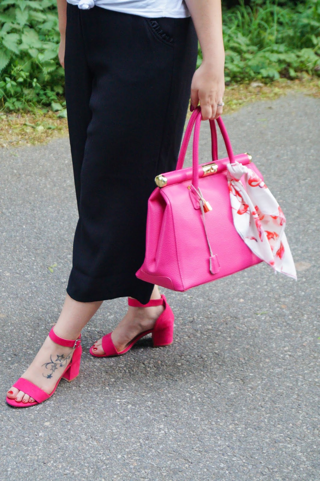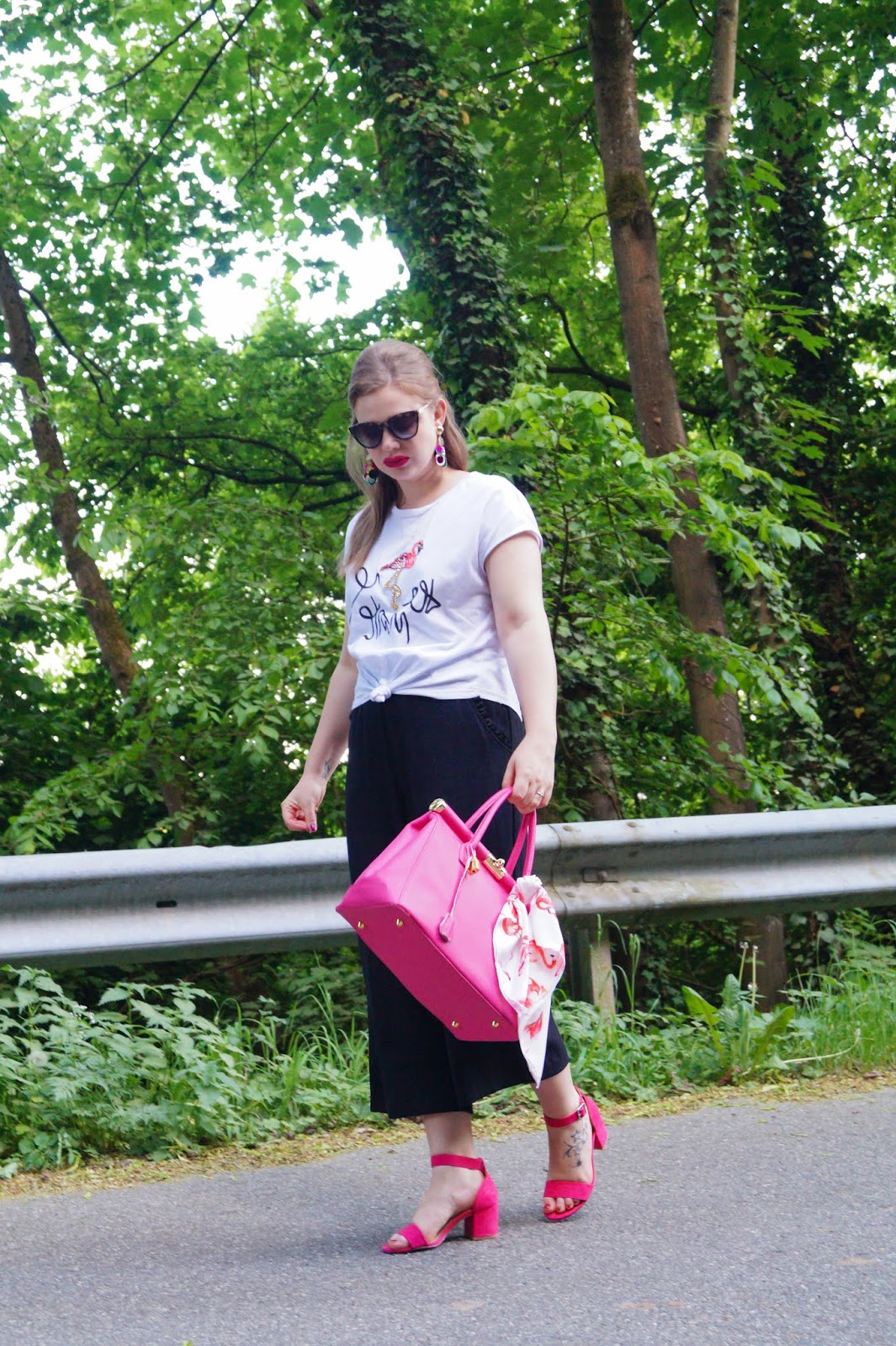To go on with the color sheme of the pink flamingo in the shirt – aren´t flamingos still so adorable ?? – I went with a pair of pink sandals and a matching bag. The little scarf tied onto the handle of the bag is last season but since these scarves became so popular I bet I can find a simlar version to it.