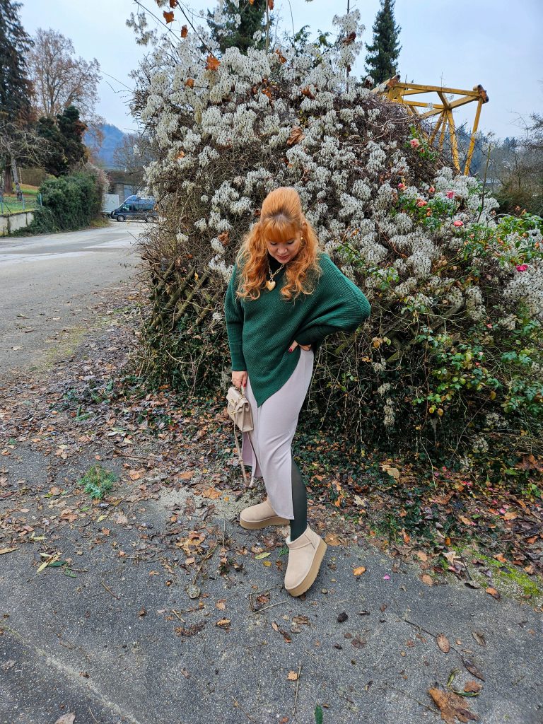 You can shop my exact UGGs here / Green poncho sweater is from Halara color is called Eden / necklace Bijou Brigitte