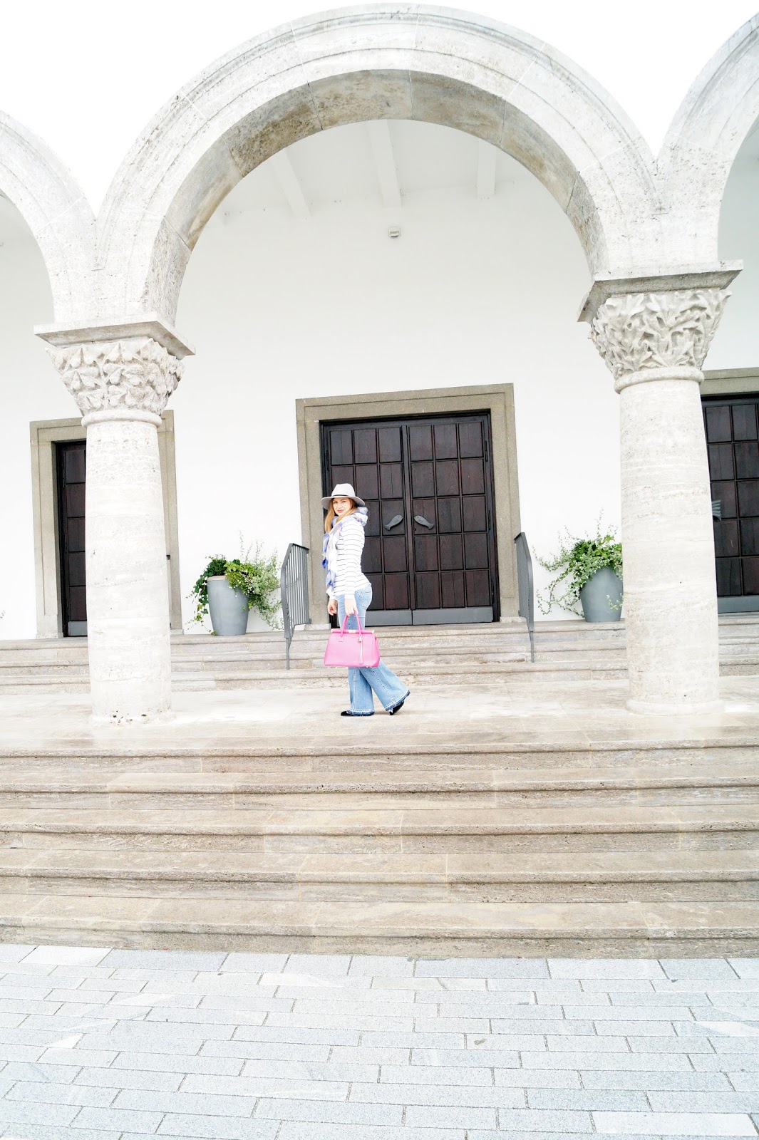 I combined this flared pant with a raw hem to the outfit to create a silhouette, as the scarf was pretty bulky. To round up the look I added a grey felt hat and a matching pink leather tote bag as I love adding a splash of color to my outfits.