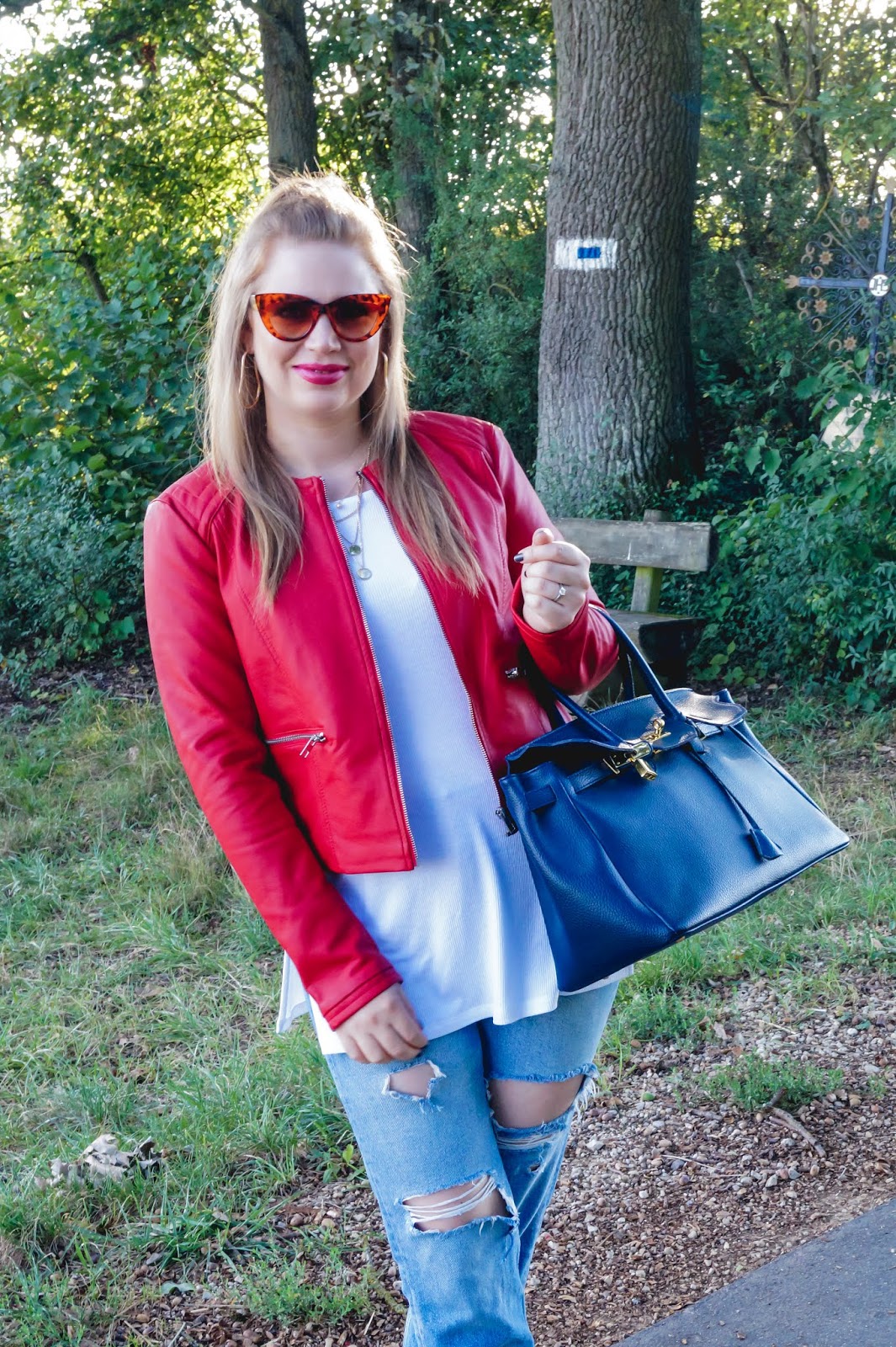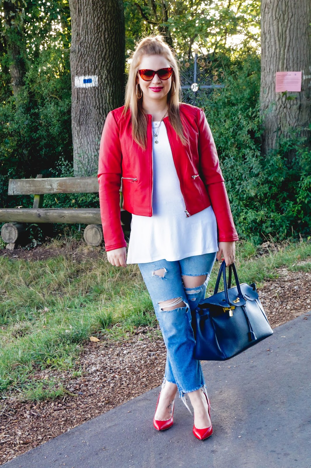 red leather jacket sold out similar here and here / denim even & odd sold out similar here and here / white ripped shirt Asos sold out similar here and here / sunnies Sunice / heels Buffalo sold out similar here and here / bag old similar here and here / layered necklace H&M