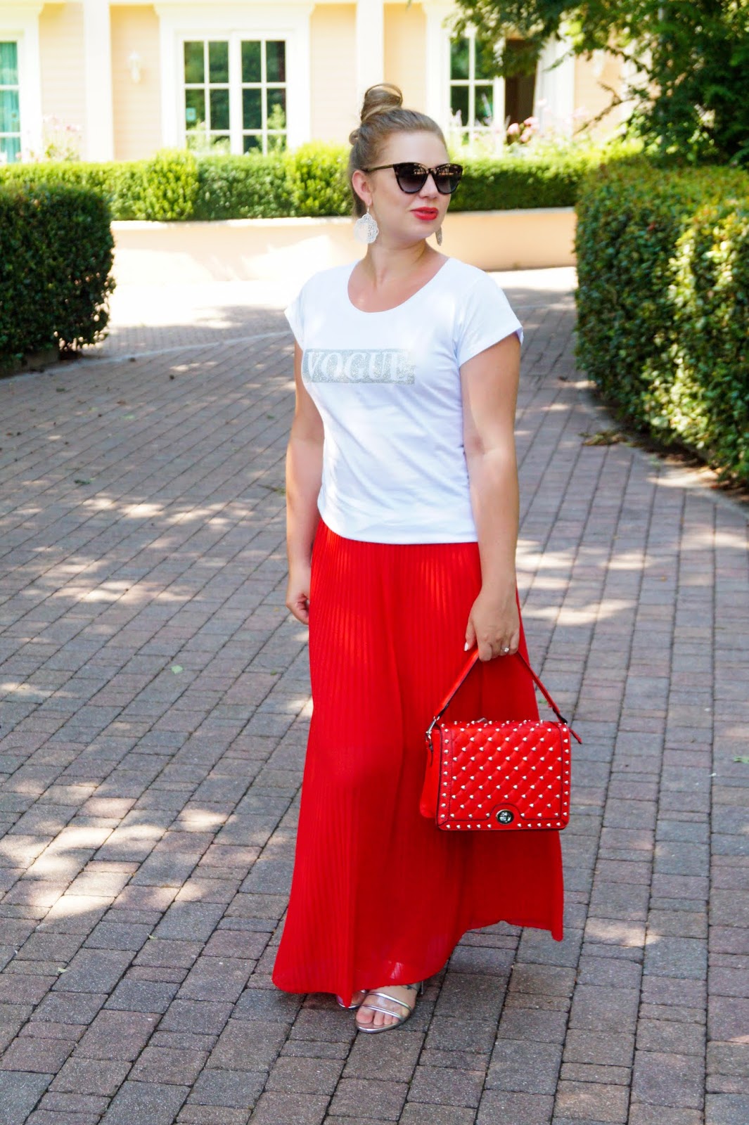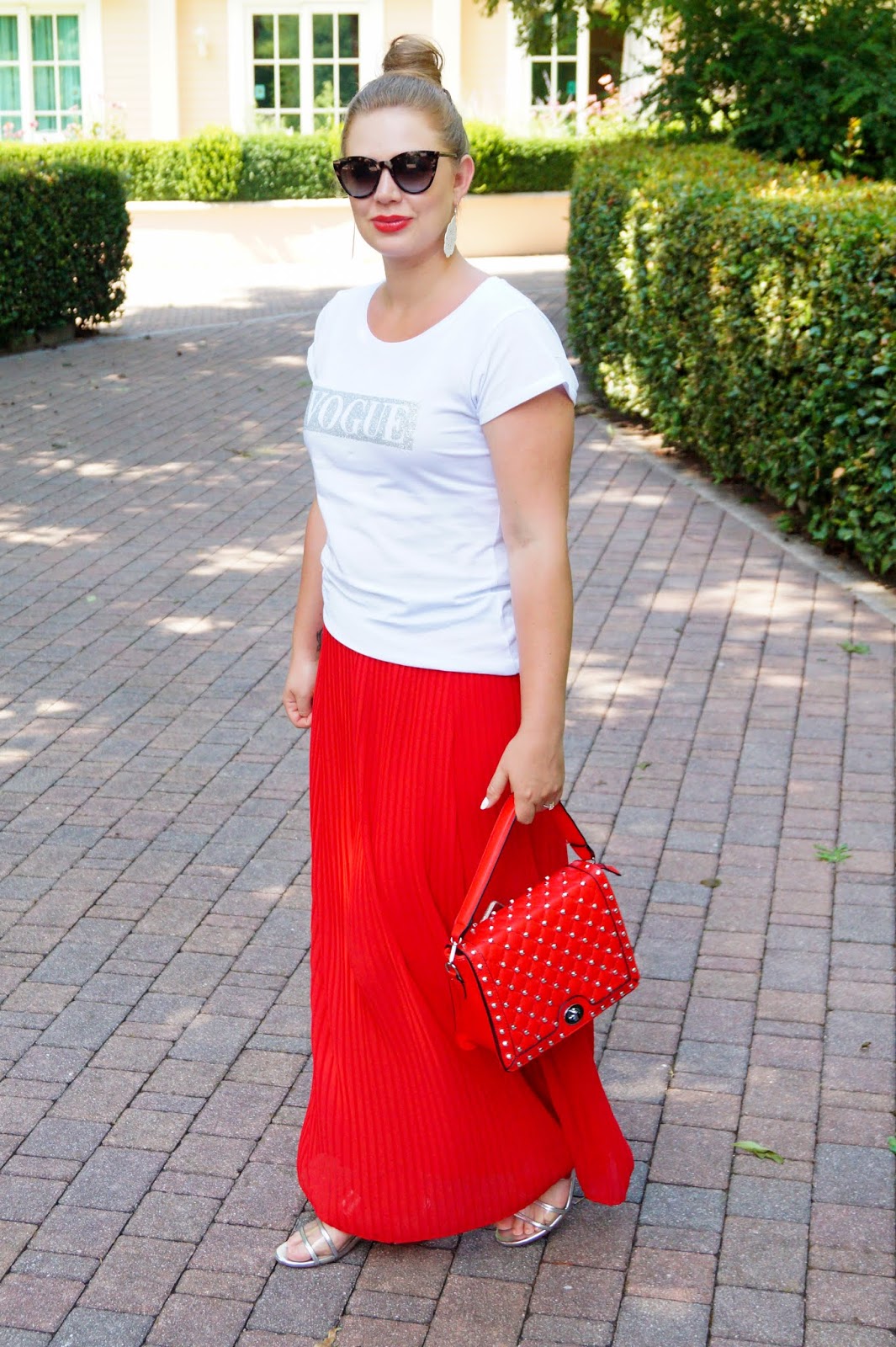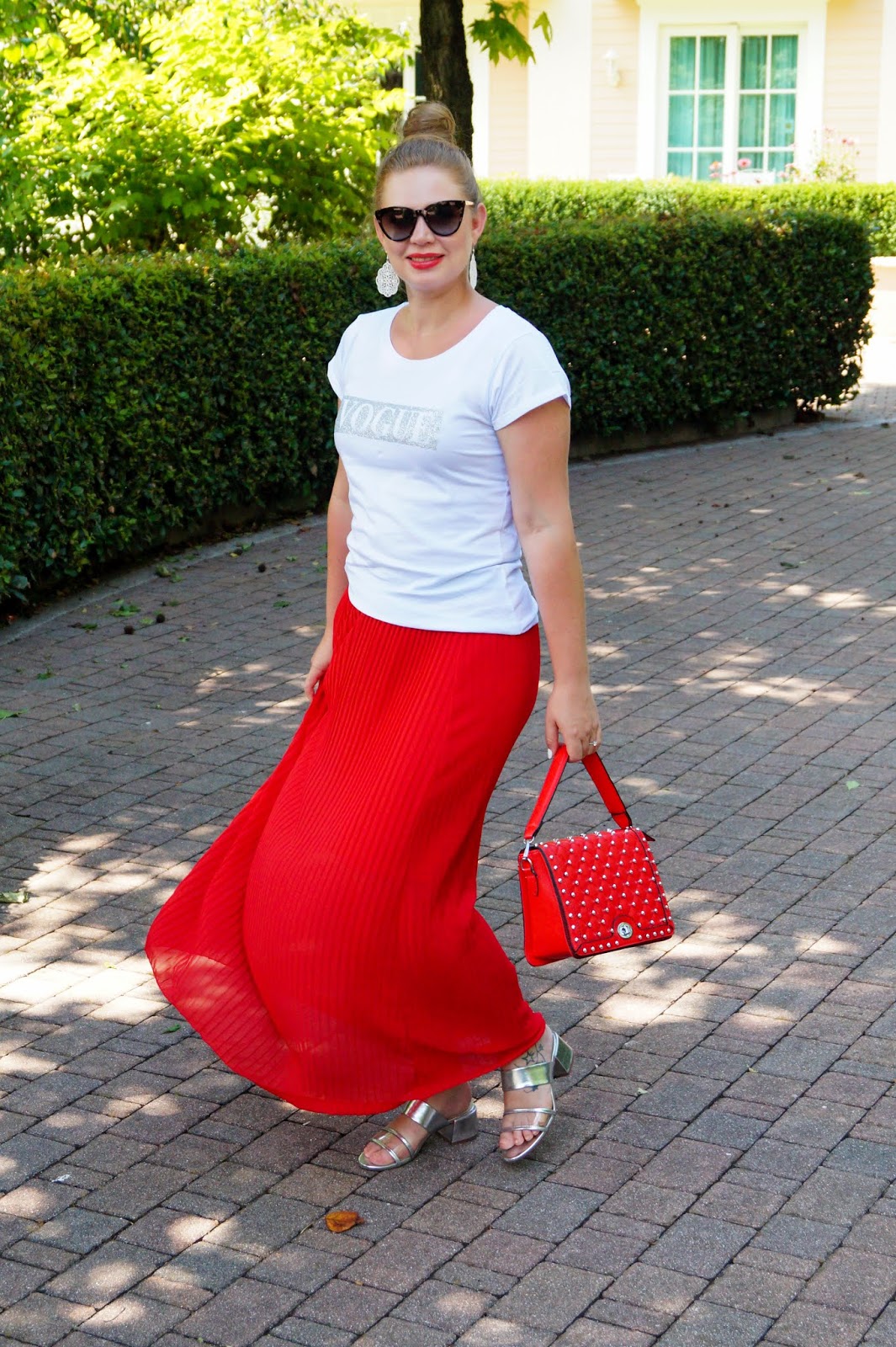 similar Vogue t-shirt here other one here / red pleated skirt similar here and here / slides Zara similar here and here / red studded bag from a local shop similar here and here